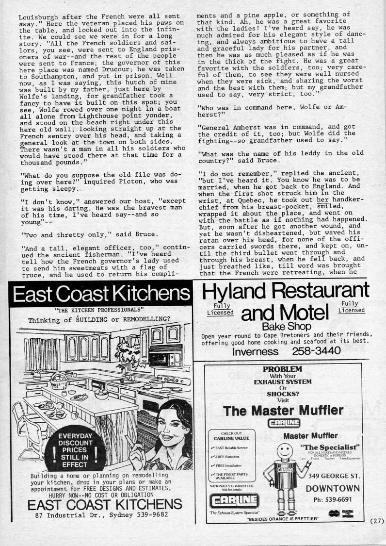 Published by Ronald Caplan on 1984/6/1 (264 reads)Louisburgh after the French were all sent away." Here the veteran placed his paws on the table, and looked out into the infin? ite. We could see we were in for a long story. "All the French soldiers and sai? lors, you see, were sent to England pris? oners of war--and the rest of the people were sent to France; the governor of this here place was named Drucour; he was taken to Southampton, and put in prison. Well now, as I was saying, this hutch of mine was built by my father, just here by Wolfe's landing, for grandfather took a fancy to have it built on this spot; you see, Wolfe rowed over one night in a boat all alone from Lighthouse point yonder, and stood on the beach right under this here old wall, looking straight up at the French sentry over his head, and taking a general look at the town on both sides. There wasn't a man in all his soldiers who would have stood there at that time for a thousand pounds." "What do you suppose the old file was do? ing over here?" inquired Picton, who was getting sleepy. "I don't know," answered our host, "except it was his daring. He was the bravest man of his time, I've heard say--and so young"-- "Two and thretty only," said Bruce. "And a tall, elegant officer, too," contin? ued the ancient fisherman. "I've heard tell how the French governor's lady used to send him sweetmeats with a flag of truce, and he used to return his compli- East Coast Kitchens "THE KITCHEN PROFESSIONALS" Thinking of BUILDING or REMODELLING? Building a home or planning on remodelling your kitchen, drop in your plans or make an appointment for FREE DESIGNS AND ESTIMATES. HURRY NOW • NO COST OR OBLIGATION EAST COAST KITCHENS 87 Industrial Dr., Sydney 539-9682 ments and a pine apple, or something of that kind. Ah, he was a great favorite with the ladies! I've heard say, he was much admired for his elegant style of danc? ing, and always ambitious to have a tall and graceful lady for his partner, and then he was as much pleased as if he was in the thick of the fight. He was a great favorite with the soldiers, too; very care? ful of them, to see they were well nursed when they were sick, and sharing the worst and the best with them; but my grandfather used to say, very strict, too." "Who was in command here, Wolfe or Am? herst?" "General Amherst was in command, and got the credit of it, too; but Wolfe did the fighting--so grandfather used to say." "What was the name of his leddy in the old country?" said Bruce. "I do not remember," replied the ancient, "but I've heard it. You know he was to be married, when he got back to England. And when the first shot struck him in the wrist, at Quebec, he took out her handker? chief from his breast-pocket, smiled, wrapped it about the place, and went on with the battle as if nothing had happened. But, soon after he got another wound, and yet he wasn't disheartened, but waved his ratan over his head, for none of the offi? cers carried swords there, and kept on, un? til the third bullet went through and through his breast, when he fell back, and just breathed like, till word was brought that the French were retreating, when he Hyland Restaurant Fully ' K M X. I ''"''y ''''' and ivlotel ''''' Bake Shop Open year round to Cape Bretoners and their friends, offering good home cooking and seafood at its best. Inverness 258-3440 PROBLEM With Your EXHAUST SYSTEM Or SHOCKS? Visit The Master Muffler |['ffl:l:lli;i') Master Muffler 1' FAST Reliable Service ' FREE InsIallaUon NATIONALLY GUARANTEED l'il' "The Exhaust System Speciali: The Specialist'' • ''R ALL MAKES AND MODELS DOMESTIC or FOREIGN 349 GEORGE ST. DOWNTOWN Ph: 539-6691 "BESIDES ORANGE IS PRETTIER" 1'' ''1 (27)