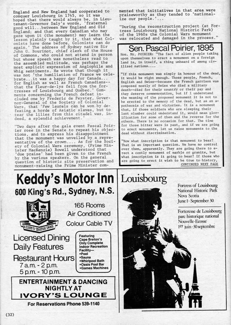 Published by Ronald Caplan on 1984/6/1 (259 reads)England and New England had cooperated to conquer Louisbourg in 1745, so it was hoped that there would always be, in Lieu? tenant-Governor Daly's words, 'fraternal good will...between New England and Old England; and that every Canadian who may gaze upon it (the monument) may learn the lesson plainly taught by it, that what Col? onists have done before. Colonists can do again.' The address of Sydney native Sir John G. Bourinot, chief clerk of the House of Commons, who could not attend in person but whose speech was nonetheless read to the assembled multitude, was perhaps the most explicit expression of Anglophile and Whig sentiments. He wrote that though it was not 'the humiliation of France we cele? brate. ..it was a happy day for Canada.,. for English as well as French Canadians-- that the fleur-de-lys fell from the for? tresses of Louisbourg and Quebec' Com? ments concerning the French defeat in? cluded one by Frederic de Peyster, Gover? nor-General of the Society of Colonial Wars, that 'Few laurels can be won by de? feating a horde of Asiatic slaves, but to tear the lilies from this citadel was, in? deed, a splendid achievement.' "Two days after the gala event Pascal Poir? ier rose in the Senate to repeat his objec? tions, and to express his disappointment that the monument was unveiled by a repre? sentative of the crown.... As for the Soci? ety of Colonial Wars ceremony, (Prime Min? ister MacKenzie) Bowell understood that 'due praise' had been given to the French by the various speakers. On the general question of historic site preservation and monument-raising the Prime Minister com? mented that initiatives in that area were praiseworthy as they tended to 'national? ize our people.'... "During the reconstruction project (at For? tress Louisbourg National Historic Park) of the 1960s the Colonial Wars monument was relocated and damaged in the process." Sen. Pascal Poirier, 1895 Hon. Mr. POIRIER: "The fact of alien people taking upon themselves to erect a monument on a foreign land is, in itself, a thing unheard of among civ? ilized nations.... "If this monument was simply in honour of the dead, it would be right enough. Those people, French, English and Swiss • because the French garrison was composed mostly of Swiss who died a military death • died for their country or their pay and they deserve commemoration, but if I understand the meaning of the proposed monument it is not to be erected to the memory of the dead, but as an a- potheosis of war and victories. It is a monument that, if those soldiers who are sleeping their last slumber could understand it, would mean glor? ification for some of them and the reverse for the others. There is no occasion for that. The time for those bitter wars is past, and if we are going to erect monuments, let us raise monuments to the dead without discrimination. "Now what inscription is that monument to bear? That is an important question. We have no control over them, apparently. They are going there to e- rect a costly monument of marble or granite, but what inscription is it going to bear? If those who are going to erect it wish to be true to history, 'mi'mmmi''m' CONTINUED NEXT PAGE Keddy's Motor Inn 600 King's Rd., Sydney, N.S. Licensed Dining Daily Features Restaurant Hours 7 a.m.-2 p.m. 5 p.m.-10 p.m. 165 Rooms Air Conditioned Colour Cable TV Featuring Cape Breton's Only Complete Indoor Recreation Facility • • Pool • Sauna • Whirlpool Bath • Oasis Pool Bar • Games Machines ENTERTAINMENT & DANCING NIGHTLY AT IVORY'S LOUNGE For Reservations Phone 539-1140 (32) Louisbourg Fortress of Louisbourg National Historic Park Nova Scotia June 1 - September 30 Forteresse de Louisbourg pare historique national Nouvelle-Ecosse 1'' juin-30septembre