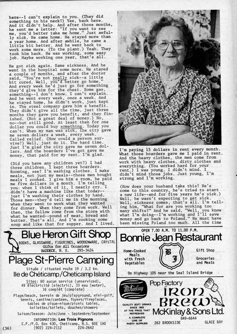 Published by Ronald Caplan on 1984/6/1 (293 reads)here • I can't explain to you. (They did something to his neck?) Yes, back here. And it didn't help. And after those months, he sent me a letter: "If you want to see me, you'd better take me home." Just awful? ly sick. He came home. He stayed more than a year home. And after awhile, he came a little bit better. And he went back to work some more. (To the plant.) Yeah. They took him back. He was working, some easy job. Maybe working one year, that's all. He got sick again. Same sickness. And he went in the hospital some more. He stayed a couple of months, and after the doctor said, "You're not really sick--a little bit cured. Well, you'd better go home." And every week he'd just go for something they'd give him for the chest. Some gas, something--I don't know. I can't explain. And he went every week, once a week. And he stayed home, he didn't work, just kept in. The steel company gave him a benefit. They didn't give all the time, just three months they gave you benefit, and they fin? ished. (Not a great deal of money.) No, no--but still good. At least then for one dollar you could buy something. Today you can't. When my man was sick, the city gave me seven dollars a week, every week. Called relief. (How could a person sur? vive?) Well, just do it • The hard time. Just I'm glad the city gave me seven dol? lars. And the boarders I've got gave me money, that paid for my rent. I'm glad. (Did you have any children yet?) I had three children. I kept three boarders. Rooming, see? I'm washing clothes. I make meals, not just my meals--those men bought meals I cooked. I give him a room, he paid me five dollars in a month. I'm telling you: when I think of it, I nearly cry. I didn't have a machine like that today-- just I'm washing their clothes by hand. Those men--they'd tell me in the morning when they went to work what they wanted for dinner. When they come from work. Well then, the fellow come from the store with what he wanted--pound of meat, bread and butter. That's all. And I'm cooking some soup and like that for supper. And I lived. I'm paying 15 dollars in rent every month. What those boarders gave me I paid in rent. And the heavy clothes, the men come from work with heavy clothes, dirty clothes and everything. (You worked hard for your rent.) I was young. I didn't mind. I didn't mind those jobs. Just young, I'm strong and I'm working. (How does your husband take this? He's come to this country, he's tried to start a new life--and for five years he's sick.) Well, he wasn't expecting to get sick. Well, sickness comes, that's all. I'm tell? ing him, "What for are you working too many shifts?" And he said, "Well, you know what I'm doing--I'm working and I'll save money and go back to Poland." He must have been missing Poland too much. All the time TL Blue Heron Gift Shop VyBOOKS, GLASSWARE, FIGURINES, WOODENWARE. CRYSTAL 'Vi Gifts for All Occasions 'iJl, BADDECK, N. S. 295-3424 Plage St-Pierre Camping Situee / situated route 19 / 3.2 km. He de Cheticamp/Cheticamp Island Sites: 60 aucun service (unserviced), 49 electricite (electric), 33 eau (water), 16 complet (complete) Plage/beach, terrain de jeu/playground, mini-golf, tennis, cantine/canteen, foyers/fireplaces, tables de pique-nique/picnic tables, toilettes/toilets, douches/showers (36) Saison/Season: Juin/June - Septembre/September INFORMATION: Les Trois Pignons C.P./P.O. Box 430, Cheticamp, N.S. BOE IHO (902) 224-2112 224-2642 OPEN 7.00 A.M. TO 11.00 P.M. Bomie Jean Restaurant Home-Cooked Meals with Fresh Vegetables Gift Shop Groceries and Meats On Highway 105 near the Seal Island Bridge QUALITY SOFT DRINKS SINCE 1905 AT THE PRICE THAT REFRESHES Pop Factory I Ron McKinlay&SonsLtd.; A COMPLETE partTsuppues 262 BROOKS IDE 849-6644 GLACE BAY