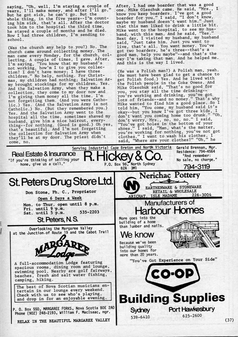 Published by Ronald Caplan on 1984/6/1 (240 reads)saying, "Oh, well, I'm staying a couple of years, I'll make money, and after I'll go." But he got sick, he can't go. But the whole thing, in the five years--I'm count? ing him sick, that's all. After the doctor took him to the hospital the third time, he stayed a couple of months and he died. Now I had three children, I'm sending to school. (Was the church any help to you?) No. The church came around collecting money. The man came every Monday, for the church, col? lecting. A couple of times, I gave. After, I'm saying, "You know that my husband's not working, how'm I to give you collec? tion? I don't have money; I have three children." No help, nothing. For Christ? mas, my children had nothing; Salvation Ar? my brought stockings for my children. Yes. And the Salvation Army, when they make a collection, they come to my door now and I'm giving them money all the time. I'm not forgetting them, (And you were Catho? lic.) Yes. (And the Salvation Army is not Catholic.) No. (But they remembered you.) Yes. And the Salvation Army went to the hospital all the time, sometimes shaved my husband, give him a nice haircut, every? thing- -for nothing. (Good is good.) Oh yes, that's beautiful. And I'm not forgetting the collection for Salvation Army when they'll be at my door. The priest didn't come, no. After, I had one boarder that was a good one. Mike Oleschuk came. He said, "Mrs., I know you keep boarders. I've got a good boarder for you." I said, "I don't know, maybe my husband doesn't want him." Just that this man liked to drink a little bit. Mike went to the hospital, to see my hus? band, with this man. And he said, "Yes." Next day, I visited my husband, my husband said, "Just take him. Just you want to live, that's all. You want money. You've got two boarders, he's three--that's a good man, help you maybe"--and that's the way I'm taking that man. And he helped me. And this is the way I lived. (He was a Polish man?) A Polish man, yeah. (He must have been glad to get a chance to get Polish food.) Yes. And he lived with the Polish people in the Coke Ovens. And Mike Oleschuk said, "That's no good for you, you stay all the time drinking-- you're working and drinking, you've got lots of friends--and no money." That's why Mike wanted to find him a good place. So I told him, "You come, my husband said it's okay--but you know I've got three kids, I don't want you coming home too drunk." "Oh, don't worry, Mrs., no, no, no." I said, "You've got holes in the bottom of your shoes." I said, "Man, what's the matter, you're working for nothing, you've not got clothes." I want to wash his clothes. I said, "Where are your clothes?" "Oh," he Serving Industrial Cape Breton and North Victoria Real Estate & Insurance ~~ "If you're thinking of selling your home, give us a call." * p'O. Box Qe.'North Sydney B2A 3M1 R.Hick'&Co.; Gerald Brennan, Mgr. Residence: 794-4564 "And remember: No sale, no charge." 794-3119 St. Peters Drug Store Ltd Uon Stone, Ph. C. Open 6 Days i Proprietor Week Mon. Fri. Sat. to Thur. open until 8 p.m. until 9 p.m. until 5 p.m. 535-2203 St Peters, MS. Overlooking the Margaree Valley at the Junction.of Route 19 and the Cabot Trail A full-accommodation Lodge featuring spacious rooms, dining room and lounge, swimming pool. Nearby are golf fairways, beaches, fresh and salt water fishing, camping, hiking. The best of Nova Scotian musicians en? tertain in our lounge every weekend. Check with us to see who's playing, and drop in for an enjoyable evening. P. 0. Box 550, MA-RGAREE FORKS. Nova Scotia BOE 2A0 Phone (902) 248-2193, William F. Maclsaac, mgr. RELAX IN THE BEAUTIFUL MARGAREE VALLEY '1.' Nerichac Pottery ''f EARTHENWARE & STONEWARE >''': RETAIL fie WHOLESALE ARICHAT. ISLE MADAME 226-3004 Manufacturers of Harbour Homes More goes into the building of a home than lumber and nails. We know Because we've been building quality into our homes for more than 20 years. "You've Got Experience on Your Side" 'CO-OP' Building Supplies Sydney Port HaRwkesbury 539-6410 625-2600 (37)