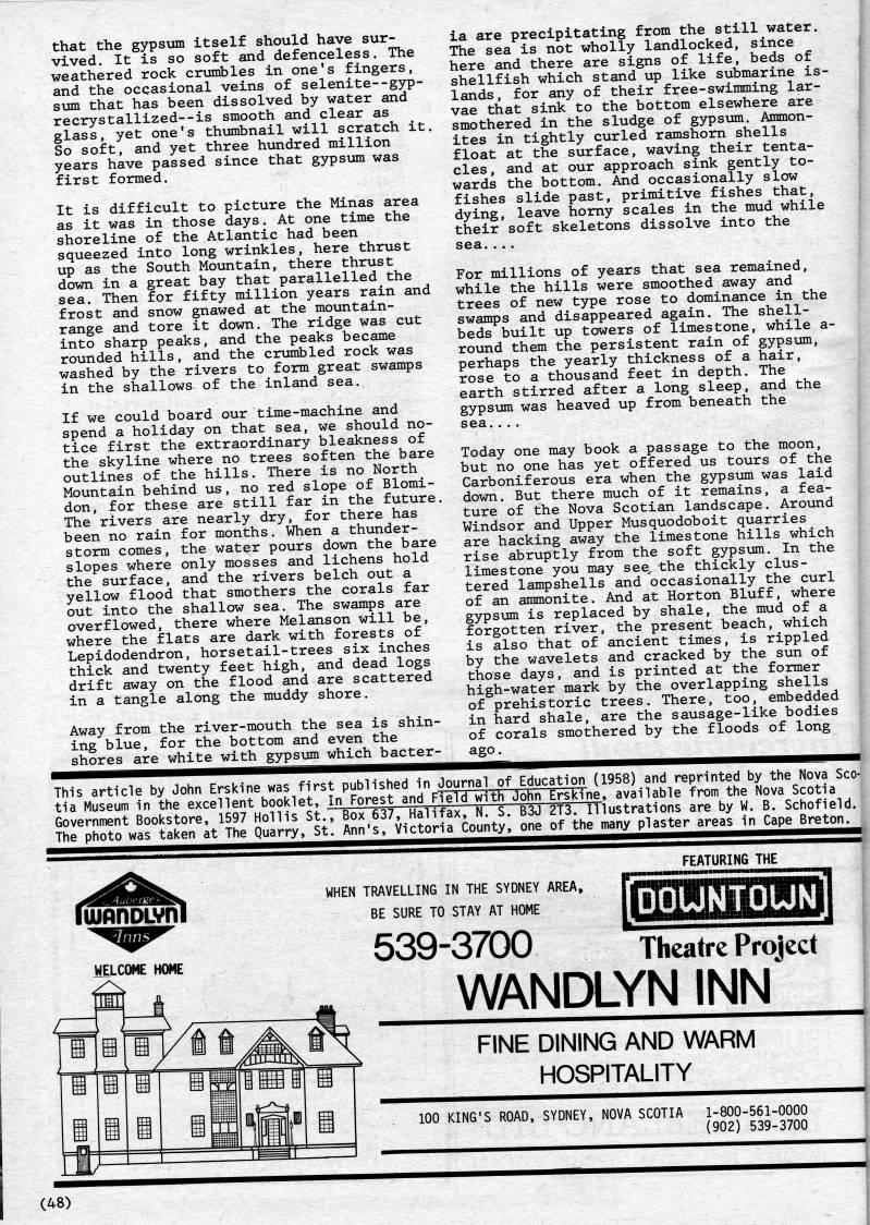 Published by Ronald Caplan on 1984/6/1 (251 reads)that the gypsum itself should have sur? vived. It is so soft and defenceless. The weathered rock crumbles in one's fingers, and the occasional veins of selenite--gyp? sum that has been dissolved by water and recrystallized--is smooth and clear as glass, yet one's thumbnail will scratch it. So soft, and yet three hundred million years have passed since that gypsum was first formed. It is difficult to picture the Minas area as it was in those days. At one time the shoreline of the Atlantic had been squeezed into long wrinkles, here thrust up as the South Mountain, there thrust down in a great bay that parallelled the sea. Then for fifty million years rain and frost and snow gnawed at the mountain- range and tore it down. The ridge was cut into sharp peaks, and the peaks became rounded hills, and the crumbled rock was washed by the rivers to form great swamps in the shallows of the inland sea. If we could board our time-machine and spend a holiday on that sea, we should no? tice first the extraordinary bleakness of the skyline where no trees soften the bare outlines of the hills. There is no North Mountain behind us, no red slope of Blomi- don, for these are still far in the future. The rivers are nearly dry, for there has been no rain for months. When a thunder? storm comes, the water pours down the bare slopes where only mosses and lichens hold the surface, and the rivers belch out a yellow flood that smothers the corals far out into the shallow sea. The swamps are overflowed, there where Melanson will be, where the flats are dark with forests of Lepidodendron, horsetail-trees six inches thick and twenty feet high, and dead logs drift away on the flood and are scattered in a tangle along the muddy shore. Away from the river-mouth the sea is shin? ing blue, for the bottom and even the shores are white with gypsum which bacter? ia are precipitating from the still water. The sea is not wholly landlocked, since here and there are signs of life, beds of shellfish which stand up like submarine is? lands, for any of their free-swimming lar? vae that sink to the bottom elsewhere are smothered in the sludge of gypsum. Ammon? ites in tightly curled ramshom shells float at the surface, waving their tenta? cles , and at our approach sink gently to? wards the bottom. And occasionally slow fishes slide past, primitive fishes that, dying, leave homy scales in the mud while their soft skeletons dissolve into the sea.... For millions of years that sea remained, while the hills were smoothed away and trees of new type rose to dominance in the swamps and disappeared again. The shell- beds built up towers of limestone, while a- round them the persistent rain of gypsum, perhaps the yearly thickness of a hair, rose to a thousand feet in depth. The earth stirred after a long sleep, and the gypsum was heaved up from beneath the sea.... Today one may book a passage to the moon, but no one has yet offered us tours of the Carboniferous era when the gypsim was laid down. But there much of it remains, a fea? ture of the Nova Scotian landscape. Around Windsor and Upper Musquodoboit quarries are hacking away the limestone hills which rise abruptly from the soft gypsum. In the limestone you may see. the thickly clus? tered lampshells and occasionally the curl of an ammonite. And at Horton Bluff, where gypsum is replaced by shale, the mud of a forgotten river, the present beach, which is also that of ancient times, is rippled by the wavelets and cracked by the sun of those days, and is printed at the former high-water mark by the overlapping shells of prehistoric trees. There, too, embedded in hard shale, are the sausage-like bodies of corals smothered by the floods of long ago. This article by John Erskine was first published in Journal of Education (1958) and reprinted by the Nova Sco? tia Museum in the excellent booklet. In Forest and Field with John Erskine, available from the Nova Scotia Government Bookstore, 1597 Hollis St., Box 637, Halifax, N. S. B3J 2T3. Illustrations are by W. B. Schofield.'' The photo was taken at The Quarry, St. Ann's, Victoria County, one of the many plaster areas in Cape Breton. ' FEATURING THE WHEN TRAVELLING IN THE SYDNEY AREA, BE SURE TO STAY AT HOME fdlNlOUN 539-3700 Theatre Project WANDLYN INN FINE DINING AND WARM HOSPITALITY 100 KING'S ROAD, SYDNEY, NOVA SCOTIA 1-800-561-0000 (902) 539-3700 (48)