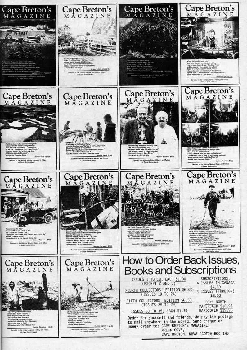 Published by Ronald Caplan on 1984/6/1 (159 reads)Cape Breton's MAGAZINE Cape Breton's M A GAZINE Cape Breton's MAGAZINE CapeBreton's MAGAZINE mw-m':. '-y''''::''. ' Cape Bretons , M A G A Z I N E Cape Breton's MAGAZINE Cape Breton's MAGAZINE CapeBreton's MAGAZINE Cape Breton's MAG A Z I N E Cape Breton's , MAGAZINE "'Wi&S;'' Cape Breton s MAGAZINE ith Capt George Dotomont Cape Breton's MAGAZINE Cape Breton's MAGAZINE How to Order Back Issues, Books and Subscriptions ISSUES 1 TO 18, EACH $1.00 (EXCEPT 2 AND 5) FOURTH COLLECTORS' EDITION $6.00 (ISSUES 19 TO 24) FIFTH COLLECTORS' EDITION $6.50 (ISSUES 25 TO 29) ISSUES 30 TO 35, EACH $1.75 SUBSCRIPTIONS: 4 ISSUES IN CANADA $7.00 4 ISSUETTFOREIGN) $8.00 DOWN NORTH PAPERBACK $12.95 HARDCOVER $19.95 Order for yourself and friends. We pay the postage to mail anywhere in the world. Send cheque or money order to: CAPE BRETON'S MAGAZINE, WRECK COVE, CAPE BRETON, NOVA SCOTIA BOC IHO