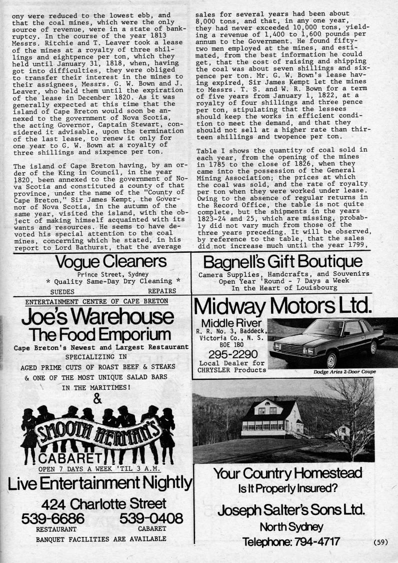 Published by Ronald Caplan on 1984/6/1 (156 reads)ony were reduced to the lowest ebb, and that the coal mines, which were the only source of revenue, were in a state of bank? ruptcy. In the course of the year 1813 Messrs. Ritchie and T. Leaver took a lease of the mines at a royalty of three shil? lings and eightpence per ton, which they held until January 31, 1818, when, having got into difficulties, they were obliged to transfer their interest in the mines to their assignees, Messrs. G. W. Bown and J. Leaver, who held them until the expiration of the lease in December 1820. As it was generally expected at this time that the island of Cape Breton would soon be an? nexed to the government of Nova Scotia, the acting Governor, Captain Stewart, con? sidered it advisable, upon the termination of the last lease, to renew it only for one year to G. W. Bown at a royalty of three shillings and sixpence per ton. The island of Cape Breton having, by an or? der of the King in Council, in the year 1820, been annexed to the government of No? va Scotia and constituted a county of that province, under the name of the "County of Cape Breton," Sir James Kempt, the Gover? nor of Nova Scotia, in the autuirai of the same year, visited the island, with the ob? ject of making himself acquainted with its wants and resources. He seems to have de? voted his special attention to the coal mines, concerning which he stated, in his report to Lord Bathurst, that the average sales for several years had been about 8,000 tons, and that, in any one year, they had never exceeded 10,000 tons, yield? ing a revenue of 1,400 to 1,600 pounds per annum to the Government. He found fifty- two men employed at the mines, and esti? mated, from the best information he could get, that the cost of raising and shipping the coal was about seven shillings and six? pence per ton. Mr. G. W. Bown's lease hav? ing expired. Sir James Kempt let the mines to Messrs. T. S. and W. R. Bown for a term of five years from January 1, 1822, at a royalty of four shillings and three pence per ton, stipulating that the lessees should keep the works in efficient condi? tion to meet the demand, and that they should not sell at a higher rate than thir? teen shillings and twopence per ton. Table I shows the quantity of coal sold in each year, from the opening of the mines in 1785 to the close of 1826, when they came into the possession of the General Mining Association; the prices at which the coal was sold, and the rate of royalty per ton when they were worked under lease. Owing to the absence of regular returns in the Record Office, the table is not quite complete, but the shipments in the years 1823-24 and 25, v'hich are missing, probab? ly did not vary much from those of the three years preceding. It will be observed, by reference to the table, that the sales did not increase much until the year 1799, Vogue Cleaners Prince Street, Sydney * Quality Same-Day Dry Cleaning * SUEDES REPAIRS Bagnell's Gift Boutique Camera Supplies, Handcrafts, and Souvenirs Open Year 'Round - 7 Days a Week In the Heart of Louisbourg ENTERTAINMENT CENTRE OF CAPE BRETON Joe's Vfeirehouse The Food Emporium Cape Breton's Newest and Largest Restaurant SPECIALIZING IN AGED PRIME CUTS OF ROAST BEEF & STEAKS & ONE OF THE MOST UNIQUE SALAD BARS IN THE MARITIMESl Midway Motors Ltd. Middle River R. R. No. 3, Baddeck, Victoria Co., N. S. BOE IBO 295-2290 Local Dealer for CHRYSLER Products Dodge Aries 2-Door Coupe 1CABARET OPEN 7 DAYS A WEEK 'TIL 3 A.M Live Entertainment Nightly| 424 Charlotte Street 539-6686 539-0408 RESTAURANT CABARET BANQUET FACILITIES ARE AVAILABLE Ycxjr Ccxntry Homestead Is It Properly Insured? Joseph Salter's Sons Ltd North Sydney Telephone: 794-4717 (59)
