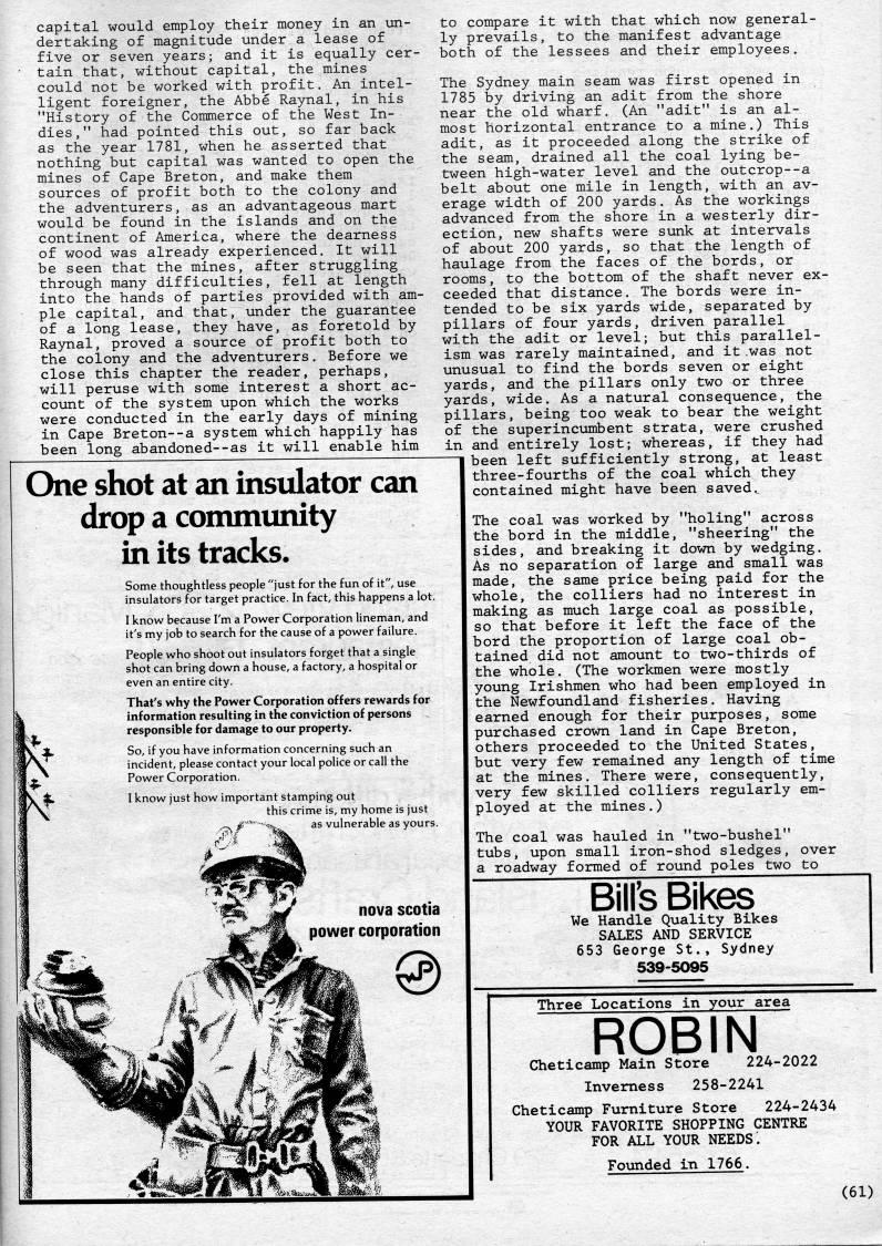 Published by Ronald Caplan on 1984/6/1 (189 reads)capital would employ their money in an un? dertaking of magnitude under a lease of five or seven years; and it is equally cer? tain that, without capital, the mines could not be worked with profit. An intel? ligent foreigner, the Abbe Raynal, in his "History of the Commerce of the West In? dies , " had pointed this out, so far back as the year 1781, when he asserted that nothing but capital was wanted to open the mines of Cape Breton, and make them sources of profit both to the colony and the adventurers, as an advantageous mart would be found in the islands and on the continent of America, where the dearness of wood was already experienced. It will be seen that the mines, after struggling through many difficulties, fell at length into the hands of parties provided with am? ple capital, and that, under the guarantee of a long lease, they have, as foretold by Ra37nal, proved a source of profit both to the colony and the adventurers. Before we close this chapter the reader, perhaps, will peruse with some interest a short ac? count of the system upon which the works were conducted in the early days of mining in Cape Breton--a system which happily has been long abandoned--as it will enable him One shot at an instilator can drop a community in its tracks. Some thoughtless people "just for the fun of it", use insulators for target practice. In fact, this happens a lot. I know because I'm a Power Corporation lineman, and it's my job to search for the cause of a power failure. People who shoot out insulators forget that a single shot can bring down a house, a factory, a hospital or even an entire city. That's why the Power Corporation offers rewards for information resulting in the conviction of persons responsible for damage to our property. So, if you have information concerning such an incident, please contact your local police or call the Power Corporation. I know just how important stamping out this crime is, my home is just -.' |J; " V, as vulnerable as yours. nova scotia power corporation to compare it with that which now general? ly prevails, to the manifest advantage both of the lessees and their employees. The Sydney main seam was first opened in 1785 by driving an adit from the shore near the old wharf. (An "adit" is an al? most horizontal entrance to a mine.) This adit, as it proceeded along the strike of the seam, drained all the coal lying be? tween high-water level and the outcrop--a belt about one mile in length, with an av? erage width of 200 yards. As the workings advanced from the shore in a westerly dir? ection, new shafts were sunk at intervals of about 200 yards, so that the length of haulage from the faces of the bords, or rooms, to the bottom of the shaft never ex? ceeded that distance. The bords were in? tended to be six yards wide, separated by pillars of four yards, driven parallel with the adit or level; but this parallel? ism was rarely maintained, and it .was not unusual to find the bords seven or eight yards, and the pillars only two or three yards, wide. As a natural consequence, the pillars, being too weak to bear the weight of the superincumbent strata, were crushed in and entirely lost; whereas, if they had I been left sufficiently strong, at least three-fourths of the coal which they contained might have been saved.' The coal was worked by "holing" across the bord in the middle, "sheering" the sides, and breaking it down by wedging. As no separation of large and small was made, the same price being paid for the whole, the colliers had no interest in making as much large coal as possible, so that before it left the face of the bord the proportion of large coal ob? tained did not amount to two-thirds of the whole. (The workmen were mostly young Irishmen who had been employed in the Newfoundland fisheries. Having earned enough for their purposes, some purchased crown land in Cape Breton, others proceeded to the United States, but very few remained any length of time at the mines. There were, consequently, very few skilled colliers regularly em? ployed at the mines.) The coal was hauled in "two-bushel" tubs, upon small iron-shod sledges, over a roadway formed of round poles two to Bill's Bikes We Handle Quality Bikes SALES AND SERVICE 653 George St., Sydney 539-5095 Three Locations in your area ROBIN Cheticamp Main Store 224-2022 Inverness 258-2241 Cheticamp Furniture Store 224-2434 YOUR FAVORITE SHOPPING CENTRE FOR ALL YOUR NEEDS. Founded in 1766. (61)