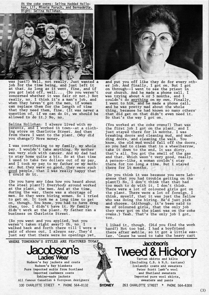 Published by Ronald Caplan on 1984/8/1 (473 reads)At the coke ovens: Selina Haddad Hollo- han, Lil, Minme Paruch, and Bernadette. Right: Selina Hollohan. was just?) Well, not really. Just wanted a job for the time being, and just left it at that. As long as it went, fine, and if you got laid off, well.... (So you weren't concerned whether it was fair or not.) Not really, no. I think it's a man's job, and when they haven't got the men, if women can replace them for the length of time that they need them, fine. (It was never a question of, if we can do it, we should be allowed to do it.) No, no. Selina Hollohan I always lived with my I worked in town--at a cloth- And then parents, and ing store on Charlotte Street, from there I went to the plant. (Why did you change?) More money. I was contributing to my family, my whole pay. I wouldn't take anything. My mother was very sick with cancer. And my dad had to stay home quite a bit. So at that time I used to take two dollars out of my pay, and I took my pay to my father or my moth? er. But they were so good, they were such good people, that I was really happy that I could do it. (Do you have any idea how you heard about the steel plant?) Everybody around worked at the plant, the men. And at the time, during the war, there was a shortage of men. So they were hiring women. So I tried to get on. It took me a long time to get on, though. You know, you had to have drag then, too. I didn't have it. My family didn't work at the plant. My father ran a business on Charlotte Street. (So you went and you applied,"but you weren't taken right away?) Oh, no. I walked back and forth there till I wore a pair of shoes out, I always say. They'd just say that there were no openings yet. and put you off like they do for every oth? er job. And finally, I got on. But I got on through--I went to see the priest in our church. And he made a phone call. I was trying about 4 or 5 months, and I couldn't do anything on my own. Finally, I went to him, and ne made a phone call, and he was pretty mad about the whole thing, because he had known so many others' that did get on that didn't even need it. So that's the way I got on. (You worked at the coke ovens?) That was the first job I got on the plant, and I just stayed there for 14 months. I was breaking doors and cleaning mud, and mud- ding doors, and cleaning the walk. You know, the old mud would fall off the doors, so you had to clean that in a wheelbarrow, take it down to the end. It was dirty, that's all. You got the smell of the gas and that. Which wasn't very good, really. A person--like, a woman couldn't stay there for too long a time. But I stayed there for 14 months. (Do you think it was because you were Leb? anese that you had trouble getting on the plant?) No, I don't think that that had too much to do with it. I don't think. There were a lot of coloured girls got on the plant. There were a lot of foreign. I think, myself, that it was just the fellow who was doing the hiring. He'd just pick and choose. (Although, it's been said to me of coloured girls, that the only job they ever got on the plant was on the coke ovens.) Yeah. That's the only job I got, too. I liked it, though. (Did you find the work hard?) Not too bad. I had a boyfriend there after awhile, so it got a little eas? ier. 'Cause he used to take the heavy cart WHERE TOMORROW'S STYLES ARE FEATURED TODA' Jacobson's Ladies'Wear Hudson's Bay jackets and coats Hudson's Bay blankets Pure imported suits from Scotland Imported cashmere coats Eskimo-made jackets All famous Canadian & European designers 330 CHARLOTTE STREET * PHONE 564-8132 SYDNEY Jscobson's T>AAeed & Hictory Tartan skirts and kilts (including C.B. & N.S. tartans) Icelandic coats and sweaters Peter Scott lamb's wool and Shetland sweaters Imported pure wool skirts, sweaters and pants 263 CHARLOTTE STREET * PHONE 564-6308 (3)