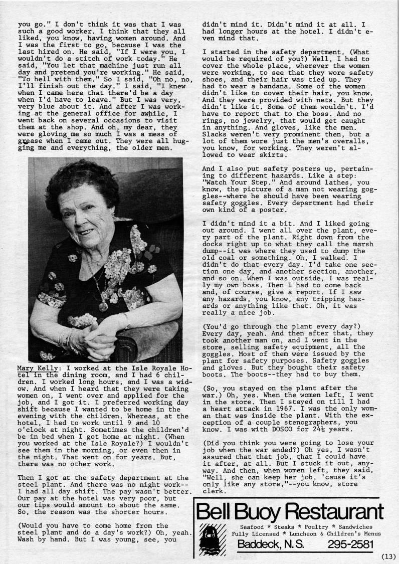 Published by Ronald Caplan on 1984/8/1 (302 reads)you go." I don't think it was that I was such a good worker. I think that they all liked, you know, having women around. And I was the first to go, because I was the last hired on. He said, "If I were you, I wouldn't do a stitch of work today." He said, "You let that machine just run all day and pretend you're working." He said, "To hell with them." So I said, "Oh no, no, I'll finish out the day." I said, "I knew when I came here that there'd be a day when I'd have to leave." But I was very, very blue about it. And after I was work? ing at the general office for awhile, I went back on several occasions to visit them at the shop. And oh, my dear, they were gloving me so much I was a mess of gljpase when I came out. They were all hug? ging me and everything, the older men. Mary Kelly: I worked at the Isle Royale Ho- tel in the dining room, and I had 6 chil? dren. I worked long hours, and I was a wid? ow. And when I heard that they were taking women on, I went over and applied for the job, and I got it. I preferred working day shift because I wanted to be home in the evening with the children. Whereas, at the hotel, I had to work until 9 and 10 o'clock at night. Sometimes the children'd be in bed when I got home at night. (When you worked at the Isle Royale?) I wouldn't see them in the morning, or even then in the night. That went on for years. But, there was no other work. Then I got at the safety department at the steel plant. And there was no night work-- I had all day shift. The pay wasn't better. Our pay at the hotel was very poor, but our tips would amount to about the same. So, the reason was the shorter hours. (Would you have to come home from the steel plant and do a day's work?) Oh, yeah. Wash by hand. But I was young, see, you didn't mind it. Didn't mind it at all. I had longer hours at the hotel. I didn't e- ven mind that. I started in the safety department. (What would be required of you?) Well, I had to cover the whole place, wherever the women were working, to see that they wore safety shoes, and their hair was tied up. They had to wear a bandana. Some of the women didn't like to cover their hair, you know. And they were provided with nets. But they didn't like it. Some of them wouldn't. I'd have to report that to the boss. And no rings, no jewelry, that would get caught in anything. And gloves, like the men. Slacks weren't very prominent then, but a lot of them wore just the men's overalls, you know, for working. They weren't al? lowed to wear skirts. And I also put safety posters up, pertain? ing to different hazards. Like a step: "Watch Your Step." And around lathes, you know, the picture of a man not wearing gog? gles --where he should have been wearing safety goggles. Every department had their own kind of a poster. I didn't mind it a bit. And I liked going out around. I went all over the plant, eve? ry part of the plant. Right down from the docks right up to what they call the marsh dump--it was where they used to dump the old coal or something. Oh, I walked. I didn't do that every day. I'd take one sec? tion one day, and another section, another, and so on. 'n?ien I was outside, I was real? ly my own boss. Then I had to come back and, of course, give a report. If I saw any hazards, you know, any tripping haz? ards or anything like that. Oh, it was really a nice job. (You'd go through the plant every day?) Every day, yeah. And then after that, they took another man on, and I went in the store, selling safety equipment, all the goggles. Most of them were issued by the plant for safety purposes. Safety goggles and gloves. But they bought their safety boots. The boots--they had to buy them. (So, you stayed on the plant after the war.) Oh, yes. When the women left, I went in the store. Then I stayed on till I had a heart attack in 1967. I was the only wom? an that was inside the plant. With the ex? ception of a couple stenographers, you know. I was with DOSCO for 24% years. (Did you think you were going to lose your job when the war ended?) Oh yes, I wasn't assured that that job, that I could have it after, at all. But I stuck it out, any? way. And then, when women left, they said, "Well, she can keep her job, 'cause it's only like any store,"--you know, store clerk. Bell Buoy Ftestaurant Seafood * Steaks * Poultry * Sandwiches Fully Licensed * Luncheon & Children's Menus Baddeck, N.S. 295-2581 (13)