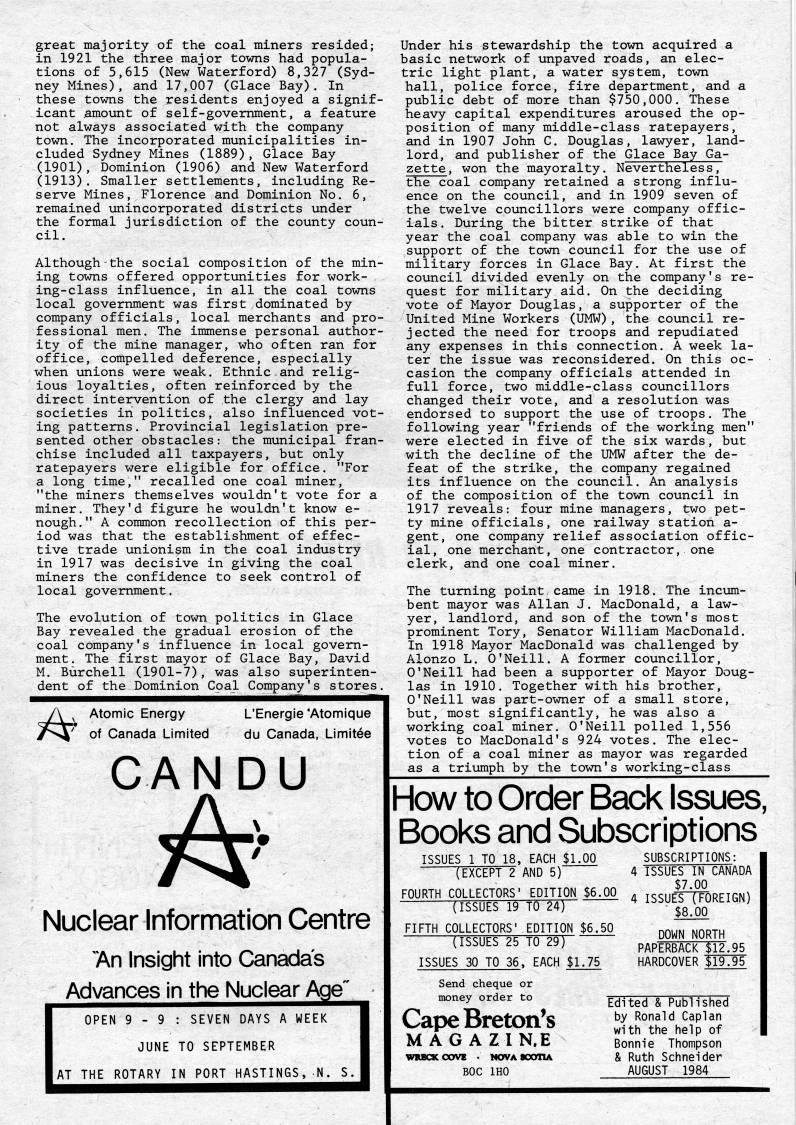 Published by Ronald Caplan on 1984/8/1 (324 reads)great majority of the coal miners resided; in 1921 the three major towns had popula? tions of 5,615 (New Waterford) 8,327 (Syd? ney Mines), and 17,007 (Glace Bay), In these towns the residents enjoyed a signif? icant amount of self-government, a feature not always associated with the company town. The incorporated municipalities in? cluded Sydney Mines (1889), Glace Bay (1901), Dominion (1906) and New Waterford (1913). Smaller settlements, including Re? serve Mines, Florence and Dominion No. 6, remained unincorporated districts under the formal jurisdiction of the county coun? cil. Although the social composition of the min? ing towns offered opportunities for work? ing-class influence, in all the coal towns local government was first dominated by company officials, local merchants and pro? fessional men. The immense personal author? ity of the mine manager, who often ran for office, compelled deference, especially when unions were weak. Ethnic and relig? ious loyalties, often reinforced by the direct intervention of the clergy and lay societies in politics, also influenced vot? ing patterns. Provincial legislation pre? sented other obstacles: the municipal fran? chise included all taxpayers, but only ratepayers were eligible for office, "For a long time," recalled one coal miner, "the miners themselves wouldn't vote for a miner. They'd figure he wouldn't know e- nough." A common recollection of this per? iod was that the establishment of effec? tive trade unionism in the coal industry in 1917 was decisive in giving the coal miners the confidence to seek control of local government. The evolution of town politics in Glace Bay revealed the gradual erosion of the coal company's influence in local govern? ment. The first mayor of Glace Bay, David M. Burchell (1901-7), was also superinten? dent of the Dominion Coal Company's stores. 7' Atomic Energy of Canada Limited L'Energie 'Atomique du Canada, Limitee CANDU Nuclear Information Centre An Insight into Canada's Advances in the Nuclear Age' OPEN 9 - 9 : SEVEN DAYS A WEEK JUNE TO SEPTEMBER AT THE ROTARY IN PORT HASTINGS, N. S. Under his stewardship the town acquired a basic network of unpaved roads, an elec? tric light plant, a water system, town hall, police force, fire department, and a public debt of more than $750,000. These heavy capital expenditures aroused the op? position of many middle-class ratepayers, and in 1907 John C. Douglas, lawyer, land? lord, and publisher of the Glace Bay Ga? zette, won the mayoralty. Nevertheless, the coal company retained a strong influ? ence on the council, and in 1909 seven of the twelve councillors were company offic? ials. During the bitter strike of that year the coal company was able to win the support of the town council for the use of military forces in Glace Bay. At first the council divided evenly on the company's re? quest for military aid. On the deciding vote of Mayor Douglas, a supporter of the United Mine Workers (UMW), the council re? jected the need for troops and repudiated any expenses in this connection. A week la? ter the issue was reconsidered. On this oc? casion the company officials attended in full force, two middle-class councillors changed their vote, and a resolution was endorsed to support the use of troops. The following year "friends of the working men" were elected in five of the six wards, but with the decline of the UMW after the de? feat of the strike, the company regained its influence on the council. An analysis of the composition of the town council in 1917 reveals: four mine managers, two pet? ty mine officials, one railway station a- gent, one company relief association offic? ial, one merchant, one contractor, one clerk, and one coal miner. The turning point came in 1918. The incum? bent mayor was Allan J. MacDonald, a law? yer, landlord, and son of the town's most prominent Tory, Senator William MacDonald. In 1918 Mayor MacDonald was challenged by Alonzo L. O'Neill, A former councillor, O'Neill had been a supporter of Mayor Doug? las in 1910. Together with his brother, O'Neill was part-owner of a small store, but, most significantly, he was also a working coal miner. O'Neill polled 1,556 votes to MacDonald's 924 votes. The elec? tion of a coal miner as mayor was regarded as a triumph by the town's working-class How to Order Back Issues, Books and Subscriptions ISSUES 1 TO 18. EACH $1.00 (EXCEPT 2 AND 5) FOURTH COLLECTORS' EDITION $6.00 (ISSUES 19 TO 24) FIFTH COLLECTORS' EDITION $6.50 (ISSUES 25 TO 29) ISSUES 30 TO 36, EACH $1,75 Send cheque or money order to CapeBreton's MAG AZIN.E SUBSCRIPTIONS: 4 ISSUES IN CANADA $7,00 4 issueTTforeign) " $8,00 DOWN NORTH PAPERBACK $12.95 HARDCOVER $19.95 CX>VE ?? MOVASOOTIA BOC IHO Edited & Published by Ronald Caplan with the help of Bonnie Thompson & Ruth Schneider AUGUST 1984