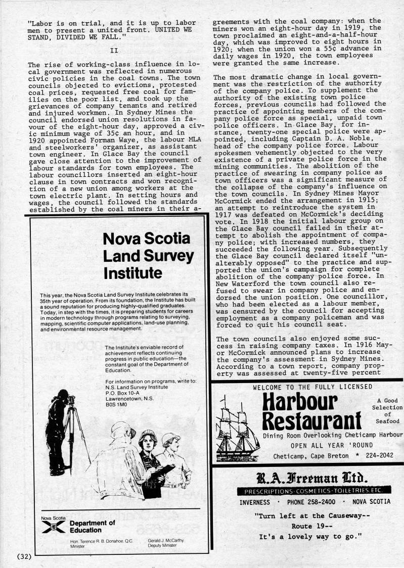 Published by Ronald Caplan on 1984/8/1 (298 reads)Labor is on trial, and it is up to labor men to present a united front. UNITED WE STAND, DIVIDED WE FALL. II The rise of working-class influence in lo? cal government was reflected in numerous civic policies in the coal towns. The town councils objected to evictions, protested coal prices, requested free coal for fam? ilies on the poor list, and took up the grievances of company tenants and retired and injured workmen. In Sydney Mines the council endorsed union resolutions in fa? vour of the eight-hour day, approved a civ? ic minimum wage of 35C an hour, and in 1920 appointed Forman Waye, the labour MLA and steelworkers' organizer, as assistant town engineer. In Glace Bay the council gave close attention to the improvement of labour standards for town employees. The labour councillors inserted an eight-hour clause in town contracts and won recogni? tion of a new union among workers at the town electric plant. In setting hours and wages, the council followed the standards established by the coal miners in their a- (32) Nova Scotia Land Survey Institute This year, the Nova Scotia Land Survey Institute celebrates its 35th year of operation. From its foundation, the Institute has built a sound reputation for producing highly-qualified graduates. Today, in step with the times, it is preparing students for careers in modern technology through programs relating to surveying, mapping, scientific computer applications, land-use planning, and environmental resource management. The Institute's enviable record of achievement reflects continuing progress in public education • the constant goal of the Department of Education. For Information on programs, write to: N.S. Land Survey Institute P.O.Box10-A Lawrencetown, N.S. BOS 1 MO Department of Education greements with the coal company: when the miners won an eight-hour day in 1919, the town proclaimed an eight-and-a-half-hour day, which was improved to eight hours in 1920; when the union won a 55c advance in daily wages in 1920, the town employees were granted the same increase. The most dramatic change in local govern? ment was the restriction of the authority of the company police. To supplement the authority of the existing town police forces, previous councils had followed the practice of appointing members of the com? pany police force as special, unpaid town police officers. In Glace Bay, for in? stance, twenty-one special police were ap? pointed, including Captain D. A. Noble, head of the company police force. Labour spokesmen vehemently objected to the very existence of a private police force in the mining communities. The abolition of the practice of swearing in company police as town officers was a significant measure of the collapse of the company's influence on the town councils, In Sydney Mines Mayor McCormick ended the arrangement in 1915; an attempt to reintroduce the system in 1917 was defeated on McCormick's deciding vote. In 1918 the initial labour group on the Glace Bay council failed in their at? tempt to abolish the appointment of compa? ny police; with increased numbers, they succeeded the following year. Subsequently the Glace Bay council declared itself "un? alterably opposed" to the practice and sup? ported the union's campaign for complete abolition of the company police force. In New Waterford the town council also re? fused to swear in company police and en? dorsed the union position. One councillor, who had been elected as a labour member, was censured by the council for accepting employment as a company policeman and was forced to quit his council seat. The town councils also enjoyed some suc? cess in raising company taxes. In 1916 May? or McCormick announced plans to increase the company's assessment in Sydney Mines, According to a town report, company prop? erty was assessed at twenty-five percent WELCOME TO THE FULLY LICENSED Harbour Restaurant A Good } Selections of : Seafood , Dining Room Overlooking Clreticamp Harbour' OPEN ALL YEAR 'ROUND 1 Cheticamp, Cape Breton * 224-2042 ??iliWWiH.W>Hil4ili'ftMI