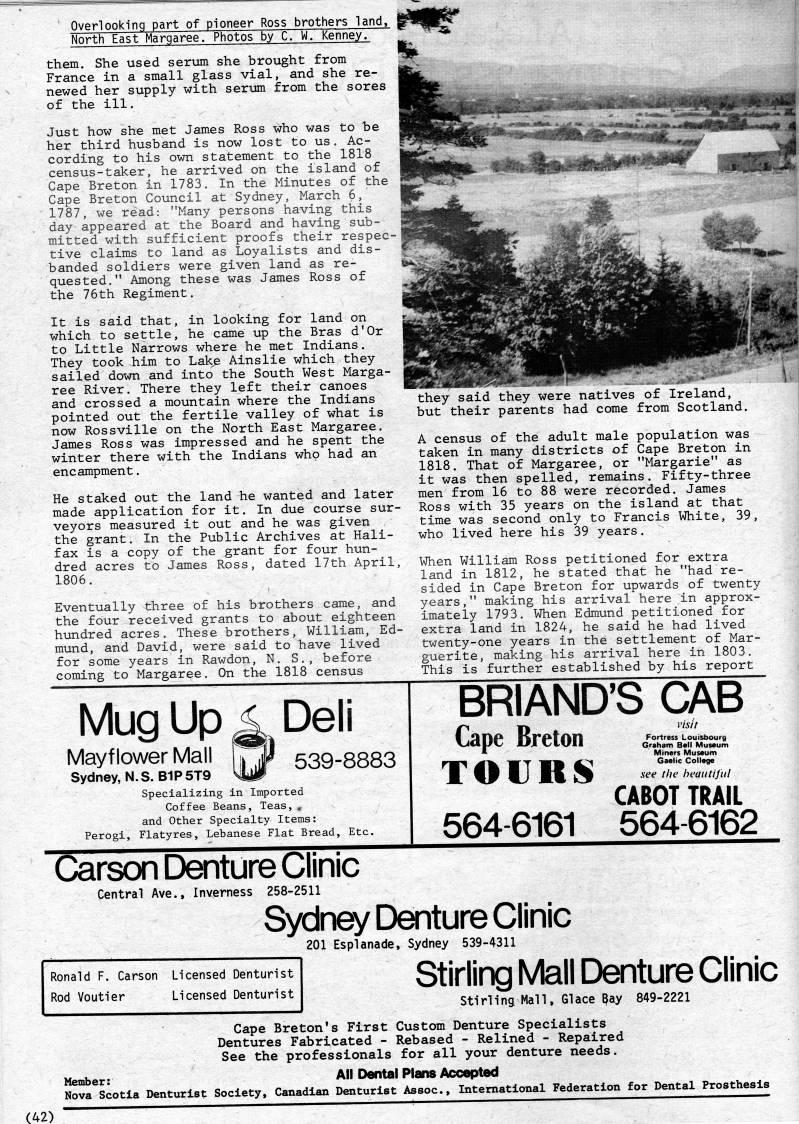 Overlooking part of pioneer Ross brothers land. North East Margaree. Photos by C. W. Kenney. them. She used serum she brought from France in a small glass vial, and she re? newed her supply with serum from the sores of the ill. Just how she met James Ross who was to be her third husband is now lost to us. Ac? cording to his own statement to the 1818 census-taker, he arrived on the island of Cape Breton in 1783. In the Minutes of the Cape Breton Council at Sydney, March 6, 1787, we read: "Many persons having this day appeared at the Board and having sub? mitted with sufficient proofs their respec? tive claims to land as Loyalists and dis- J banded soldiers were given land as re? quested." Among these was James Ross of the 76th Regiment. It is said that, in looking for land on which to settle, he came up the Bras d'Or to Little Narrows where he met Indians. They took him to Lake Ainslie which they sailed down and into the South West Marga? ree River. There they left their canoes and crossed a mountain where the Indians pointed out the fertile valley of what is now Rossville on the North East Margaree. James Ross was impressed and he spent the winter there with the Indians who had an encampment. He staked out the land he wanted and later made application for it. In due course sur? veyors measured it out and he was given the grant. In the Public Archives at Hali? fax is a copy of the grant for four hun? dred acres to James Ross, dated 17th April, 1806. Eventually three of his brothers came, and the four received grants to about eighteen hundred acres. These brothers, William, Ed? mund, and David, were said to have lived for some years in Rawdon, N. S., before coming to Margaree. On the 1818 census they said they were natives of Ireland, but their parents had come from Scotland. A census of the adult male population was taken in many districts of Cape Breton in 1818. That of Margaree, or "Margarie" as it was then spelled, remains. Fifty-three men from 16 to 88 were recorded. James Ross with 35 years on the island at that time was second only to Francis White, 39, who lived here his 39 years. When William Ross petitioned for extra land in 1812, he stated that he "had re? sided in Cape Breton for upwards of twenty years," making his arrival here in approx? imately 1793. When Edmund petitioned for extra land in 1824, he said he had lived twenty-one years in the settlement of Mar? guerite, making his arrival here in 1803. This is further established by his report Mug Up 4' Deli Mayflower Mall Sydney, N.S. B1P5T9 539-8883 Specializing in Imported Coffee Beans, Teas, ?? and Other Specialty Items: Perogi, Flatyres, Lebanese Flat Bread, Etc. BRIAND'S CAB Cape Breton TOURS CABOT TRAIL 564-6161 564-6162 Fortress Louisbourg Graham Bell Museum Miners Museum Gaelic College see the beautiful Carson Denture Clinic Central Ave., Inverness 258-2511 Sydney Denture Clinic 201 Esplanade. Sydney 539-4311 Ronald F. Carson Licensed Denturist Rod Voutier Licensed Denturist Stirling Mall Denture Clinic Stirling Mall. Glace 3ay 849-2221 Cape Breton's First Custom Denture Specialists Dentures Fabricated - Rebased - Relined - Repaired See the professionals for all your denture needs. Member: All Dental Plans Accepted Nova Scotia Denturist Society, Canadian Denturist Assoc, International Federation for Dental Prosthesis (42)