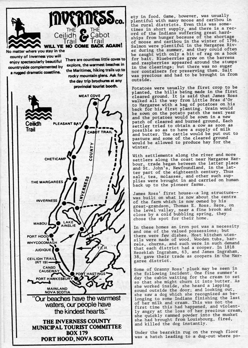 THE A THE Ceilidh aL Cabot Trail ''Trail WILL YE HO COME BACK AGAIN. No nnatter where you stay in the county of Inverness you will enjoy spectacularly beautiful There are countless little coves to countryside complemented by explore, the vt'armest beaches in a rugged dramatic coastline. t??'? Maritimes, hiking trails up to rocky mountain glens. Ask for the day trip brochures at any provincial tourist booth. MAINLAND NOVA SCOTIA HASTINGS*' "Qjr beaches have the >A/armest waters, our people have the kindest hearts." THE INVERNESS COUNTY MUNICIPAL TOURIST COMMITTEE BOX 179 PORT HOOD, NOVA SCOTIA ety in food. Game, however, was usually plentiful with many moose and caribou in the rural districts. Even this was some? times in short supply, and there is a rec? ord of the Indians suffering great hard? ships from hunger because of the shortage of moose and caribou in the winter of 1796. Salmon were plentiful in the Margaree Riv? er during the summer, and they could often be caught with only a bit of rag on a hook for bait. Blueberries grew on the barrens and raspberries appeared around the stumps in the clearings; but there was no sugar nor containers for preserving them. Salt was precious and had to be brought in from outside. Potatoes were usually the first crop to be planted, the hills being made in the first cleared ground. It is said that James Ross walked all the way from Little Bras d'Or to Margaree with a bag of potatoes on his back for his first planting. Grain would be sown on the potato patch the next year and the potatoes would be sown in a new patch of cleared and burned ground. Each settler tried to obtain a cow as soon as possible so as to have a supply of milk and butter. The cattle would be put out to pasture and some of the cleared ground would be allowed to produce hay for the winter. With settlements along the river and more settlers along the coast near Margaree Har? bour, trade began between the latter place and St. John's, Newfoundland, in the lat? ter part of the eighteenth century. Thus salt, tea, molasses, and other such sup? plies were brought in and carried on human back up to the pioneer farms. James Ross' first house--a log structure-- was built on what is now about the centre of the farm which is now owned by his great-grandson, Thomas E. Ross. Here, on the level valley, near a fine brook and close by a cold bubbling spring, they chose the spot for their home. In these homes an iron pot was a necessity and one of the valued possessions; but there were few dishes. Most kitchen uten? sils were made of wood. Wooden tubs, bar? rels , churns, and such were in such demand that each district had a cooper. In 1818 Hezekiah Ingraham, 63, and James Ingraham, 38, gave their trade as coopers in the Mar? garee district. Some of Granny Ross' pluck may be seen in the following incident. One fine summer's day the cabin waiting for the cream to set so that she might churn it into butter. As she worked inside, she heard a lapping sound outside the door; and looking out, she saw a dog which she recognized as be? longing to some Indians finishing the last of her milk and cream. This was not the first time this had happened, and violent? ly angry at the loss of her precious cream, she quickly rammed powder into the musket she had brought from Louisbourg, fired, and killed the dog instantly. Under the bearskin rug on the rough floor was a hatch leading to a dug-out where po-