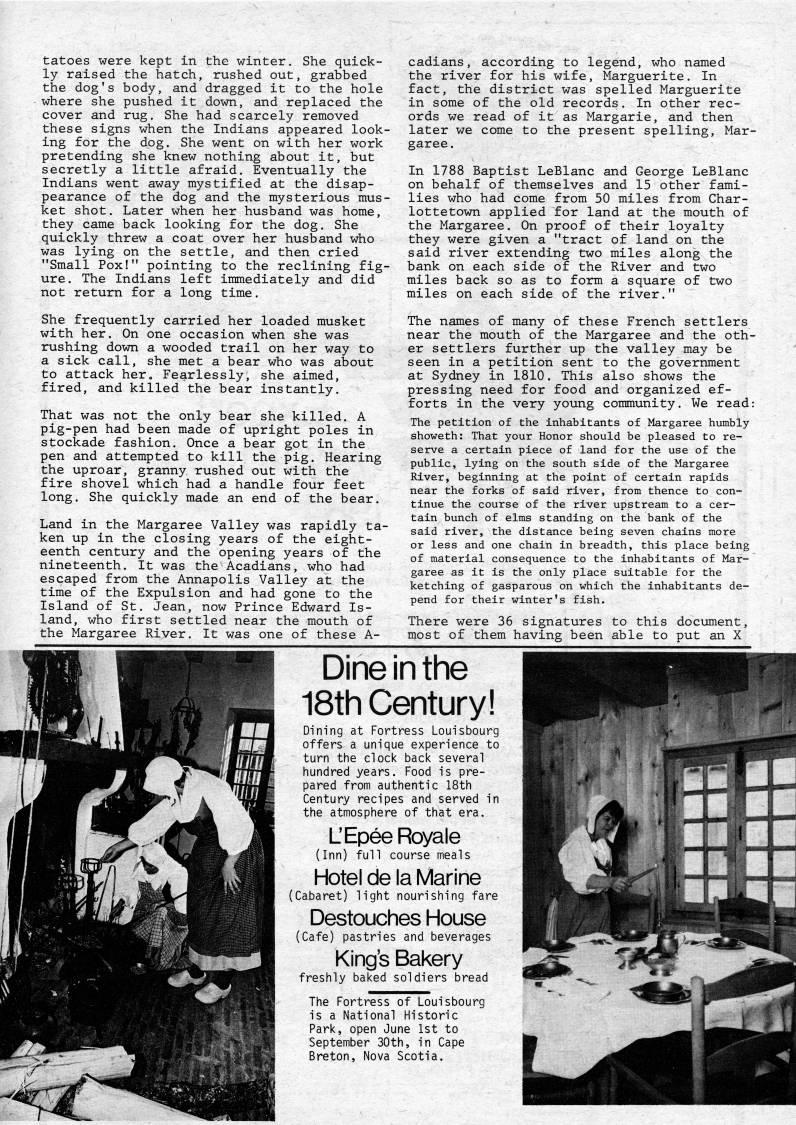 tatoes were kept in the winter. She quick? ly raised the hatch, rushed out, grabbed the dog's body, and dragged it to the hole where she pushed it down, and replaced the cover and rug. She had scarcely removed these signs when the Indians appeared look? ing for the dog. She went on with her work pretending she knew nothing about it, but secretly a little afraid. Eventually the Indians went away mystified at the disap? pearance of the dog and the mysterious mus? ket shot. Later when her husband was home, they came back looking for the dog. She quickly threw a coat over her husband who was lying on the settle, and then cried "Small Pox!" pointing to the reclining fig? ure. The Indians left immediately and did not return for a long time. She frequently carried her loaded musket with her. On one occasion when she was rushing down a wooded trail on her way to a sick call, she met a bear who was about to attack her. Fearlessly, she aimed, fired, and killed the bear instantly. That was not the only bear she killed. A pig-pen had been made of upright poles in stockade fashion. Once a bear got in the pen and attempted to kill the pig. Hearing the uproar, granny rushed out with the fire shovel which had a handle four feet long. She quickly made an end of the bear. Land in the Margaree Valley was rapidly ta? ken up in the closing years of the eight? eenth century and the opening years of the nineteenth. It was the Acadians, who had escaped from the Annapolis Valley at the time of the Expulsion and had gone to the Island of St. Jean, now Prince Edward Is? land, who first settled near the mouth of the Margaree River. It was one of these A- cadians, according to legend, who named the river for his wife. Marguerite. In fact, the district was spelled Marguerite in some of the old records. In other rec? ords we read of it as Margarie, and then later we come to the present spelling, Mar? garee. In 1788 Baptist LeBlanc and George LeBlanc on behalf of themselves and 15 other fami? lies who had come from 50 miles from Char- lottetown applied for land at the mouth of the Margaree. On proof of their loyalty they were given a "tract of land on the said river extending two miles along the bank on each side of the River and two miles back so as to form a square of two miles on each side of the river." The names of many of these French settlers near the mouth of the Margaree and the oth? er settlers further up the valley may be seen in a petition sent to the government at Sydney in 1810. This also shows the pressing need for food and organized ef? forts in the very young community. We read: The petition of the inhabitants of Margaree humbly showeth: That your Honor should be pleased to re? serve a certain piece of land for the use of the public, lying on the south side of the Margaree River, beginning at the point of certain rapids near the forks of said river, from thence to con? tinue the course of the river upstream to a cer? tain bunch of elms standing on the bank of the said river, the distance being seven chains more or less and one chain in breadth, this place being of material consequence to the inhabitants of Mar? garee as it is the only place suitable for the ketching of gasparous on which the inhabitants de? pend for their winter's fish. There were 36 signatures to this document, most of them having been able to put an X Dine in the 18th Century! Dining at Fortress Louisbourg offers a unique experience to turn the clock back several hundred years. Food is pre? pared from authentic 18th Century recipes and served in the atmosphere of that era. L'Epee Royale (Inn) full course meals Hotel de la Marine (Cabaret) light nourishing fare Destouches House (Cafe) pastries and beverages King's Bakery freshly baked soldiers bread The Fortress of Louisbourg is a National Historic Park, open June 1st to September 30th, in Cape Breton, Nova Scotia.