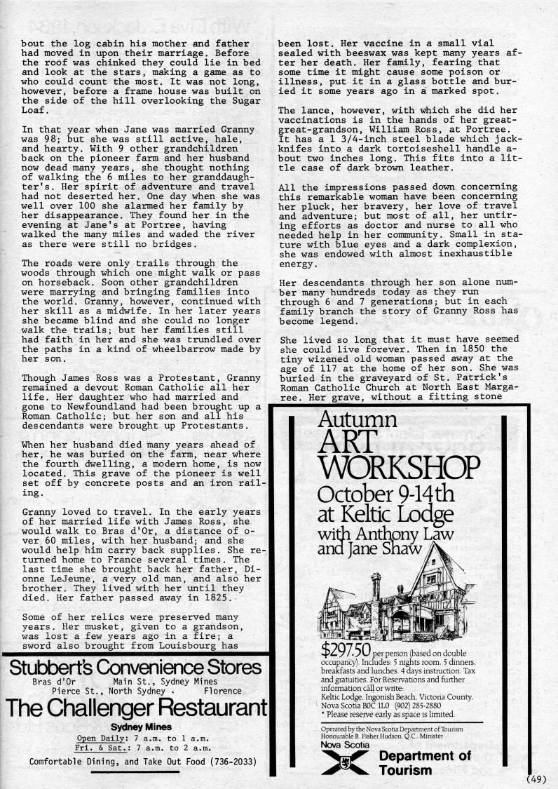 bout the log cabin his mother and father had moved in upon their marriage. Before the roof was chinked they could lie in bed and look at the stars, making a game as to who could count the most. It was not long, however, before a frame house was built on the side of the hill overlooking the Sugar Loaf. In that year when Jane was married Granny was 98; but she was still active, hale, and hearty. With 9 other grandchildren back on the pioneer farm and her husband now dead many years, she thought nothing of walking the 6 miles to her granddaugh- ter's. Her spirit of adventure and travel had not deserted her. One day when she was well over 100 she alarmed her family by her disappearance. They found her in the evening at Jane's at Portree, having walked the many miles and waded the river as there were still no bridges. The roads were only trails through the woods through which one might walk or pass on horseback. Soon other grandchildren were marrying and bringing families into the world. Granny, however, continued with her skill as a midwife. In her later years she became blind and she could no longer walk the trails; but her families still had faith in her and she was trundled over the paths in a kind of wheelbarrow made by her son. Though James Ross was a Protestant, Granny remained a devout Roman Catholic all her life. Her daughter who had married and gone to Newfoundland had been brought up a Roman Catholic; but her son and all his descendants were brought up Protestants. When her husband died many years ahead of her, he was buried on the farm, near where the fourth dwelling, a modem home, is now located. This grave of the pioneer is well set off by concrete posts and an iron rail? ing. Granny loved to travel. In the early years of her married life with James Ross, she would walk to Bras d'Or, a distance of o- ver 60 miles, with her husband; and she would help him carry back supplies. She re? turned home to France several times. The last time she brought back her father, Di- onne LeJeune, a very old man, and also her brother. They lived with her until they died. Her father passed away in 1825. Some of her relics were preserved many years. Her musket, given to a grandson, was lost a few years ago in a fire; a sword also brought from Louisbourg has Stubberfs Convenience Stores Bras d'Or Main St., Sydney Mines Pierce St., North Sydney . Florence The Challenger Restaurant Sydney Mines Open Daily: 7 a.m. to 1 a.m. Fri. & Sat.; 7 a.m. to 2 a.m. Comfortable Dining, and Take Out Food (736-2033) been lost. Her vaccine in a small vial sealed with beeswax was kept many years af? ter her death. Her family, fearing that some time it might cause some poison or illness, put it in a glass bottle and bur? ied it some years ago in a marked spot. The lance, however, with which she did her vaccinations is in the hands of her great- great-grandson, William Ross, at Portree. It has a 1 3/4-inch steel blade which jack- knifes into a dark tortoiseshell handle a- bout two inches long. This fits into a lit? tle case of dark brown leather. All the impressions passed down concerning this remarkable woman have been concerning her pluck, her bravery, her love of travel and adventure; but most of all, her untir? ing efforts as doctor and nurse to all who needed help in her community. Small in sta? ture with blue eyes and a dark complexion, she was endowed with almost inexhaustible energy. Her descendants through her son alone num? ber many hundreds today as they run through 6 and 7 generations; but in each family branch the story of Granny Ross has become legend. She lived so long that it must have seemed she could live forever. Then in 1850 the tiny wizened old woman passed away at the age of 117 at the home of her son. She was buried in the graveyard of St. Patrick's Roman Catholic Church at North East Marga? ree. Her grave, without a fitting stone Autumn ART WORKSHOP October 9-14th 'Z-y/'y'J per person (based on double occupancy). Includes: 5 nights room, 5 dinners, breakfasts and lunches, 4 days instruction. Tax and gratuities. For Reservations and further information call or write: Keltic Lodge, Ingonish Beach, Victoria County. Nova Scotia BOC ILO (902) 285-2880 * Please reserve early as space is limited. Operated by the Nova Scotia Department of Tourism Honourable R. Fisher Hudson. Q.C.. Minister Nova Scotia Department of Tourism (49)