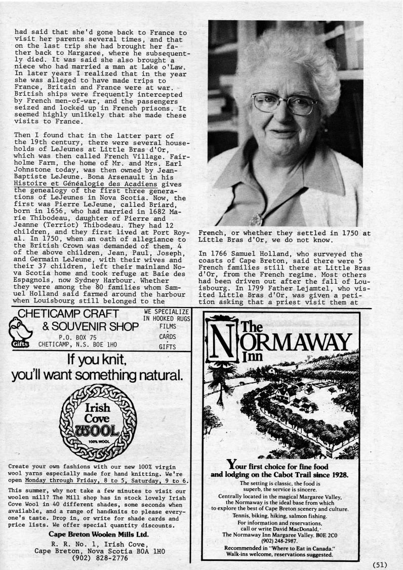 had said that she'd gone back to France to visit her parents several times, and that on the last trip she had brought her fa? ther back to Margaree, where he subsequent? ly died. It was said she also brought a niece who had married a man at Lake o'Law. In later years I realized that in the year she was alleged to have made trips to France, Britain and France were at war. British ships were frequently intercepted by French men-of-war, and the passengers seized and locked up in French prisons. It seemed highly unlikely that she made these visits to France. Then I found that in the latter part of the 19th century, there were several house? holds of LeJeunes at Little Bras d'Or, which was then called French Village. Fair- holme Farm, the home of Mr. and Mrs. Earl Johnstone today, was then owned by Jean- Baptiste LeJeune. Bona Arsenault in his Histoire et Genealogie des Acadiens gives the genealogy of the first three genera- tions of LeJeunes in Nova Scotia. Now, the first was Pierre LeJeune, called Briard, bom in 1656, who had married in 1682 Ma? rie Thibodeau, daughter of Pierre and Jeanne (Terriot) Thibodeau. They had 12 children, and they first lived at Port Roy? al. In 1750, when an oath of allegiance to the British Crown was demanded of them, 4 of the above children, Jean, Paul, Joseph, and Germain LeJeune, with their wives and their 37 children, left their mainland No? va Scotia home and took refuge at Bale des Espagnols, now Sydney Harbour. Whether they were among the 80 families whom Sam? uel Holland said farmed around the harbour when Louisbourg still belonged to the French, or whether they settled in 1750 at Little Bras d'Or, we do not know. In 1766 Samuel Holland, who surveyed the coasts of Cape Breton, said there were 5 French families still there at Little Bras d'Or, from the French regime. Most others had been driven out after the fall of Lou? isbourg. In 1799 Father Lejamtel, who vis? ited Little Bras d'Or, was given a peti? tion asking that a priest visit them at 'CHETICAMP CRAFT WE SPECIALIZE IN HOOKED RUGS & SOUVENIR SHOP "lms P.O. BOX 75 CARDS CHETICAMP, N.S. BOE IHO gipj5 If you knit, you'll want something natural. Create your own fashions with our new 100% virgin wool yams especially made for hand knitting. We're open Monday through Friday, 8 to 5, Saturday, 9 to 6. This summer, why not take a few minutes to visit our woolen mill? The Mill shop has in stock lovely Irish Cove Wool in 40 different shades, some seconds when available, and a range of handknits to please every? one's taste. Drop in, or write for shade cards and price lists. We offer special quantity discounts. Cape Breton Woolen Mills Ltd. R. R. No. 1, Irish Cove, Cape Breton, Nova Scotia BOA IHO (902) 828-2776 MfeMAWAY Lour first choice for fine food and lodging on the Cabot Trail 'ice 1928. The setting is classic, the food is superb, the service is sincere. Centrally located in the magical Margaree Valley, the Normaway is the ideal base from which to explore the best of Cape Breton scenery and culture. Tennis, biking, hiking, salmon fishing. For information and reservations, call or write David MacDonald, • The Normaway Inn Margaree Valley. BOE 2C0 (902) 248-2987. Recommended in "Where to Eat in Canada." Walk-ins welcome, reservations suggested. (51)