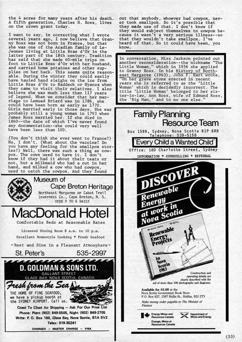 the 4 acres for many years after his death. A fifth generation, Charles H. Ross, lives on the crown grant today. I want to say, in correcting what I wrote several years ago, I now believe that Gran? ny Ross was not bom in France, but that she was one of the Acadian family of Le? Jeunes living at Little Bras d'Or in the latter part of the 18th century. Tradition has said that she made 60-mile trips on foot to Little Bras d'Or with her husband, and carried home potatoes and other sup? plies on her back. This seems quite reason? able. During the winter they could easily have hauled hand sleighs on the ice from Little Bras d'Or to Baddeck or Nyanza when they came to visit their relatives. I also believe she was much less than 117 years of legend. When we consider that her mar? riage to Lemuad Briard was in 1786, she could have been bom as early as 1770. Girls married early in those days. She was probably still a young woman in 1793 when James Ross married her. If she died in 1860--the date of which I've never found any documentation--she could very well have been less than 100. (You don't think she ever went to France?) No, I don't. (What about the vaccine? Do you have any feeling for the smallpox stor? ies?) Well, there was such a thing as cow- pox. The cows used to have it. I don't know if they had it about their teats or not, but a milkmaid who had a cut in her hand, and milked a cow who had cowpox, used to catch the cowpox. And they found out that anybody, whoever had cowpox, nev? er took smallpox. So it's possible that they made use of that. I don't know if they would subject themselves to cowpox be? cause it wasn't a very serious illness--so that they wouldn't take smallpox. I've heard of that. So it could have been, you know. Museum of Cape Breton Heritage Northeast Margaree on Cabot Trail Inverness Co., Cape Breton, N. S. OPEN 9 TO 6 DAILY MacDonald Hotel Comfortable Beds at Reasonable Rates Licensed Dining Room 8 a.m. to 10 p.m. Excellent Homestyle Cooking * Fresh Seafood -Rest and Dine in a Pleasant Atmosphere- St. Peter's 535-2997 D. GOLDMAN & SONS LTD. GALLANT STREET GLACE BAY NOVA SCOTIA. CANADA 'pnc''uMtt' Sea''f'' THE HOME OF FINE SEAFOOD; we have a pickup booth at the SYDNEY AIRPORT. Call us. Coast To Cdast Air Shipping - Ask For Our Price T;iSt Phone: Plant (902) 849-5505, Night (902) 849-2705 Write: P. O. Box 160, Glace Bay, Nova Scotia, B1A 5V2 Telex: 019-35241 CHARGEX - MASTER CHARGE - VISA In conversation, Miss Jackson pointed out another reconsideration--the nickname "The Little Woman," which in 1956 she applied to Granny Ross. In his History of North? east Margaree (1963), John F. Hart wrote, "On her grave stone erected in recent years she is referred to as the 'Little Woman' which is decidedly incorrect. The title 'Little Woman' belonged to her sis? ter-in-law, Ann Ross, wife of Edmund Ross, the 'Big Man,' and to no one else." Family Planning Resource Team Box 1598, Sydney, Nova Scotia BIP 6R8 Telephone: 539-5158 I Every Child a Wanted Childl Office: 180 Charlotte Street, Sydney INFORMATION * COUNSELLING * REFERRAL Construction and operating details are clearly described with the aid of more than 100 photographs and diagrams. Available for $5.00 at the Nova Scotia Government Book Store P.O. Box 637, 1597 HoUis St., Halifax, B3J 2T3 Make money order payable to The Minister of Finance 1'1 . Mines and Energy Energie, Mines et (53)