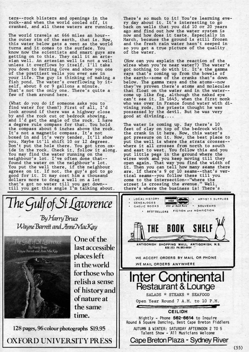 ters--rock blisters and openings in the rock--and when the world cooled off, it cranked, and all these waters are running. The world travels at 666 miles an hour-- the outer rim of the earth, that is. Now, this water below gets a vent as the world turns and it comes to the surface. You know now the scientists and smart guys are getting on to this. They call it an arte? sian well. An artesian well is not a well unless it overflows by itself. I'll take you down to Herring Cove and show you one of the prettiest wells you ever saw in your life. The guy is thinking of making a fish pond. The water's overflowing by it? self, about 8 or 9 gallons a minute. That's not the only one. There's quite a few of them around here. (What do you do if someone asks you to find water for them?) First of all, I'd look around if there was a highway close by and the rock cut or bedrock showing, and I'd get the angle of the rock. I have a degree rule compass for that. You hold the compass about 6 inches above the rock. It's not a magnetic compass. It's not boxed in and it's very tender. It'll show you. Maybe it'll shift 10 or 12 degrees. Don't put the hole there. You got iron ox? ide in the rock. Check it, follow it along. You may find the water running on the neighbour's lot, I've often done that-- found the water on the neighbour's lot. You put the well there, if thfe neighbour agrees on it. If not, the guy's got to go good for it. It may cost him a thousand dollars more to drag a well on a lot that's got no water till you get down-- till you get this angle I'm talking about. There's so much to it! You're learning eve? ry day about it. It's interesting to go back on wells that you did 10 or 20 years ago and find out how the water system is now and how does it taste. Especially in March, because the ground is still frozen and the fresh rain water hasn't seeped in so you get a true picture of the quality of the water. (How can you explain the reaction of the wires when you're near water?) The water's got nothing to do with it. It's the gamma rays that's coming up from the bowels of the earth--some of the cranks that's down below. The gamma rays and the atoms--now they've proven there's atoms and molecules that float on the water and in the water-- come up like fog, although the naked eye can't see it. In 1645, when the first monk who was over in France found water with di? vining rods, the priests thought he was possessed by the devil. But he was very good at divining.... The water is coming up. Say there's 10 feet of clay on top of the bedrock with the crank in it here. Now, this water's got pressure on it. Now, the best place to put the well is where the strata crosses-- where it all crosses from north to south and east to west. You follow this and you put little pegs in the ground where the wires work and you keep moving till they open again. That way you find the width of it. Then you can tell how many seams there are. If there's 9 or 10 seams--that's ver? tical seams--you follow these till you come to the intersection--"where the street is crossing the avenue." Well, there's where the business is! There's The 'ulfofSiJ'wrence T>yHarry'ruce WayneBarreH andJlnneMacK'y One of the last accessible places left in the world for those who relish a sense of history and of nature at the same time. 128 pages, 96 colour photographs $19.95 OXFORD UNIVERSITY PRESS h;STOR-Y OCiE S BOOKS BFSTSei WS4 |(Q2> VSS'riini Hilt LERS nCT.ON . ARTIST S SI • SOUVENIRS nd NONFICTION THE BOOK SHELF WE ACCEPT ORDERS BY MAIL OR PHONE .WE MAIL ORDERS ANYWHERE Inter Continental Restaurant & Lounge SALADS * STEAKS * SEAFOOD Open Year Round 7 A • M. to 10 P.M. 'r .'..i'l'V'-'.,, . ,;?? , , ',JJg* CEILIDH Nightly - Phone 562-6614 to Inquire Round & Square Dancing, Best Cape Breton Fiddlers AUTUMN & WINTER: SATURDAY AFTERNOON 2 TO 5 Talent Show - All Musicians Welcome Cape Breton Plaza - Sydney River (55)