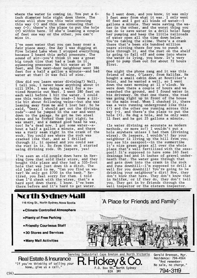 where the water is coming in. You put a 6- inch diameter hole right down there. The wires will show you this vein crossing this way (1) and this one crossing that way ( • ); there's the place to put the hole (+) within here. If she's leaning a couple of feet one way or the other, you can't miss it. I've seen water that you can hear roar a fair piece away. One day I was digging at Five Island Lake when I stopped everything because I heard this awful pressure. The sound of air--you'd think it was a great big truck tire that had a leak in it, squeezing pressure. We hit water at 29 feet, and the next-door neighbour went 386 feet for a half a gallon a minute--and bad water at that! It was full of zinc. (How did you learn water divining?) Well, I tell you, I never knew anything about it till 1954. I was doing a well for a re? tired Mountie out West. I went 280 feet on each well before I hit the water. I could see this.vein down the road--I knew a lit? tle bit about following veins--but she was leaning away from me and I lost her. So he . said, "Geez, I should get out the divining rods"--and he jumped in the car and went down to the garage. He got me two steel wires and he forked them just right; he was smart, and a damned good head he was, too! He's dead now. I got some water--a- bout a half a gallon a minute, and there was a rusty seam right in the crank of the rock. You could see where the rock was cracked like that, and as I drilled through it, it opened and you could see the rust in it. So from then on I started using divining rods. Oh jeepers, yesJ I've seen an old couple down here in Her? ring Cove that sold their store, and they bought this place and they had a 335-foot hole that was just down in a ditch. The old lady said to me, "Can you find us wa? ter? We only got $700 in the bank." Re? tired, you feel sorry for them. I told them I'd check with the wires, that's a hard spot down there. I know. I've been there before and it's hard to get water. So I went down, and you know, it was only 5 feet away from what it was. I only went 60 feet and I got all kinds of water--5 gallons a minute. They were saving the wa? ter in the other, and the worst thing you can do is save water in a drill hole! Keep her pimping and keep the little railroads of water open all the time down below. You're taking the slime. There's a crank there that's been six hundred million years sitting there for you to punch a hole through it, and the rust on the shelf is going to fall off and come into where the water is lying, you know. It's very good to pump them out for about 72 hours . first. One night the phone rang and it was this friend of mine, O'Leary, from Halifax. He bought a small cabin down at Boutilier's Point, and he wanted a well, so I went down the next morning at 11 o'clock. We were down there a couple of hours and we searched the ground, and I found water in his driveway. On that one there, the road was going right up in front of the house to the main road. When I checked it, there was a vein running underground like this (I) and the other one running across this way (-), and there's the place to put the hole (+). He dug a hole, and he only went 11 feet and he got 25 gallons a minute. (Is water divining as accurate as modern methods, or more so?) I wouldn't put a hole anywhere unless I had them (divining wires). Oh jeepers, I wouldn't! Say your neighbour is living up the hill from you; you see his cesspool--in the summertime it's nice green grass all over the whole place that's well fertilized with the cess? pool! It's supposed to have some 160 feet drainage bed and 14 inches of gravel under? neath that. The water goes through that and gets down into the crank in the.rock and runs downhill--I'm supposed to drill a well for you downhill! Y9u're going to be drinking your neighbour's dirt! Now, they don't know that here. They don't know that in Halifax, or if they do, they don't tell you. They get in by friends through the well inspector or the cistern inspector. North Sydney Mall 116 King St, North Sydney, Nova Scotia • Climate Controlled Atmosphere • Plenty of Free Parking • Friendly Courteous Staff • 30 Stores and Services • Many Mall Activities A Place for Friends and Family" Serving Industrial Cape Breton and North Victoria Real Estate & Insurance ~ "If you're thinking of selling your home, give us a call." R.Hicl