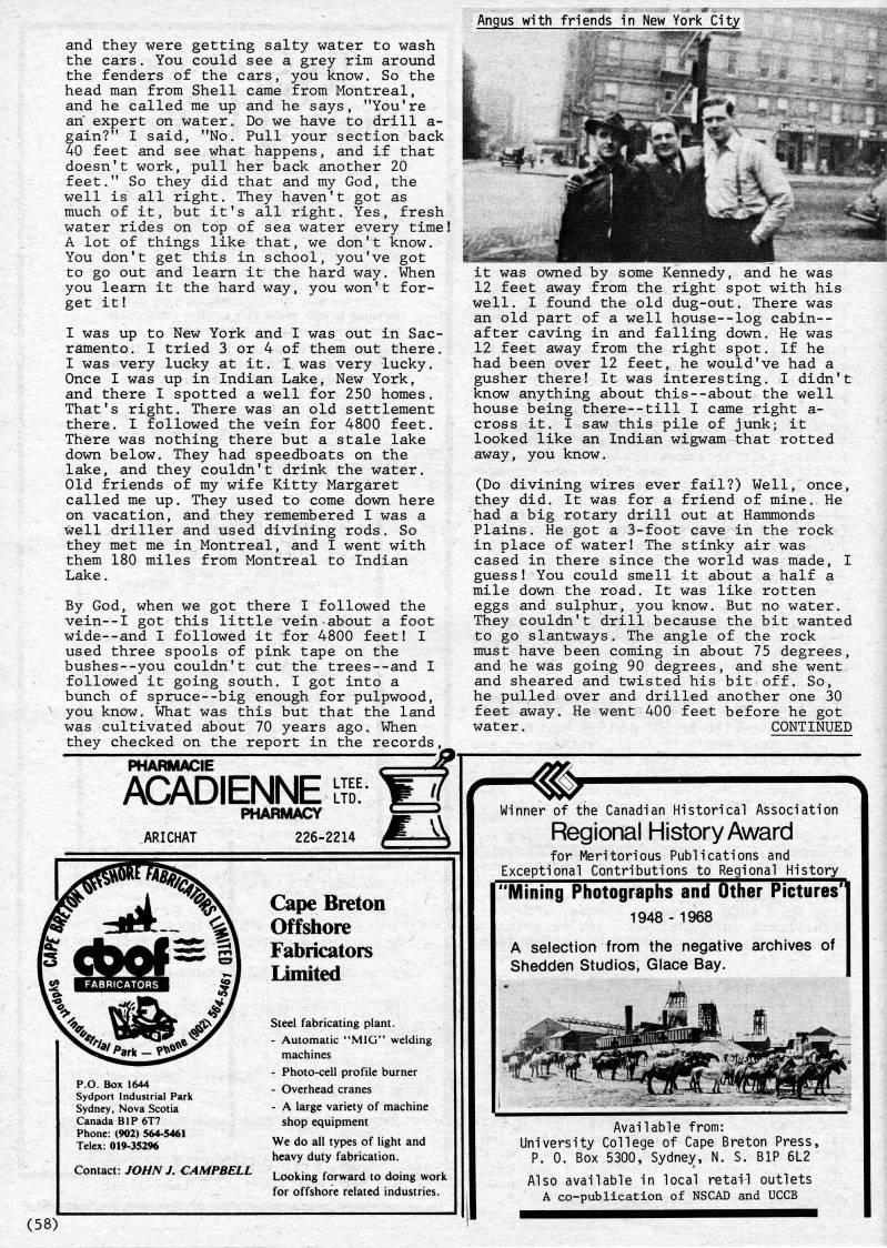 and they were getting salty water to wash the cars. You could see a grey rim around the fenders of the cars, you know. So the head man from Shell came from Montreal, and he called me up and he says, "You're an expert on water. Do we have to drill a- gain?" I said, "No. Pull your section back 40 feet and see what happens, and if that doesn't work, pull her back another 20 feet." So they did that and my God, the well is all right. They haven't got as much of it, but it's all right. Yes, fresh water rides on top of sea water every time! A lot of things like that, we don't know. You don't get this in school, you've got to go out and learn it the hard way. When you learn it the hard way, you won't for? get it! I was up to New York and I was out in Sac? ramento. I tried 3 or 4 of them out there. I was very lucky at it. I was very lucky. Once I was up in Indian Lake, New York, and there I spotted a well for 250 homes. That's right. There was an old settlement there. I followed the vein for 4800 feet. There was nothing there but a stale lake down below. They had speedboats on the lake, and they couldn't drink the water. Old friends of my wife Kitty Margaret called me up. They used to come down here on vacation, and they remembered I was a well driller and used divining rods. So they met me in Montreal, and I went with them 180 miles from Montreal to Indian Lake. By God, when we got there I followed the vein--I got this little vein about a foot wide--and I followed it for 4800 feet! I used three spools of pink tape on the bushes--you couldn't cut the trees--and I followed it going south. I got into a bunch of spruce--big enough for pulpwood, you know. What was this but that the land was cultivated about 70 years ago. When they checked on the report in the records, Angus with friends in New York City PHARMACIE ACADENNE t?o' PHARMACY 7 ARICHAT 226-2214 'A P.O. Box 1644 Sydport Industrial Park Sydney, Nova Scotia Canada BIP 6T7 Phone: (902) 564-5461 Telex: 019-35296 Contact: JOHN J. CAMPBELL Cape Breton Offshore Fabricators Limited Steel fabricating plant. - Automatic "MIG" welding machines - Photo-cell profile burner - Overhead cranes - A large variety of machine shop equipment We do all types of light and heavy duty fabrication. Looking forward to doing work for offshore related industries. (58) it was owned by some Kennedy, and he was 12 feet away from the right spot with his well. I found the old dug-out. There was an old part of a well house--log cabin-- after caving in and falling down. He was 12 feet away from the right spot. If he had been over 12 feet, he would've had a gusher there! It was interesting. I didn't know anything about this--about the well house being there--till I came right a- cross it. I saw this pile of junk; it looked like an Indian wigwam that rotted away, you know. (Do divining wires ever fail?) Well, once, they did. It was for a friend of mine. He had a big rotary drill out at Hammonds Plains. He got a 3-foot cave in the rock in place of water! The stinky air was cased in there since the world was made, I guess! You could smell it about a half a mile down the road. It was like rotten eggs and sulphur, you know. But no water. They couldn't drill because the bit wanted to go slantways. The angle of the rock must have been coming in about 75 degrees, and he was going 90 degrees, and she went and sheared and twisted his bit off. So, he pulled over and drilled another one 30 feet away. He went 400 feet before he got water. CONTINUED r • ' Winner of the Canadian Historical Association Regional History Award for Meritorious Publications and Exceptional Contributions to Regional History 'Mining Photographs and Other Pictures' 1948-1968 A selection from the negative archives of Shedden Studios, Glace Bay. Available from: University College of Cape Breton Press, P. 0. Box 5300, Sydney, N. S. BIP 6L2 Also available in local retail outlets A co-publication of NSCAD and UCCB