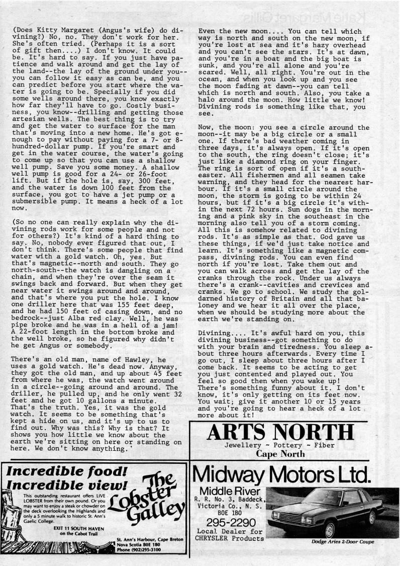 Published by Ronald Caplan on 1984/8/1 (208 reads)(Does Kitty Margaret (Angus's wife) do di? vining?) No, no. They don't work for her. She's often tried. (Perhaps it is a sort of gift then....) I don't know. It could be. It's hard to say. If you just have pa? tience and walk around and get the lay of the land--the lay of the ground under you-- you can follow it easy as can be, and you can predict before you start where the wa? ter is going to be. Specially if you did some wells around there, you know exactly how far they'll have to go. Costly busi? ness, you know--drilling and getting those artesian wells. The best thing is to try and get the water to surface for the man that's moving into a new home. He's got e- nough to pay without paying for a 7- or 8- hundred-dollar pump. If you're smart and get in the water course, the water's going to come up so that you can use a shallow well pump. Save you some money. A shallow well pump is good for a 24- or 26-foot lift. But if the hole is, say, 300 feet, and the water is down 100 feet from the surface, you got to have a jet pump or a submersible pump. It means a heck of a lot now. (So no one can really explain why the di? vining rods work for some people and not for others?) It's kind of a hard thing to say. No, nobody ever figured that out, I don't think. There's some people that find water with a gold watch. Oh, yes. But that's magnetic--north and south. They go north-south--the watch is dangling on a chain, and when they're over the seam it swings back and forward. But when they get near water it swings around and around, and that's where you put the hole. I know one driller here that was 155 feet deep, and he had 150 feet of casing down, and no bedrock--just Alba red clay. Well, he was pipe broke and he was in a hell of a jam! A 22-foot length in the bottom broke and the well broke, so he figured why didn't he get Angus or somebody. There's an old man, name of Hawley, he uses a gold watch. He's dead now. Anyway, they got the old man, and up about 45 feet from where he was, the watch went around in a circle--going around and around. The driller, he pulled up, and he only went 32 feet and he got 10 gallons a minute. That's the truth. Yes, it was the gold watch. It seems to be something that's kept a hide on us, and it's up to us to find out. Why was this? Why is that? It shows you how little we know about the earth we're sitting on here or standing on here. We don't know anything. * Incredible food! Incredible view! This outstanding restaurant offers LiVE LOBSTER from their own pound. Or you ??-_ '_' may want to enjoy a steak or chowder on ??Sa'?rt the deck overlooking the Highlands and 'i j'-m ?"'y ' ' minute walk to historic St. Ann's 'bmfMMim EXIT 11 SOUTH HAVEN '' on the Cabot Trail St. Ann's Harbour, Cape Breton NovaScotia BOE IBO Phone (902)295-3100 Even the new moon.... You can tell which way is north and south on the new moon, if you're lost at sea and it's hazy overhead and you can't see the stars. It's at dawn, and you're in a boat and the big boat is sunk, and you're all alone and you're scared. Well, all right. You're out in the ocean, and when you look up and you see the moon fading at dawn--you can tell which is north and south. Also, you take a halo around the moon. How little we know! Divining rods is something like that, you see. Now, the moon: you see a circle around the moon--it may be a big circle or a small one. If there's bad weather coming in three days, it's always open. If it's open to the south, the ring doesn't close; it's just like a diamond ring on your finger. The ring is sort of open if it's a south? easter. All fishermen and all seamen take warning, and they head for the nearest har? bour. If it's a small circle around the moon, the storm is going to be within 24 hours, but if it's a big circle it's with? in the next 72 hours. Sun dogs in the morn? ing and a pink sky in the southeast in the morning also tell you of a storm coming. All this is somehow related to divining rods. It's as simple as that. God gave us these things, if we'd just take notice and learn. It's something like a magnetic com? pass, divining rods. You can even find north if you're lost. Take them out and you can walk across and get the lay of the cranks through the rock. Under us always there's a crank--cavities and crevices and cranks. We go to school. We study the gol- darned history of Britain and all that ba? loney and we hear it all over the place, when we should be studying more about the earth we're standing on. Divining.... It's awful hard on you, this divining business--got something to do with your brain and tiredness. You sleep a- bout three hours afterwards. Every time I go out, I sleep about three hours after I come back. It seems to be acting to get you just contented and played out. You feel so good then when you wake up! There's something funny about it. I don't know, it's only getting on its feet now. You wait; give it another 10 or 15 years and you're going to hear a heck of a lot , more about it! ARTS NORTH Jewellery ~ Pottery ~ Fiber Cape North Midway Motors Ltd. Middle River R. R. No. 3, Baddeck, Victoria Co., N. S. BOE IBO 295-2290 Local Dealer for CHRYSLER Products Dodge Aries 2-Door Coupe