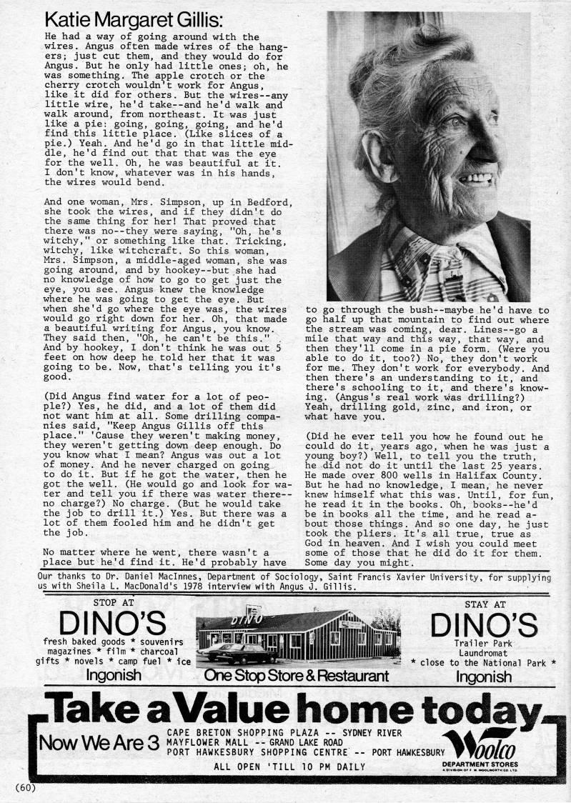 Published by Ronald Caplan on 1984/8/1 (191 reads)Katie IVIargaret Gillis: He had a way of going around with the wires. Angus often made wires of the hang? ers ; just cut them, and they would do for Angus. But he only had little ones; oh, he was something. The apple crotch or the cherry crotch wouldn't work for Angus, like it did for others. But the wires--any little wire, he'd take--and he'd walk and walk around, from northeast. It was just like a pie: going, going, going, and he'd find this little place. (Like slices of a pie.) Yeah. And he'd go in that little mid? dle, he'd find out that that was the eye for the well. Oh, he was beautiful at it. I don't know, whatever was in his hands, the wires would bend. And one woman, Mrs. Simpson, up in Bedford, she took the wires, and if they didn't do the same thing for her! That proved that there was no--they were saying, "Oh, he's witchy," or something like that. Tricking, witchy, like witchcraft. So this woman, Mrs. Simpson, a middle-aged woman, she was going around, and by hookey--but she had no knowledge of how to go to get just the eye, you see. Angus knew the knowledge where he was going to get the eye. But when she'd go where the eye was, the wires would go right down for her. Oh, that made a beautiful writing for Angus, you know. They said then, "Oh, he can't be this." And by hookey, I don't think he was out 5 feet on how deep he. told her that it was going to be. Now, that's telling you it's good. (Did Angus find water for a lot of peo? ple?) Yes, he did, and a lot of them did not want him at all. Some drilling compa? nies said, "Keep Angus Gillis off this place." 'Cause they weren't making money, they weren't getting down deep enough. Do you know what I mean? Angus was out a lot of money. And he never charged on going to do it. But if he got the water, then he got the well. (He would go and look for wa? ter and tell you if there was water there-- no charge?) No charge. (But he would take the job to drill it.) Yes. But there was a lot of them fooled him and he didn't get the j ob. No matter where he went, there wasn't a place but he'd find it. He'd probably have l''''l jl Our thanks to Dr. Daniel Maclnnes, Department of Sociol us with Sheila L. MacDonald's 1978 interview with Angus to go through the bush--maybe he'd have to go half up that mountain to find out where the stream was coming, dear. Lines--go a mile that way and this way, that way, and then they'll come in a pie form, (Were you able to do it, too?) No, they don't work for me. They don't work for everybody. And then there's an understanding to it, and there's schooling to it, and there's know? ing. (Angus's real work was drilling?) Yeah, drilling gold, zinc, and iron, or what have you. (Did he ever tell you how he found out he could do it, years ago, when he was just a young boy?) Well, to tell you the truth, he did not do it until the last 25 years. He made over 800 wells in Halifax County. But he had no knowledge, I mean, he never knew himself what this was. Until, for fun, he read it in the books. Oh, books--he'd be in books all the time, and he read a- bout those things. And so one day, he just took the pliers. It's all true, true as God in heaven. And I wish you could meet some of those that he did do it for them. Some day you might. ogy. Saint Francis Xavier University, for supplying J. Gillis. DINO'S fresh baked goods * souvenirs magazines * film * charcoal gifts * novels * camp fuel * ice Ingonish STAY AT One Stop Store & Restaurant DINO'S Trailer Park Laundromat * close to the National Park * Ingonish Iniake a Value home today-l . , . , A ' CAPE BRETON SHOPPING PLAZA -- SYDNEY RIVER ''A 0KKf W Now We ArG 3 MAYFLOWER mall -- grand lake ROAD 'Sk!ilrn I' I 'vyvv vvv'r-'iv'v' pQp.,. HAWKESBURY SHOPPING CENTRE -- PORT HAWKESBURY WjUUILU 11 ' ALL OPEN 'TILL 10 PM DAILY P''ltJlTr''l'ZQ''! j|i (60)