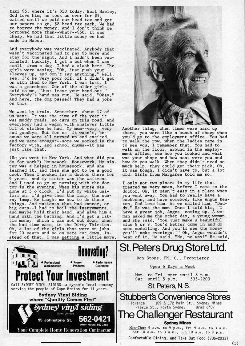 taxi $5, where it's $50 today. Earl Hawley, God love him, he took us over for $5, waited until we paid our head tax and got our papers to go, $8 head tax each. We had to borrow the money. And I don't think we borrowed more than--what?--$50. It was cheap. We had that little money we had made in Mabou. And everybody was vaccinated. Anybody that wasn't vaccinated had to pay $5 more and stay for the night. And I hadn't been vac? cinated. Luckily, I got a cut when I was small, from a dog. I had a slash here. The girls were saying, "Oh, just push your sleeves up, and don't say anything." Well, see, I'd be very poor off, if I didn't get on with them to New York. I was lost. I was a greenhorn. One of the older girls said to me, "Just leave your hand out." Everybody's hand was out. He said, "Okay." And here, the dog passed! They had a joke on this. We went by train. September. About 17 of us went. It was the time of the year it was muddy roads, no cars on this road. And everybody had a wagon with whatever little bit of clothes he had. My mum--very, very sad goodbye. But for us, it wasn't, be? cause we were all nerved up and excited, and we were amongst--some we worked in the factory with, and school chums--it was just like that. (So you went to New York. And what did you do for work?) Housework. Housework. My sis? ter was a helper in housework, and she learned it, and then she got to be a good cook. Then I cooked for a doctor there for 9 years, and my sister was the waitress. And I used to go up nursing with the doc? tor in the evening. When his nurse was gone at 5 o'clock, I'd put my white uni? form on. I'd give them the lamp, the sun- ray lamp. He taught me how to do those things. And patients that had cancer, or big cuts--I had to boil the instruments, and maybe hold their hand, and give him a hand with the bathing. And I'd get a lit? tle money. Which I was not cut down, when the bad time came, in the Dirty Thirties. Oh, a lot of the girls that were on jobs for 20 years and so on were cut down. In? stead of that, I was getting a little more. il'l' ,':'t*) Another thing, when times were hard up there, you were like a bunch of sheep when you'd go to the employment office. You had to walk the row, when the ladies came in to see you. I remember that. You had to walk on the floor, around in the employ? ment office, see how you looked and what was your shape and how neat were you and how do you walk. When they didn't need so much help, they could get their pick. Oh, it was tough. I didn't have to, but a lot did. Girls from Margaree told me so. I only got two places in my life that treated me very mean, before I came to the doctor. Oh, it wasn't easy in a place when you went away. You had to really have a backbone, and have somebody like Angus Bea? ton, God love him. As we called him, "Dad? dy." He was the man. Once I told him, "I have a great job, Angus, coming up. A wo? man asked me the other day, a young woman, and she said, 'You just make a beautiful size 8 or 9. You'd better come in and do some modelling. And you'll see the money you'll make evenings.'" Oh, Angus wouldn't hear of it. He said, "No, no way!" He said. ij| • Professional Workmanship • Proven Products • Performance Guarantee Protect Your Investment Call SYDNEY VINYL SIDING • a dynamic local company serving the people of Cape Breton for 11 years. Sydney Vinyl Siding where "Quality Comes First" Sydney vii'l siding ' Sales Limited 95 Johnstone St. 562-0421 Your Comolete Home Renovation Contractor St. Peters Drug Store Ltd. Don Stone, Phi. C, Proprietor Open 6 Days a Week Mon. to Fri. open until 8 p.m. Sat. until 5 p.m. 535-2203 St. Peters, N.S. Stubberfe Convenience Stores Florence 109 & 172 Main St., Sydney Mines Pierce St., North Sydney Bras d'Or The Challenger Restaurant Mon-Thur 9 a, Sydney Mines m. to 9 p.m., Fri 9 a.m. to 3 a.m, to 3 a.m.. Sun 10 a.m. to 9 p.m. Sat 10 a.m. Comfortable Dining, and Take Out Food (736-2033) (5)