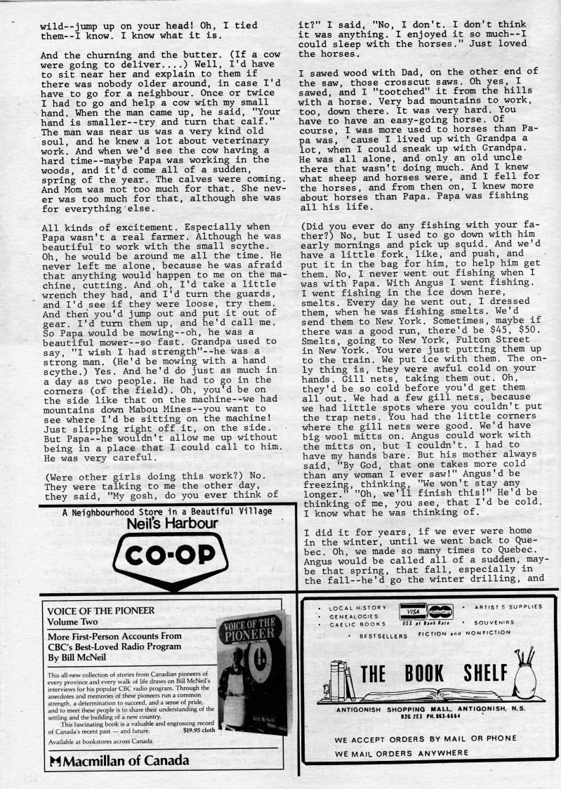wild--jump up on your head! Oh, I tied them • I know, I know what it is. And the churning and the butter. (If a cow were going to deliver....) Well, I'd have to sit near her and explain to them if there was nobody older around, in case I'd have to go for a neighbour. Once or twice I had to go and help a cow with my small hand. When the man came up, he said, "Your hand is smaller--try and turn that calf." The man was near us was a very kind old soul, and he knew a lot about veterinary work. And when we'd see the cow having a hard time--maybe Papa was working in the woods, and it'd come all of a sudden, spring of the year. The calves were coming. And Mom was not too much for that. She nev? er was too much for that, although she was for everything • else. All kinds of excitement. Especially when Papa wasn't a real farmer. Although he was beautiful to work with the small scythe. Oh, he would be around me all the time. He never left me alone, because he was afraid that anything would happen to me on the ma? chine, cutting. And oh, I'd take a little wrench they had, and I'd turn the guards, and I'd see if they were loose, try them. And then you'd jump out and put it out of gear. I'd turn them up, and he'd call me. So Papa would be mowing--oh, he was a beautiful mower--so fast. Grandpa used to say, "I wish I had strength"--he was a strong man. (He'd be mowing with a hand scythe.) Yes. And he'd do just as much in a day as two people. He had to go in the comers (of the field). Oh, you'd be on the side like that on the machine--we had mountains down Mabou Mines--you want to see where I'd be sitting on the machine! Just slipping right off it, on the side. But Papa--he wouldn't allow me up without being in a place that I could call to him. He was very careful. (Were other girls doing this work?) No. They were talking to me the other day, they said, "My gosh, do you ever think of A Neighbourhood Store in a Beautiful Village Neil's Harbour CO-OP' it?" I said, "No, I don't. I don't think it was anything. I enjoyed it so much--I could sleep with the horses." Just loved the horses. I sawed wood with Dad, on the other end of the saw, those crosscut saws. Oh yes, I sawed, and I "tootched" it from the hills with a horse. Very bad mountains to work, too, down there. It was very hard. You have to have an easy-going horse. Of course, I was more used to horses than Pa? pa was, 'cause I lived up with Grandpa a lot, when I could sneak up with Grandpa. He was all alone, and only an old uncle there that wasn't doing much. And I knew what sheep and horses were, and I fell for the horses, and from then on, I knew more about horses than Papa. Papa was fishing all his life. (Did you ever do any fishing with your fa? ther?) No, but I used to go down with him early mornings and pick up squid. And we'd have a little fork, like, and push, and put it in the bag for him, to help him get them. No, I never went out fishing when I was with Papa. With Angus I went fishing. I went fishing in the ice down here, smelts. Every day he went out, I dressed them, when he was fishing smelts. We'd send them to New York. Sometimes, maybe if there was a good run, there'd be $45, $50. Smelts, going to New York, Fulton Street in New York. You were just putting them up to the train. We put ice with them. The on? ly thing is, they were awful cold on your hands. Gill nets, taking them out. Oh, they'd be so cold before you'd get them all out. We had a few gill nets, because we had little spots where you couldn't put the trap nets. You had the little corners where the gill nets were good. We'd have big wool mitts on. Angus could work with the mitts on, but I couldn't. I had to have my hands bare. But his mother always said, "By God, that one takes more cold than any woman I ever saw!" Angus'd be freezing, thinking, "We won't stay any longer." "Oh, we'll finish this!" He'd be thinking of me, you see, that I'd be cold. I know what he was thinking of. I did it for years, if we ever were home in the winter, until we went back to Que? bec. Oh, we made so many times to Quebec. Angus would be called all of a sudden, may? be that spring, that fall, especially in the fall--he'd go the winter drilling, and VOICE OF THE PIONEER _ Volume Two jnHTSlfSf'CTff' More First-Person Accounts From auili>[|||i?wtw CBC's Best-Loved Radio Program '''''t'B By Bill McNeil ' || J This all-new collection of stories from Canadian pioneers of Mm'''' 'H every province and every walk of life draws on Bill McNeil's 'V Hjj''''H interviews for his popular CBC radio program. Through the 'B. fl'''''l anecdotes and memories of these pioneers run a common S'*'"'''''''''! strength, a determination to succeed, and a sense of pride, ' l''''''l and to meet these people is to share their understanding of the ?? ''''''''1 settling and the building of a new country. ?? 'HREHIH This fascinating book is a valuable and engrossing record W w'J'HH'''I of Canada's recent past • and future. $19.95 cloth ?? 'S'IHl'lH'H Available at bookstores across Canada MMacmillan of Canada LOCAL HiSTOR y GENEALOGIES CAE Lie BOOKS BESTSELLERS SOUVENIR ONFICTION THE BOOK SHELF ANTIGONISH SHOPPING MALL. ANTIGONISH, N.S. BZG 2E3 PH.SS3-S(64 WE ACCEPT ORDERS BY MAIL OR PHONE WE MAIL ORDERS ANYWHERE