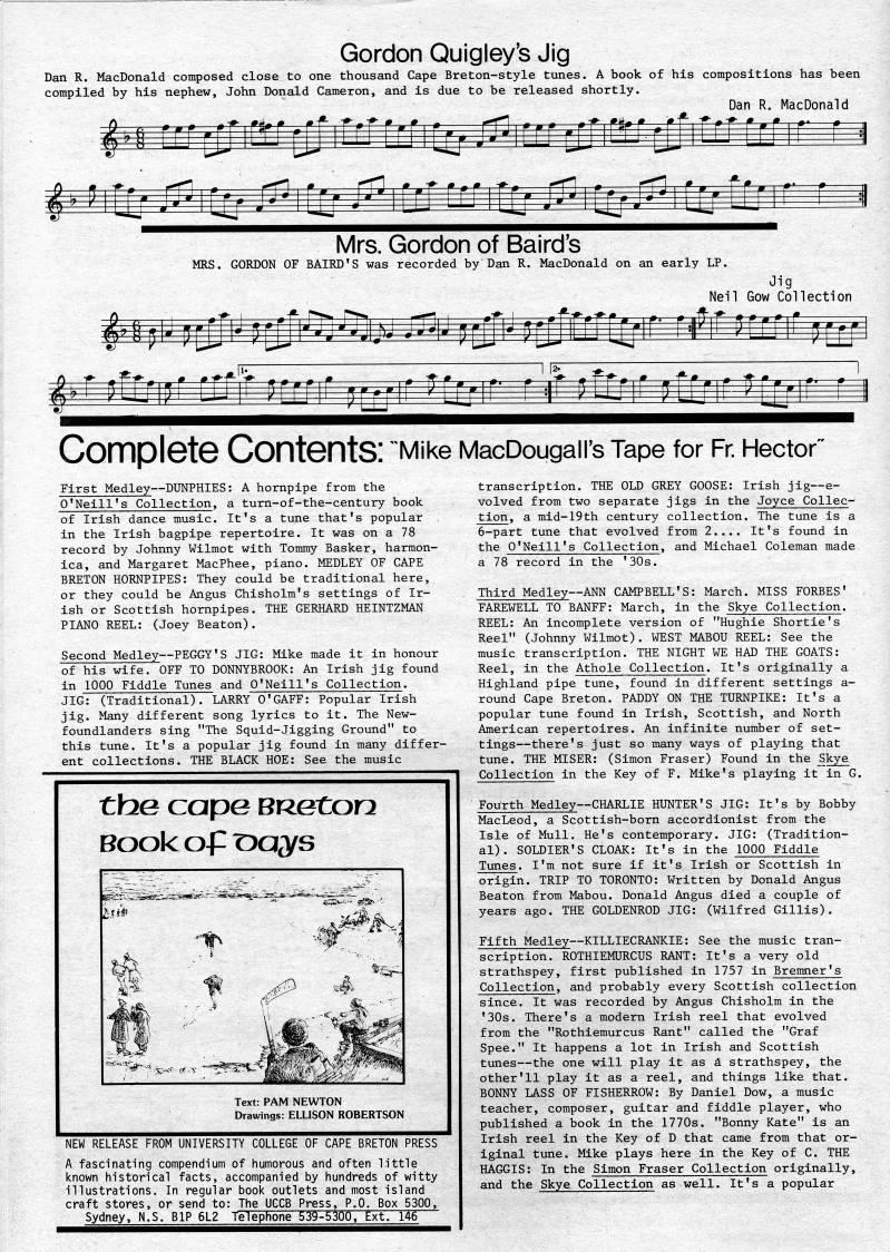 Gordon Quigley's Jig Dan R. MacDonald composed close to one thousand Cape Breton-style tunes. A book of his compositions has been compiled by his nephew, John Donald Cameron, and is due to be released shortly. Dan R. MacDonald Mrs. Gordon of Baird's MRS. GORDON OF BAIRD'S was recorded by Dan R. MacDonald on an early LP. Jig Neil Gow Collection -g • r III • ]*"l - • >-p-|J '', 'J'rTrr r rjifif rr - |1- 1 |2. :-- 1 Complete Contents: "Mike MacDougairs Tape for Fr. Hector" First Medley • DUNPHIES: A hornpipe from the O'Neill's Collection, a turn-of-the-century book of Irish dance music. It's a tune that's popular in the Irish bagpipe repertoire. It was on a 78 record by Johnny Wilmot with Tommy Basker, harmon? ica, and Margaret MacPhee, piano. MEDLEY OF CAPE BRETON HORNPIPES: They could be traditional here, or they could he Angus Chisholm's settings of Ir? ish or Scottish hornpipes. THE GERHARD HEINTZMAN PIANO REEL: (Joey Beaton). Second Medley • PEGGY'S JIG: Mike made it in honour of his wife. OFF TO DONNYBROOK: An Irish jig found in 1000 Fiddle Tunes and O'Neill's Collection. JIG: (Traditional). LARRY O'GAFF: Popular Irish jig. Many different song lyrics to it. The New? foundlanders sing "The Squid-Jigging Ground" to this tune. It's a popular jig found in many differ? ent collections. THE BLACK HOE: See the music tbe cape Brz&Con; Boole of T>oys Text: PAM NEWTON Drawings: ELLISON ROBERTSON NEW RELEASE FROM UNIVERSITY COLLEGE OF CAPE BRETON PRESS A fascinating compendium of humorous and often little known historical facts, accompanied by hundreds of witty illustrations. In regular book outlets and most island craft stores, or send to: The UCCB Press, P.O. Box 5300, Sydney, N.S. BIP 6L2 Telephone 539-5300, Ext. 146 transcription. THE OLD GREY GOOSE: Irish jig • e? volved from two separate jigs in the Joyce Collec? tion, a mid-19th century collection. The tune is a 6-part tune that evolved from 2.... It's found in the O'Neill's Collection, and Michael Coleman made a 78 record in the '30s. Third Medley • ANN CAMPBELL'S: March. MISS FORBES' FAREWELL TO BANFF: March, in the Skye Collection. REEL: An incomplete version of "Hughie Shortie's Reel" (Johnny Wilmot). WEST MABOU REEL: See the music transcription. THE NIGHT WE HAD THE GOATS: ' Reel, in the Athole Collection. It's originally a Highland pipe tune, found in different settings a- round Cape Breton. PADDY ON THE TURNPIKE: It's a popular tune found in Irish, Scottish, and North American repertoires. An infinite number of set? tings • there's just so many ways of playing that tune. THE MISER: (Simon Fraser) Found in the Skye Collection in the Key of F. Mike's playing it in G. Fourth Medley • CHARLIE HUNTER'S JIG: It's by Bobby MacLeod, a Scottish-born accordionist from the Isle of Mull. He's contemporary. JIG: (Tradition? al). SOLDIER'S CLOAK: It's in the 1000 Fiddle Tunes. I'm not sure if it's Irish or Scottish in origin. TRIP TO TORONTO: Written by Donald Angus Beaton from Mabou. Donald Angus died a couple of years ago. THE GOLDENROD JIG: (Wilfred Gillis). Fifth Medley • KILLIECRANKIE: See the music tran? scription. ROTHIEMURCUS RANT: It's a very old strathspey, first published in 1757 in Bremner's Collection, and probably every Scottish collection since. It was recorded by Angus Chisholm in the '30s. There's a modern Irish reel that evolved from the "Rothiemurcus Rant" called the "Graf Spee." It happens a lot in Irish and Scottish tunes • the one will play it as A strathspey, the other'11 play it as a reel, and things like that. BONNY LASS OF FISHERROW: By Daniel Dow, a music teacher, composer, guitar and fiddle player, who published a book in the 1770s. "Bonny Kate" is an Irish reel in the Key of D that came from that or? iginal tune. Mike plays here in the Key of C. THE HAGGIS: In the Simon Fraser Collection originally, and the Skye Collection as well. It's a popular