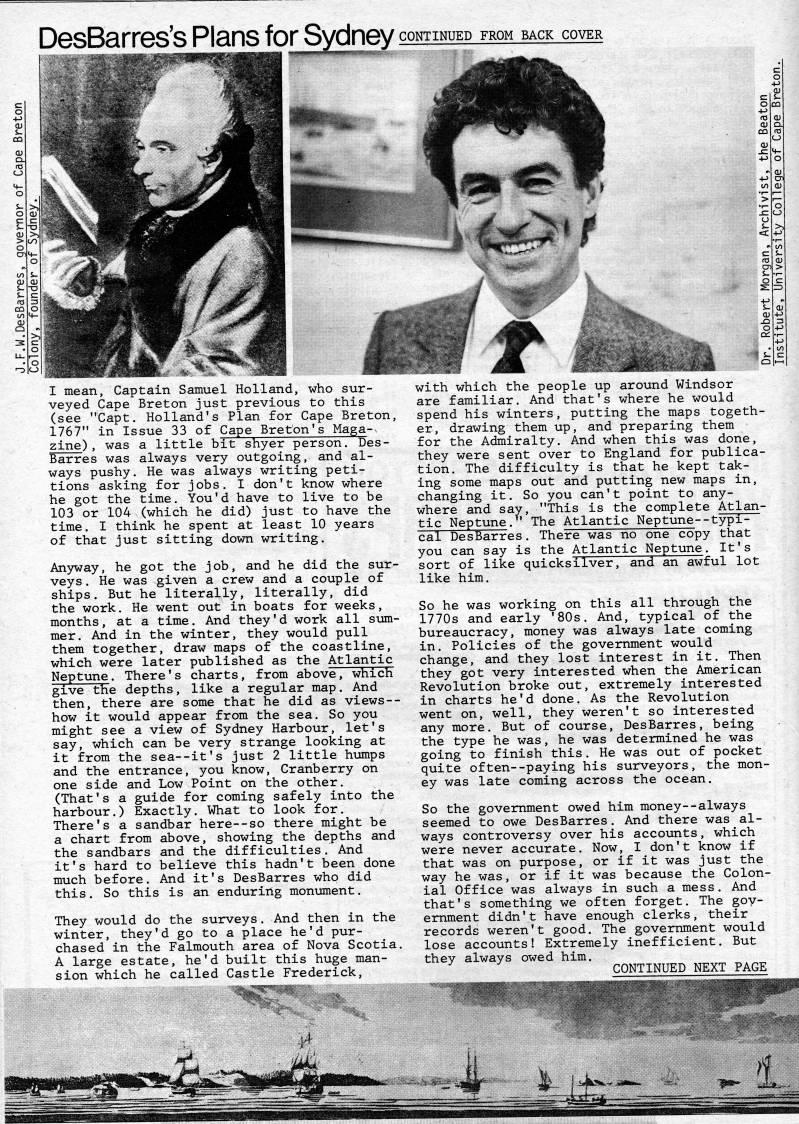 Published by Ronald Caplan on 1985/1/1 (342 reads)DesBarres's Plans for Sydney CONTINUED FROM BACK COVER I mean, Captain Samuel Holland, who sur? veyed Cape Breton just previous to this (see "Capt. Holland's Plan for Cape Breton, 1767" in Issue 33 of Cape Breton's Maga-. zine), was a little bit shyer person. Des- Barres was always very outgoing, and al? ways pushy. He was always writing peti? tions asking for jobs. I don't know where he got the time. You'd have to live to be 103 or 104 (which he did) just to have the time. I think he spent at least 10 years of that just sitting down writing. An3rway, he got the job, and he did the sur? veys . He was given a crew and a couple of ships. But he literally, literally, did the work. He went out in boats for weeks, months, at a time. And they'd work all siom- mer. And in the winter, they would pull them together, draw maps of the coastline, which were later published as the Atlantic Neptune. There's charts, from above, which give the depths, like a regular map. And then, there are some that he did as views-- how it would appear from the sea. So you might see a view of Sydney Harbour, let's say, which can be very strange looking at it from the sea--it's just 2 little humps and the entrance, you know, Cranberry on one side and Low Point on the other. (That's a guide for coming safely into the harbour.) Exactly. What to look for. There's a sandbar here--so there might be a chart from above, showing the depths and the sandbars and the difficulties. And it's hard to believe this hadn't been done much before. And it's DesBarres who did this. So this is an enduring monument. They would do the surveys. And then in the winter, they'd go to a place he'd pur? chased in the Falmouth area of Nova Scotia. A large estate, he'd built this huge man? sion which he called Castle Frederick, with which the people up around Windsor are familiar. And that's where he would spend his winters, putting the maps togeth? er, drawing them up, and preparing them for the Admiralty. And when this was done, they were sent over to England for publica? tion. The difficulty is that he kept tak? ing some maps out and putting new maps in, changing it. So you can't point to any? where and say, "This is the complete Atlan? tic Neptune.'' The Atlantic Neptune--typi? cal DesBarres. There was no one copy that you can say is the Atlantic Neptune. It's sort of like quicksilver, and an awful lot like him. So he was working on this all through the 1770s and early '80s. And, typical of the bureaucracy, money was always late coming in. Policies of the government would change, and they lost interest in it. Then they got very interested when the American Revolution broke out, extremely interested in charts he'd done. As the Revolution went on, well, they weren't so interested any more. But of course, DesBarres, being the type he was, he was determined he was going to finish this. He was out of pocket quite often--paying his surveyors, the mon? ey was late coming across the ocean. So the government owed him money--always seemed to owe DesBarres. And there was al? ways controversy over his accounts, which were never accurate. Now, I don't know if that was on purpose, or if it was just the way he was, or if it was because the Colon? ial Office was always in such a mess. And that's something we often forget. The gov? ernment didn't have enough clerks, their records weren't good. The government would lose accounts! Extremely inefficient. But they always owed him. CONTINUED NEXT PAGE