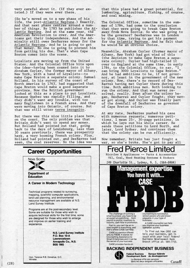 Published by Ronald Caplan on 1985/1/1 (287 reads)very careful about it. (If they ever ex? isted.) If they were ever there. (So he's moved on to a new phase of his life, the post-Atlantic Neptune.) Exactly. And that next phase centres around a num? ber of things. By 1783 he publishes the At? lantic Neptunee And at the same year, the American Revolution is over. And the Amer? icans get their independence. And the Ad? miralty still owes DesBarres money for the Atlantic Neptune. And he is going to get that money. No one is going to prevent him from getting his due. That's when Cape Breton comes into the scene. Loyalists are moving up from the United States. And the Colonial Office hits upon the idea--having been coaxed into it by Abraham Cuyler, the former mayor of Albany, New York, with a band of Loyalists--to make Cape Breton a separate colony. Samuel Holland, in his survey of the coast of North America in 1763, had suggested that Cape Breton would make a good separate province. Now the British government looked at this as a place to put Loyalists. Because Quebec was rapidly filling, and they didn't want any trouble, with too many Englishmen in a French area. And they were moving into Ontario, of course. But that was still utter terra incognito. But there was this nice little place here, on the coast. The only problem was that Britain didn't want to spend any money. But Holland had pointed out that, going back to the days of Louisbourg, less than 30 years previously, there was prosperity here, a very booming French colony. Plus, Holland had pointed out, and DesBarres had seen, the coal reserves. So the idea was that this place had a great potential, for lumbering, agriculture, fishing, of course, and coal mining. The Colonial Office, sometime in the sum? mer of 1784, had come to the conclusion that they were going to break Cape Breton away from Nova Scotia. So who was going to be the governor? DesBarres was in London by that time, trying to get his pa5niient for the Atlantic Neptune. And he felt that he would be an obvious choice. Meanwhile, Abraham Cuyler (former mayor of Albany, New York) had got wind of this (the decision to make Cape Breton a sepa? rate colony). Cuyler had high-tailed it over to England at the same time, in early 1784, to the Colonial Office, to say, "I can bring 3000 Loyalists to Cape Breton." And he had ambitions to be, if not gover? nor, at least in the government of the new colony. Now, there's no record of Des? Barres having met Cuyler there during this time. Both ambitious men. Both looking to run the colony. And that was never re? solved, really. Even after the colony be? gan, DesBarres and Cuyler fought; they nev? er got along. And Cuyler was finally part of the downfall of DesBarres as governor of Cape Breton colony. At any rate, DesBarres pushed his case with numerous requests, numerous peti? tions, I mean 25-, 30-page petitions, in which he lays out his whole career. He sends these petitions to Lord North, and later. Lord Sydney. And convinces them that the colony can be run efficiently. Now remember, Britain has just fought a war, so she's broke. She's got to pay all ' Career Opportunities Nova Scotia Department of Education A Career in Modern Technology Technical programs related to surveying, mapping, scientific computer applications, land-use planning, and environmental resource management are available at N.S. Land Survey Institute. Programs are at the post-secondary level. Some are suitable for those who wish to acquire technical skills for the first time; some are designed for those who wish to enlarge and improve on earlier training and experience. N.S. Land Survey Institute P.O. Box 10-A Lawrencetown Annapolis Co., N.S. BOS 1IVI0 Hon. Terence R.B. Donahoe, Q.C. Minister • 1 • ?'> I ?? ?? ?? I ' Frea Kierce Limitea Bicycles & Appliances • Parts & Accessories Oil, Coal, Wood Heating Systems & Stokers 249 Charlotte St., Sydney, N. S. (564-8484) 7 snn an pay exp F sta tlia C onl Co Sm the C Bi Managemfiiit expertise. You have it with... CASE FBDB he challenge of running a counselling Cy successful, all business: you have to be retired people who are knowl- sxpert at everything... from edgeable in your type of roll to profits, inventory to business, orts, cash flow to promotion. p' CASE counsellor can help act is, you can't be an in- you improve your business nt expert in everything, and operation, quickly, 's where CASE can help. :ase is a service offered , j? ''"' out how CASE can y by FBDB. It stands for help your business, get in jnselling Assistance to touch with your local Federal all Enterprises and it can be Business Development Bank secret of your success. Branch office at: 564-7710. ;aSE provides hands-on aCKING INDEPENDENT BUSINESS ifl'' Federal Business Banque federale • QBT Development Bank de developpement '??'' La Banque offre ses services dans les deux langues officielles. CanadV > (28)