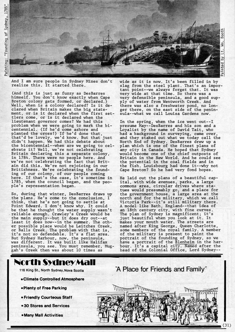 Published by Ronald Caplan on 1985/1/1 (280 reads)Ill And I am sure people in Sydney Mines don't realize this. It started there. (And this is just as fuzzy as DesBarres himself • You don't know exactly when Cape Breton colony gets formed, or declared.) Well, when is a colony declared? Is it de? clared when Britain makes the big state? ment, or is it declared when the first set? tlers come, or is it declared when the lieutenant governor comes? We had this problem when we were going to mark the bi? centennial. (If he'd come ashore and planted the cross!) If he'd done that, that'd be lovely, we'd know. But that just didn't happen. We had this debate about the bicentennial--when are we going to cel? ebrate it? Well, we're not celebrating Britain declaring this a separate colony, in 1784. There were no people here. And we're not celebrating the fact that Brit? ain did this. We're not rejoicing in our Britishness. We're celebrating the found? ing of our colony, of our people coming here. If that's the case, it's sometime in 1785, when the council began, and the peo? ple's representation began. So, during that winter, DesBarres draws up the plans. He's come to the conclusion, I think, that he's not going to settle at Point Edward. I don't know why. It could be that he thought the water supply wasn't reliable enough. Crawley's Creek would be the main supply--but it does dry out--at least it does now--in the summer. The oth? er possible place would be Leitches Creek, or Balls Creek. The problem with that is, it's not so defendable. It's a flat area. But Sydney Harbour, now, the peninsula, was different. It was built like Halifax peninsula, you see. You must remember, Mug- gah's Creek then was about 10 times as wide as it is now. It's been filled in by slag from the steel plant. That's an impor? tant point--we always forget that. It was very wide at that time. So there was a very defensible peninsula, and a good sup? ply of water from Wentworth Creek. And there was also a freshwater pond, no lon? ger there, on the east side of the penin? sula- -what we call Louisa Gardens now. In the spring, when the ice went out--I presume May--DesBarres and his son and a Loyalist by the name of David Tait, who had a background in surveying, came over, and they staked out what we today call the North End of Sydney. DesBarres drew up a plan which is one of the finest plans of any city in Canada. He hoped that Sydney would become one of the chief outposts of Britain in the New World. And he could see the potential in the coal fields and in the fish. Louisbourg had done it--why not Cape Breton? So he had very fond hopes. He laid out the plans of a beautiful cap? ital, with wide avenues, parks, a large commons area, circular drives where sta? tues would presumably go, and a place for the government house, a large area at the north end for the military, which we call Victoria Park--it's still military there. A model like Bath, England--that idea of an 18th century city, with fine curves. The plan of Sydney is magnificent; it's just beautiful when you look at it. It makes your mouth water. The streets are named after King George, Queen Charlotte, some members of the royal family. A member of the military is present to paint the portrait of the founding of Sydney, so we have a portrait of the Blenheim in the har? bour. It's a capital city. Named after the head of the Colonial Office, Lord Sydney-- North Sydney Mall 116 King St., North Sydney, Nova Scotia • Climate Controlled Atmosphere • Plenty of Free Parking • Friendly Courteous Staff • 30 Stores and Services • Many Mall Activities A Place for Friends and Family" I (31)