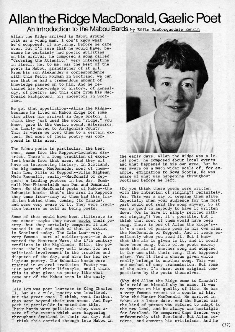 Allan the Ri(dge MacDonaW, Gaelic Poet An Introduction to the Mabou Bar(ds by Effie Maccorguodaie Rankin Allan the Ridge arrived in Mabou around 1816 as a young man. I don't know what he'd composed, if anything, before he came over. But I'm sure that he would have, be? cause he certainly had poetic abilities on his arrival. He composed a song called "Crossing the Atlantic," very interesting in itself. He, to me, was the best of the poets in Mabou, grandfather of it all. From his son Alexander's correspondence with this Keith Norman in Scotland, we can see that he had a tremendous amount of knowledge passed on to him. And he re? tained his knowledge of history, of geneal? ogy, of poetry; and this came from his Mac? Donald background, his ancestors in Scot? land. He got that appellation--Allan the Ridge-- because he lived on Mabou Ridge for some time after his arrival in Cape Breton. I think they just used the word "ridge," you know, gave it the Gaelic sound. Afterwards, the family moved to Antigonish County. This is where we lost them to a certain ex? tent. But most of their poetry was com? posed in this area. The Mabou poets in particular, the best ones, came from the Keppoch-Lochaber dis? trict. There's a long tradition of excel? lent bards from that area. And they all have an interesting history. In Scotland, the big names, MacDonalds, most of them-- lain Lom, Silis of Keppoch--Silis Nighean Mhic Raonaill, really--MacDonald of Kep? poch, a leading poetess in her day, Domh- null Mac-Fhiunnlaidh nan Dan and Domhnull Donn. So the MacDonald poets of Mabou--the Bohuntin bards; that's the area in Keppoch they came from--many of them had this tra? dition behind them, coming (to Canada), and were very aware of it. They were tradi? tion bearers as well as being poets. Some of them could have been illiterate in one sense--maybe they never wrote their po? etry- -but they certainly composed it and passed it on. And much of that is extant in Scotland today. The Iain Lom--very, very famous, sort of soldier-poet--he docu? mented the Montrose Wars, the 17th century conflicts in the Highlands. Silis, the po- etess--she's also very well known for her political involvement in the troubles and disputes of the day, and also for her re? ligious poetry. The Bohuntin bards were trained in an oral tradition. Poetry was just part of their lifestyle, and I think this is what gives us poetry like what came out of the Mabou area in the early Iain Lom was poet laureate to King Charles II. But as a rule, poetry was localized. But the great ones, I think, went further, they went beyond their own areas. And Kep? poch in particular is noted for this. Their bards were political--they were a- ware of the events which were happening throughout Scotland in their own day. And I think this carried through into Mabou in the early days. Allan the Ridge was a lo? cal poet; he composed about local events and what happened in his own area. But he was aware on a much wider scale of, for ex? ample, emigration to Nova Scotia. He was aware of what was happening throughout Scotland before he left. (Do you think these poems were written with the intention of singing?) Definitely. Yes. This was a way of keeping them alive. Especially when your audience for the most part could not read the song anyway. So it was no good to anybody to have it written down. (Or to have it simply recited with? out singing?) Yes, it's possible, but I think that most of them would have been sung. There is one of Allan the Ridge's-- it's a sort of praise poem to his own clan, the MacDonalds of Keppoch. And it reads ex? cellently when you read it. But I know that the air is given to it, and it would have been sung. Quite often poets merely took the air of another song and adapted it for use with their song. That happened often. You'll find a chorus given which really belongs to another song. This was one method of easy transmission. But some of the airs, I'm sure, were original com? positions by the poets themselves. (Why did Allan the Ridge come to Canada?) He's told us himself why he came. It was to improve on his quality of life. He has a very famous retort to a cousin of his, John the Hunter MacDonald. He arrived in Mabou at a later date. And the Hunter was the kind of person who refused to adapt to the new land, and he always was nostalgic for Scotland. He compared Cape Breton very unfavourably with Scotland. But Allan re? torts, and answers his criticisms. And he (37)