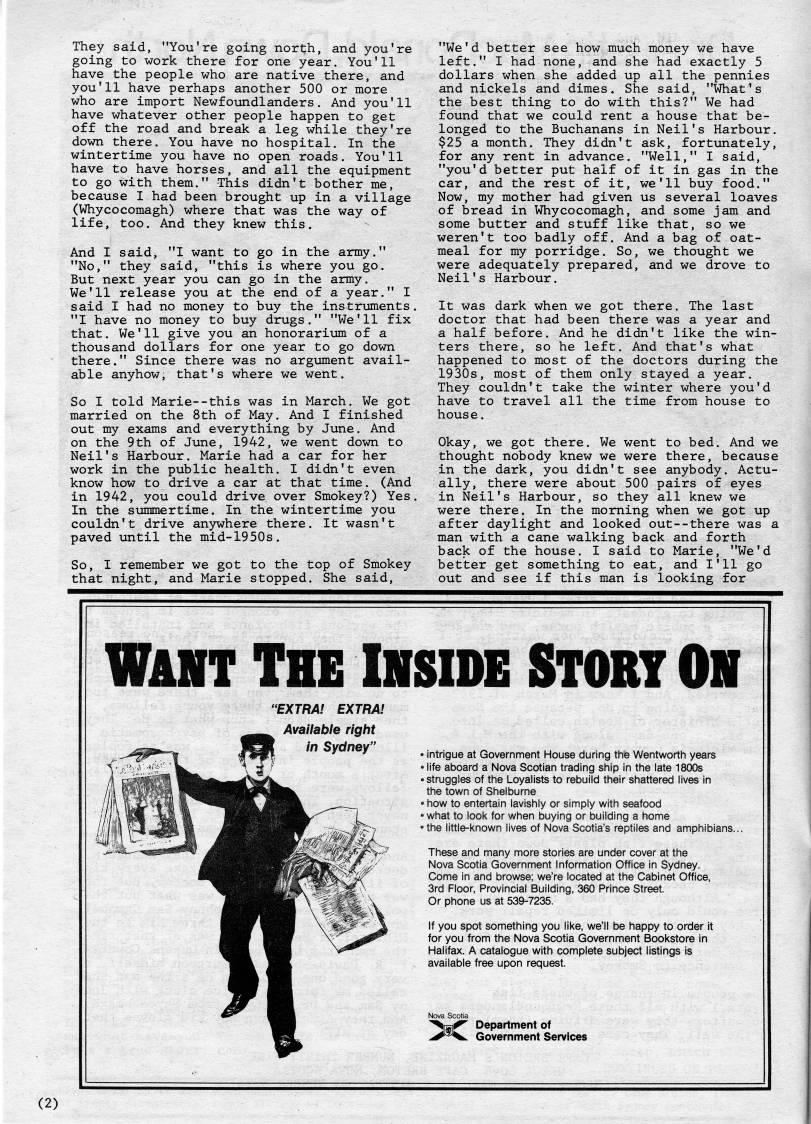 Published by Ronald Caplan on 1985/6/1 (446 reads)They said, "You're going north, and you're going to work there for one year. You'll have the people who are native there, and you'll have perhaps another 500 or more who are import Newfoundlanders. And you'll have whatever other people happen to get off the road and break a leg while they're down there. You have no hospital. In the wintertime you have no open roads. You'll have to have horses, and all the equipment to go with them." This didn't bother me, because I had been brought up in a village (Whycocomagh) where that was the way of life, too. And they knew this. And I said, "I want to go in the army." "No," they said, "this is where you go. But next year you can go in the army. We'll release you at the end of a year." I said I had no money to buy the instruments. "I have no money to buy drugs." "We'll fix that. We'll give you an honorarium of a thousand dollars for one year to go down there." Since there was no argument avail? able anyhow, that's where we went. So I told Marie--this was in March. We got married on the 8th of May. And I finished out my exams and everything by June. And on the 9th of June, 1942, we went down to Neil's Harbour. Marie had a car for her work in the public health. I didn't even know how to drive a car at that time. (And in 1942, you could drive over Smokey?) Yes. In the summertime. In the wintertime you couldn't drive anywhere there. It wasn't paved until the mid-1950s. So, I remember we got to the top of Smokey that night, and Marie stopped. She said. "We'd better see how much money we have left." I had none, and she had exactly 5 dollars when she added up all the pennies and nickels and dimes. She said, "What''s the best thing to do with this?" We had found that we could rent a house that be? longed to the Buchanans in Neil's Harbour. $25 a month. They didn't ask, fortunately, for any rent in advance. "Well," I said, "you'd better put half of it in gas in the car, and the rest of it, we'll buy food." Now, my mother had given us several loaves of bread in Whycocomagh, and some jam and some butter and stuff like that, so we weren't too badly off. And a bag of oat? meal for my porridge. So, we thought we were adequately prepared, and we drove to Neil's Harbour. It was dark when we got there. The last doctor that had been there was a year and a half before. And he didn't like the win? ters there, so he left. And that's what happened to most of the doctors during the 1930s, most of them only stayed a year. They couldn't take the winter where you'd have to travel all the time from house to house. Okay, we got there. We went to bed. And we thought nobody knew we were there, because in the dark, you didn't see anybody. Actu? ally, there were about 500 pairs of eyes in Neil's Harbour, so they all knew we were there. In the morning when we got up after daylight and looked out--there was a man with a cane walking back and forth back of the house. I said to Marie, "We'd better get something to eat, and I'll go out and see if this man is looking for Want the Ihside Stort Oh EXTRA! EXTRA! Available right in Sydney" • intrigue at Government House during thfe Wentworth years • life aboard a Nova Scotian trading ship in the late 1800s • struggles of the Loyalists to rebuild their shattered lives in the town of Shelburne • how to entertain lavishly or simply with seafood • what to look for when buying or building a home • the little-known lives of Nova Scotia's reptiles and amphibians.. These and many more stories are under cover at the Nova Scotia Government Information Office in Sydney. Gome in and browse; we're located at the Cabinet Office, 3rd Floor, Provincial Building, 360 Prince Street. Or phone us at 539-7235. If you spot something you like, we'll be happy to order it for you from the Nova Scotia Government Bookstore in Halifax. A catalogue with complete subject listings is available free upon request. Department of Government Services (2)