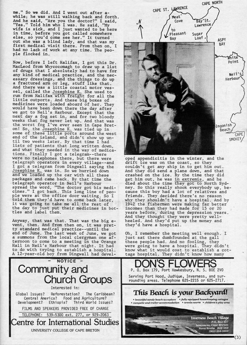 Published by Ronald Caplan on 1985/6/1 (345 reads)me." So we did. And I went out after a- while; he was still walking back and forth. And he said, "Are you the doctor?" I said, "Yes." Told him who I was. He said, "My wife is sick, and I just wanted to be here in time, before you got called somewhere else, so you'd come see her." It turned out she was a blind lady, and that was my first medical visit there. From then on, I had no lack of work at any time. The peo? ple flocked in. Now, before I left Halifax, I got this Dr. MacLeod from Whycocomagh to draw up a list of drugs that I absolutely had to have for any kind of medical practice, and the nec? essary dressings, and the things to do up a fractured arm or leg, stuff like that. And there was a little coastal motor ves? sel, called the Josephine K She used to run from Halifax with freight for all the little outports. And these big boxes of medicines were loaded aboard of her. They would have been down there the day after we got to Neil's Harbour. Except that the next day a fog set in, and for two bloody weeks that fog never let up. And that was the worst fog I've ever seen in Cape Bret? on! So, the Josephine K. was tied up in some of these little ports around the -west end of the island, and didn't show up un? til two weeks later. By that time I had lists of patients that long written down, and what they needed in the way of medica? tions. Finally I got a telegram--there were no telephones there, but there were telegraph operators in every village--and I got a telegram from Dingwall saying the Josephine K. was in. So we hurried down and we loaded up the car with all these packages and came back. By that time the telegraph operator in Neil's Harbour spread the word, "The doctor got his medi? cines." I got back. This long line of peo? ple were at the office door waiting. So I told them they'd have to come back later, it was going to take me alii the rest of the day to just put their medicines in bot? tles and label them. Anyway, that was that. That was the big e- vent, then. And from then on, it was pret? ty standard medical practice--until the end of June. The last week of June, we got a summons from the local clergyman one af? ternoon to come to a meeting in the Orange Hall in Neil's Harbour that night. It had to do with trying to establish a hospital. A 12-year-old boy from Dingwall had devel- CAPE ST. VJRENCE CAPE NORTH I Meat '' ' Cove Bay*St. / / Lawrence/ / /to J.pieasant s'gar ' Bay Loaf ' ''py BAY .1 W'' '' SMOKEY/ oped appendicitis in the winter, and the drift ice was on the coast, so they couldn't get any ship in to get him out. And they did send a plane down, and that crashed on the ice. By the time they did get him out, he was in extremis, and he died about the time they got to North Syd? ney. So this really shook everybody up, be? cause this boy had a lot of relatives and friends. They decided there's no reason why they shouldn't have a hospital. And by 1942 the fishermen were making far better incomes than they had made for 15 or 20 years before, during the depression years. And they thought they were pretty well- heeled. And they'd put up the money and they'd have a hospital. Oh, I remember the meeting well enough. I just sat there dumbfounded at the gall these people had. And no fooling, they were going to have a hospital. They didn't know what it would cost to establish a cot? tage hospital. They didn't know how many 1 - NOTICE - Community and Church Groups Interested in: Global Issues? Reforestation? The Caribbean? Central America? Food and Agriculture? Development? Ethiopia? Third World Issues? FILMS AND SPEAKERS PROVIDED FREE OF CHARGE TELEPHONE: 539-5300 ext. 277, or 929-2063 Centre for International Studies UNIVERSITY COLLEGE OF CAPE BRETON DON'S FLOWERS p. 0. Box 179, Port Hawkesbury, N. S. BOE 2V0 Serving Port Hood, Judique, Inverness, and sur? rounding areas. Telephone 625-2215 or 625-2717. Tfus Beach is your Backyard' • beautiful sandy beach to explore * Jully equipped housekeeping cottages * campsite and trailer accommodation * tennis courts * children's play area '''HH||Mtt|'r''''' feii':. '''''''''H '(3)
