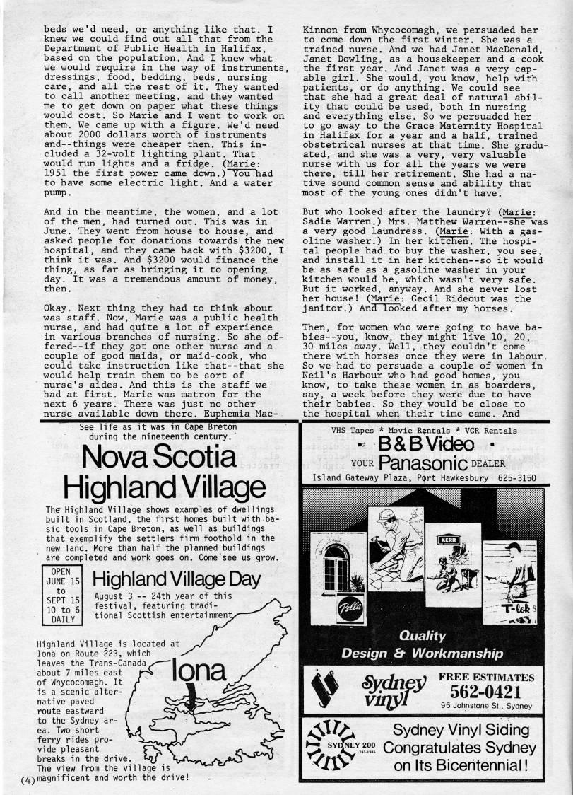 Published by Ronald Caplan on 1985/6/1 (334 reads)beds we'd need, or anything like that. I knew we could find out all that from the Department of Public Health in Halifax, based on the population. And I knew what we would require in the way of instruments, dressings, food, bedding, beds, nursing care, and all the rest of it. They wanted to call another meeting, and they wanted me to get down on paper what these things would cost. So Marie and I went to work on them. We came up with a figure. We'd need about 2000 dollars worth of instriiments and--things were cheaper then. This in? cluded a 32-volt lighting plant. That would run lights and a fridge. (Marie: 1951 the first power came down.) You had to have some electric light. And a water pump. And in the meantime, the women, and a lot of the men, had turned out. This was in June. They went from house to house, and asked people for donations towards the new hospital, and they came back with $3200, I think it was. And $3200 would finance the thing, as far as bringing it to opening day. It was a tremendous amount of money, then. Okay. Next thing they had to think about was staff. Now, Marie was a public health nurse, and had quite a lot of experience in various branches of nursing. So she of? fered- -if they got one other nurse and a couple of good maids, or maid-cook, who could take instruction like that--that she would help train them to be sort of nurse's aides. And this is the staff we had at first. Marie was matron for the next 6 years. There was just no other nurse available down there. Euphemia Mac? Kinnon from Whycocoraiagh, we persuaded her to come down the first winter. She was a trained nurse. And we had Janet MacDonald, Janet Dowling, as a housekeeper and a cook the first year. And Janet was a very cap? able girl. She would, you know, help with patients, or do anything. We could see that she had a great deal of natural abil? ity that could be used, both in nursing and everything else. So we persuaded her to go away to the Grace Maternity Hospital in Halifax for a year and a half, trained obstetrical nurses at that time. She gradu? ated, and she was a very, very valuable nurse with us for all the years we were there, till her retirement. She had a na? tive sound common sense and ability that most of the young ones didn't have. But who looked after the laundry? (Marie: Sadie Warren.) Mrs. Matthew Warren--she was a very good laundress. (Marie: With a gas? oline washer.) In her kitchen. The hospi? tal people had to buy the washer, you see, and install it in her kitchen--so it would be as safe as a gasoline washer in your kitchen would be, which wasn't very safe. But it worked, anyway. And she never lost her house! (Marie: Cecil Rideout was the janitor.) And looked after my horses. Then, for women who were going to have ba- bies--you, know, they might live 10, 20, 30 miles away. Well, they couldn't come there with horses once they were in labour. So we had to persuade a couple of women in Neil's Harbour who had good homes, you know, to take these women in as boarders, say, a week before they were due to have their babies. So they would be close to the hospital when their time came. And See life as it was in Cape Breton during the nineteenth century. Nova Scotia Highland Village The Highland Village shows examples of dwellings built in Scotland, the first homes built with ba? sic tools in Cape Breton, as well as buildings that exemplify the settlers firm foothold in the new land. More than half the planned buildings are completed and work goes on. Come'see us grow. Highland Village Day August 3 • 24th year of this festival, featuring tradi? tional Scottish entertainments VHS Tapes * Movie Rentals * VCR Rentals - B&BVideo; - YOUR Panasonic i'EALER Island Gateway Plaza, Pprt Hawkesbury 625-3150 OPEN JUNE 15 to SEPT 15 10 to 6 DAILY Highland Village is located at lona on Route 223, which leaves the Trans-Canada about 7 miles east of Whycocomagh. It is a scenic alter? native paved route eastward to the Sydney ar? ea. Two short ferry rides pro? vide pleasant breaks in the drive. The view from the village is (4)magnificent and worth the drive! ' Sydney vii'l FREE ESTIMATES 562-0421 95 Johnstone St., Sydney -? SYE/nEY 200 Sydney Vinyl Siding Congratulates Sydney on Its Bicentennial!