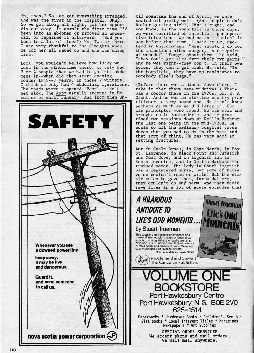 Published by Ronald Caplan on 1985/6/1 (303 reads)in, then." So, we got everything arranged. She was the first in the hospital. Okay. So we got along all right, got her appen? dix out okay. It wasn't the first time I'd been into an abdomen or removed an appen? dix, or repaired it afterwards. (Had you been in a lot of times?) No. Two or three. I was very thankful to the Almighty when we got her all sewed up and she was doing fine. Look, you wouldn't believe how lucky we were in the wintertime there. We only had 3 or 4 people that we had to go into abdo? mens in--when did they start opening roads? 1949--7 years. In those 7 winters, I think we only had 4 abdominal operations. The roads weren't opened. People didn't get sick. The Aspy usually stopped in De- cember or early January. And from then un- SAFETY keep away, it may be live and dangerous. Guard it, and send someone to cail us. nova scotia power corporation til sometime the end of April, we were sealed off pretty well. (And people didn't bother getting sick?) That's right. And you know, in the hospitals in those days, we were terrified of infection, postopera? tive infections. We had no antibiotics--it was before that time. I said to Dr. Mac? Leod in Whycocomagh, "What should I do for the infections after surgery, and repairs of wounds?" "Forget about them," he said, "they don't get sick from their own germs!" And he was right--they don't. In their own homes, they don't get sick. He said, "In the hospitals, they have np resistance to somebody else's bugs." (Before there was a doctor down there, I take it that there were midwives.) There was a doctor there in the 1920s, Dr. H. A. Grant. And he was an old-time country prac? titioner, a very sound one. He didn't know perhaps as much as we did later on, but his principles were sound. He was bom and brought up in Boularderie. And he prac? tised two sessions down at Neil's Harbour, the last one being in the mid-1920s. He could do all the ordinary surgical proce? dures that you had to do in the home and that sort of thing. He was very good at setting fractures. But in Smelt Brook, in Cape North, in Bay St. Lawrence, in Black Point and Capstick and Meat Cove, and in Ingonish and in South Ingonish, and in Neil's Harbour--he trained women. The lady in South Ingonish was a registered nurse, but some of those women couldn't read or write. But the sim? ple rules he gave them, for midwifery, they couldn't do any'harm. And they could save lives in a lot of acute episodes that AHIIARIOUS ANTIPOTEIO LIFE'S OOP MOMENTS.. by Stuart Trueman This sparkling collection of short pieces and poems, illustrated with the author's own draw? ings, is brimming with the wit and charm that have won Stuart Trueman the Stephen Leacock humour Award and made him one of Canada's best-known and best-loved humorists. Now available in paper $7.95 /''' McClelland and Stewart '*3'The Canadian Publishers VOLUME ONE BOOKSTORE Port Hawkesbury Centre Port Hawkesbury, N. S. BOE 2V0 625-1514 Paperbacks * Hardcover Books * Children's Section Gift Books * Local Interest Titles * Magazines Newspapers * Art Supplies SPECIAL ORDER SERVICES We accept phone and mail orders. We will mail anywhere. (6)