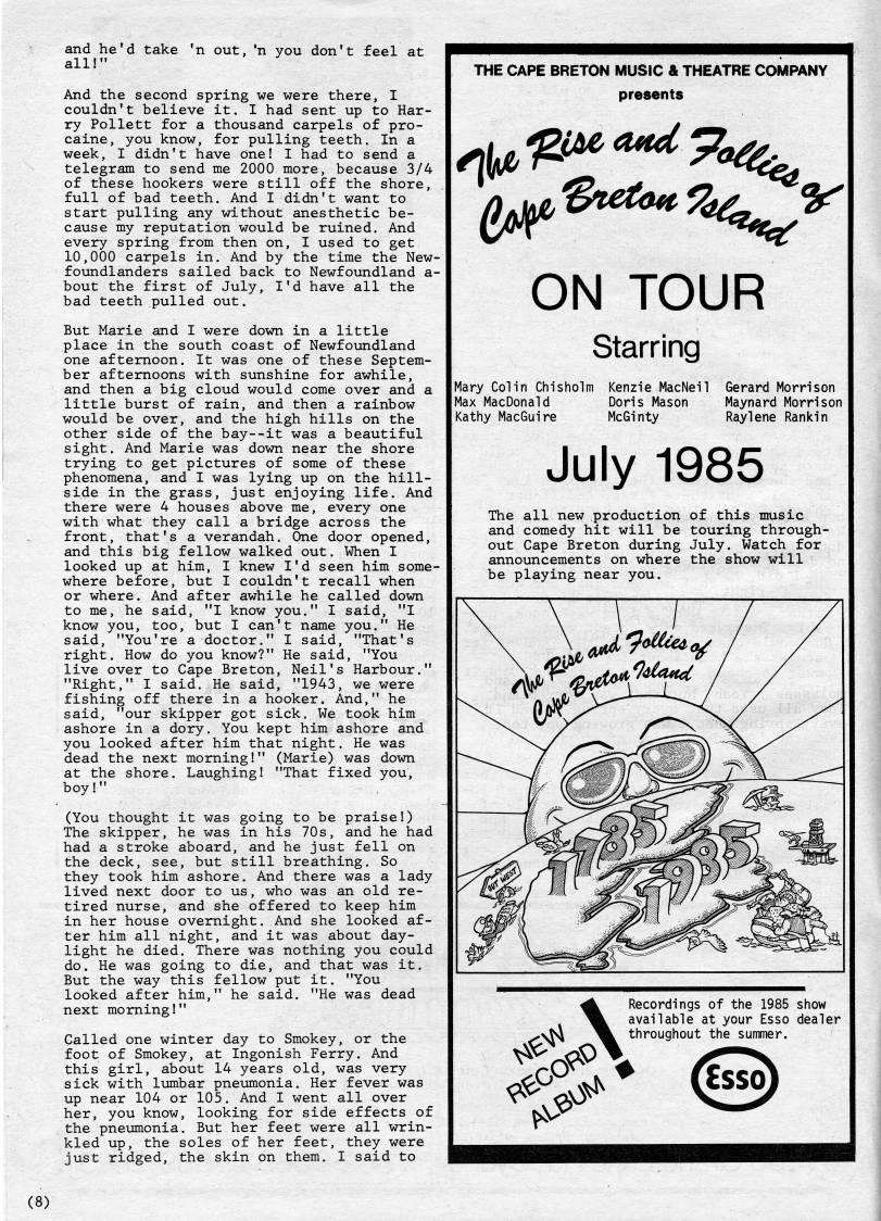Published by Ronald Caplan on 1985/6/1 (325 reads)and he'd take 'n out, 'n you don't feel at all!" And the second spring we were there, I couldn't believe it. I had sent up to Har? ry Pollett for a thousand carpels of pro? caine, you know, for pulling teeth. In a week, I didn't have one! I had to send a telegram to send me 2000 more, because 3/4 of these hookers were still off the shore, full of bad teeth. And I didn't want to start pulling any without anesthetic be? cause my reputation would be ruined. And every spring from then on, I used to get 10,000 carpels in. And by the time the New? foundlanders sailed back to Newfoundland a- bout the first of July, I'd have all the bad teeth pulled out. But Marie and I were down in a little place in the south coast of Newfoundland one afternoon. It was one of these Septem? ber afternoons with sunshine for awhile, and then a big cloud would come over and a little burst of rain, and then a rainbow would be over, and the high hills on the other side of the bay--it was a beautiful sight. And Marie was down near the shore trying to get pictures of some of these phenomena, and I was lying up on the hill? side in the grass, just enjoying life. And there were 4 houses above me, every one with what they call a bridge across the front, that's a verandah. One door opened, and this big fellow walked out. When I looked up at him, I knew I'd seen him some? where before, but I couldn't recall when or where. And after awhile he called down to me, he said, "I know you." I said, "I know you, too, but I can't name you." He said, "You're a doctor." I said, "That's right. How do you know?" He said, "You live over to Cape Breton, Neil's Harbour." "Right," I said. He said, "1943, we were fishing off there in a hooker. And," he said, "our skipper got sick. We took him ashore in a dory. You kept him ashore and you looked after him that night. He was dead the next morning!" (Marie) was down at the shore. Laughing! "That fixed you, boy!" (You thought it was going to be praise!) The skipper, he was in his 70s, and he had had a stroke aboard, and he just fell on the deck, see, but still breathing. So they took him ashore. And there was a lady lived next door to us, who was an old re? tired nurse, and she offered to keep him in her house overnight. And she looked af? ter him all night, and it was about day? light he died. There was nothing you could do. He was going to die, and that was it. But the way this fellow put it. "You looked after him," he said. "He was dead next morning!" Called one winter day to Smokey, or the foot of Smokey, at Ingonish Ferry. And this girl, about 14 years old, was very sick with lumbar pneumonia. Her fever was up near 104 or 105. And I went all over her, you know, looking for side effects of the pneumonia. But her feet were all wrin? kled up, the soles of her feet, they were just ridged, the skin on them. I said to THE CAPE BRETON MUSIC & THEATRE COMPANY presents ON TOUR Starring Mary Colin Chisholm Max MacDonald Kathy MacGuire Kenzie MacNeil Doris Mason McGi nty Gerard Morrison Maynard Morrison Raylene Rankin July 1985 The all new production of this music and comedy hit will be touring through? out Cape Breton during July. Watch for announcements on where the show will be playing near you. Recordings of the 1985 show available at your Esso dealer throughout the summer. (8)