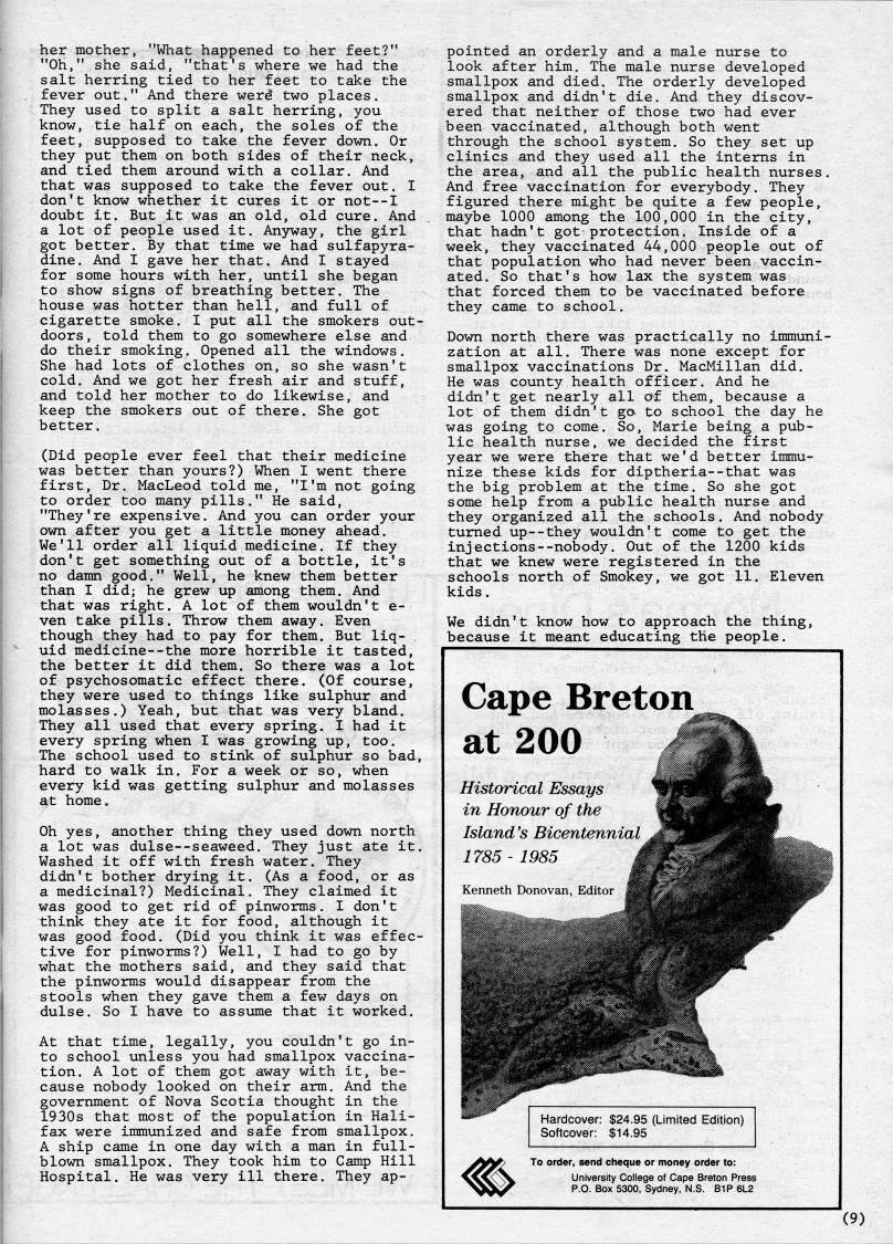 Published by Ronald Caplan on 1985/6/1 (386 reads)her mother, "What happened to her feet?" "Oh," she said, "that's where we had the salt herring tied to her feet to take the fever out." And there wer' two places. They used to split a salt herring, you know, tie half on each, the soles of the feet, supposed to take the fever down. Or they put them on both sides of their neck, and tied them around with a collar. And that was supposed to take the fever out. I don't know whether it cures it or not--I doubt it. But it was an old, old cure. And a lot of people used it. Anyway, the girl got better. By that time we had sulfapyra- dine. And I gave her that. And I stayed for some hours with her, until she began to show signs of breathing better. The house was hotter than hell, and full of cigarette smoke. I put all the smokers out? doors , told them to go somewhere else and do their smoking. Opened all the windows. She had lots of clothes on, so she wasn't cold. And we got her fresh air and stuff, and told her mother to do likewise, and keep the smokers out of there. She got better. (Did people ever feel that their medicine was better than yours?) When I went there first. Dr. MacLeod told me, "I'm not going to order too many pills." He said, "They're expensive. And you can order your own after you get a little money ahead. We'll order all liquid medicine. If they don't get something out of a bottle, it's no damn good." Well, he knew them better than I did; he grew up among them. And that was right. A lot of them wouldn't e- ven take pills. Throw them away. Even though they had to pay for them. But liq? uid medicine--the more horrible it tasted, the better it did them. So there was a lot of psychosomatic effect there. (Of course, they were used to things like sulphur and molasses.) Yeah, but that was very bland. They all used that every spring. I had it every spring when I was growing up, too. The school used to stink of sulphur so bad, hard to walk in. For a week or so, when every kid was getting sulphur and molasses at home. Oh yes, another thing they used down north a lot was dulse--seaweed. They just ate it. Washed it off with fresh water. They didn't bother drying it. (As a food, or as a medicinal?) Medicinal. They claimed it was good to get rid of pinworms. I don't think they ate it for food, although it was good food. (Did you think it was effec? tive for pinworms?) Well, I had to go by what the mothers said, and they said that the pinworms would disappear from the stools when they gave them a few days on dulse. So I have to assume that it worked. At that time, legally, you couldn't go in? to school unless you had smallpox vaccina? tion. A lot of them got away with it, be? cause nobody looked on their arm. And the government of Nova Scotia thought in the 1930s that most of the population in Hali? fax were immunized and safe from smallpox. A ship came in one day with a man in full? blown smallpox. They took him to Camp Hill Hospital. He was very ill there. They ap? pointed an orderly and a male nurse to look after him. The male nurse developed smallpox and died. The orderly developed smallpox and didn't die. And they discov? ered that neither of those two had ever been vaccinated, although both went through the school system. So they set up clinics and they used all the interns in the area, and all the public health nurses. And free vaccination for everybody. They figured there might be quite a few people, maybe 1000 among the 100,000 in the city, that hadn't got protection. Inside of a week, they vaccinated 44,000 people out of that population who had never been vaccin? ated. So that's how lax the system was that forced them to be vaccinated before they came to school. Down north there was practically no immuni? zation at all. There was none except for smallpox vaccinations Dr. MacMillan did. He was county health officer. And he didn't get nearly all o'f them, because a lot of them didn't go- to school the day he was going to come. So, Marie being a pub? lic health nurse, we decided the first year we were th're that we'd better immu? nize these kids for diptheria--that was the big problem at the time. So she got some help from a public health nurse and they organized all the schools. And nobody turned up--they wouldn't come to get the injections--nobody. Out of the 1200 kids that we knew were registered in the schools north of Smokey, we got 11. Eleven kids. We didn't know how to approach the thing, because it meant educating the people. Cape Breton at 200 Historical Essays in Honovr of the Island's Bicentenn ia 1785-1985 Hardcover: $24.95 (Limited Edition) Softcover: $14.95 To order, send cheque or money order to: University College of Cape Breton Press P.O. Box 5300, Sydney, N.S. BIP 6L2 (9)