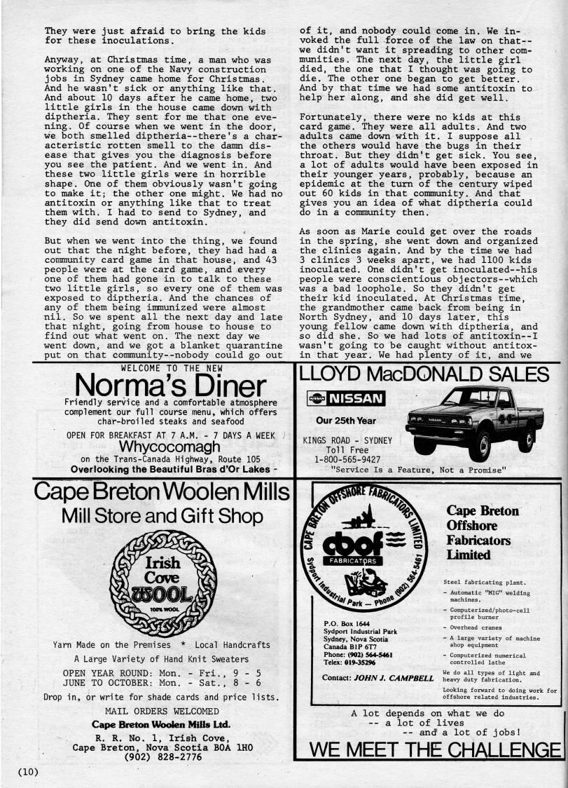 Published by Ronald Caplan on 1985/6/1 (296 reads)They were just afraid to bring the kids for these inoculations. Anyway, at Christmas time, a man who was working on one of the Navy construction jobs in Sydney came home for Christmas. And he wasn't sick or anything like that. And about 10 days after he came home, two little girls in the house came down with diptheria. They sent for me that one eve? ning. Of course when we went in the door, we both smelled diptheria--there's a char? acteristic rotten smell to the damn dis? ease that gives you the diagnosis before you see the patient. And we went in. And these two little girls were in horrible shape. One of them obviously wasn't going to make it; the other one might. We had no antitoxin or anything like that to treat them with. I had to send to Sydney, and they did send down antitoxin. But when we went into the thing, we found out that the night before, they had had a community card game in that house, and 43 people were at the card game, and every one of them had gone in to talk to these two little girls, so every one of them was exposed to diptheria. And the chances of any of them being immunized were almost nil. So we spent all the next day and late that night, going from house to house to find out what went on. The next day we went down, and we got a blanket quarantine put on that community--nobody could go out of it, and nobody could come in. We in? voked the full force of the law on that-- we didn't want it spreading to other com? munities. The next day, the little girl died, the one that I thought was going to die. The other one began to get better. And by that time we had some antitoxin to help her along, and she did get well. Fortunately, there were no kids at this card game. They were all adults. And two adults came down with it. I suppose all the others would have the bugs in their throat. But they didn't get sick. You see, a lot of adults would have been exposed in their younger years, probably, because an epidemic at the turn of the century wiped out 60 kids in that community. And that gives you an idea of what diptheria could do in a community then. As soon as Marie could get over the roads in the spring, she went down and organized the clinics again. And by the time we had 3 clinics 3 weeks apart, we had 1100 kids inoculated. One didn't get inoculated--his people were conscientious objectors--which was a bad loophole. So they didn't get their kid inoculated. At Christmas time, the grandmother came back from being in Nortii Sydney, and 10 days later, this young fellow came down with diptheria, and so did she. So we had lots of antitoxin--I wasn't going to be caught without antitox? in that year. We had plenty of it, and we WELCOME TO THE NEW Norma's Diner Friendly service and a comfortable atmosphere complement our full course menu?? which offers char-broiled steaks and seafood OPEN FOR BREAKFAST AT 7 A.M. - 7 DAYS A WEEK Whycocomagh on the Trans-Canada Highway, Route 105 Overlooking the Beautiful Bras d'Or Lakes - LLOYD MacDONALD SALES Our 25th Year KINGS ROAD - SYDNEY Toll Free 1-800-565-9427 "Service Is a Feature, Not a Promise" Gape Breton Woolen Mills Mill store and Gift Shop Yarn Made on the Premises * Local Handcrafts A Large Variety of Hand Knit Sweaters OPEN YEAR ROUND: Mon. - Fri., 9 - 5 JUNE TO OCTOBER: Mon. - Sat., 8-6 Drop in, or write for shade cards and price lists. MAIL ORDERS WELCOMED Cape Breton Woolen Mills Ltd. R. R. No. 1, Irish Cove, Cape Breton, Cape Breton Offshore Fabricators Limited Steel fabricating plant, - Automatic "MIG" welding P.O. Box 1644 Sydport Industrial Park Sydney, Nova Scotia Canada BIP 6T7 Phone: (902) 564-5461 Telex: 019-35296 Contact: JOHN J. CAMPBELL ?? Computerized/phot profile burner - A large variety of machine shop equipment Nova Scotia BOA IHO (902) 828-2776 A lot depends on what we do --a lot of lives -- and a lot of jobs! WE MEET THE CHALLENGE (10) I