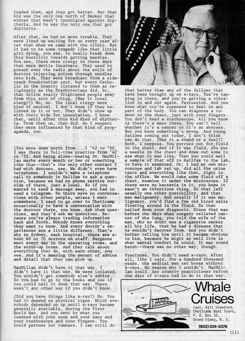 Published by Ronald Caplan on 1985/6/1 (288 reads)loaded them, and they got better. But that kid was the only one north of Smokey that winter that wasn't inoculated against dip? theria. And he was the only one that got diptheria. After that, we had no more trouble. They were lined up waiting for us every year af? ter that when we came with the clinic. But it had to be some tragedy like that little girl dying, you see, to really break down this hostility towards getting needles. You see, there were clergy in those days that were devils incarnate. They used to preach over the radio about the evils of doctors injecting poison through needles into kids. They were broadcast from a side? track Presbyterian sect, but every Catho? lic in the country listened to them as re? ligiously as the Presbyterians did. So, that fellow really frightened people away from this sort of thing. (Was it local clergy?) No, no. The local clergy were kind of neutral. I don't know if they be? lieved in it or not. They didn't show up with their kids for inoculation, I know that, until after this kid died of dipther? ia. From then on, they did. So I suspect they were influenced by that kind of prop? aganda , too. (You were down north from....) '42 to '60. I was there in full-time practice from '42 to '55. And being alone--seeing Dr. MacMil? lan maybe every month or two or something like that--that's the only other contact I had with doctors, see. We didn't even have telephones. I couldn't make a telephone call to somebody in Halifax to ask a ques? tion, because we had no phone service out? side of there, just a local. So if you wanted to send a message away, you had to send a telegram. So there were no conversa? tions with other people, unless I went somewhere. I used to go over to Cheticamp occasionally to have a conversation with the doctors there, you know. Ask them ques? tions, and they'd ask me questions. Be? cause you're always trading information back and forth. Nobody knows everything they want to know. And every doctor's ex? periences are a little different. That's why in Sydney, each hospital, there are a- bout 60 or 70 doctors on staff. Surgeons meet every day in the operating rooms, and the scrub-up rooms. And they talk about everything they do, with each other, you see. And it's amazing the amount of advice and detail that they can pick up. MacMillan didn't have it that way. I didn't have it that way. We were isolated. You couldn't get somebody else's advice. So you had to go to the books and see if you could nail it down that way. There wasn't any other way if you didn't know. (Did you have things like x-ray?) No. You had to depend on physical signs. Which eve? rybody depended on up until x-rays became generally available, during the First World War. And you went by what you learned with your eyes and your ears and your stethoscope and your fingers. You could percuss out tumours. I can still do that better than any of the fellows that have been brought up on x-rays. You're tap? ping in there, and you're getting a vibra? tion in and out again. Percussion. And you know what you're supposed to feel in any part of the body. You can diagnose a tu? mour in the chest, just with your fingers. You don't need a stethoscope. All you know is there's a mass there. You can't tell whether it's a cancer or it's an abscess. But you know something's wrong. And young fellows coming out today, I don't think can do that. (Was it a sound or a feel?) Both, I suppose. You percuss out for fluid in the chest. And if it was fluid, you put a needle in the chest and drew out some to see what it was like. Then you could mail a sample of that off to Halifax to the lab, to have it examined. Or, I had my own mic? roscope and lab set up, did all the urine tests and everything like that, right in the office. We would take some fluid off a chest, examine it under the microscope. If there were no bacteria in it, you knew it wasn't an infectious thing. So that left usually one other possibility, and that was malignancy. And usually if it was ma? lignancy, you'd find a few red blood cells floating around in the fluid. So that nailed down your diagnosis. Since that was before the days when surgery relieved can? cer of the lung, you told the wife of the man, who no doubt was a cigarette smoker all his life, that he had a disease that he wouldn't recover from. And you didn't bother telling him until it became obvious to him, because he might as well live in what mental comfort he could. It may sound harsh--there was no other way, though. Fractures. You didn't need x-rays. After all, like I said, for a hundred thousand years, the medical men set bones without x-rays. No reason why I couldn't. MacMil? lan could. Any country practitioner before the days of x-rays had to do it that way. Whale Cruises Capt. Bill Crawford, _ Cheticamp Boat Tours, = P. 0. Box 10, Grand Etang, N. S. (902)224-3376 (11)