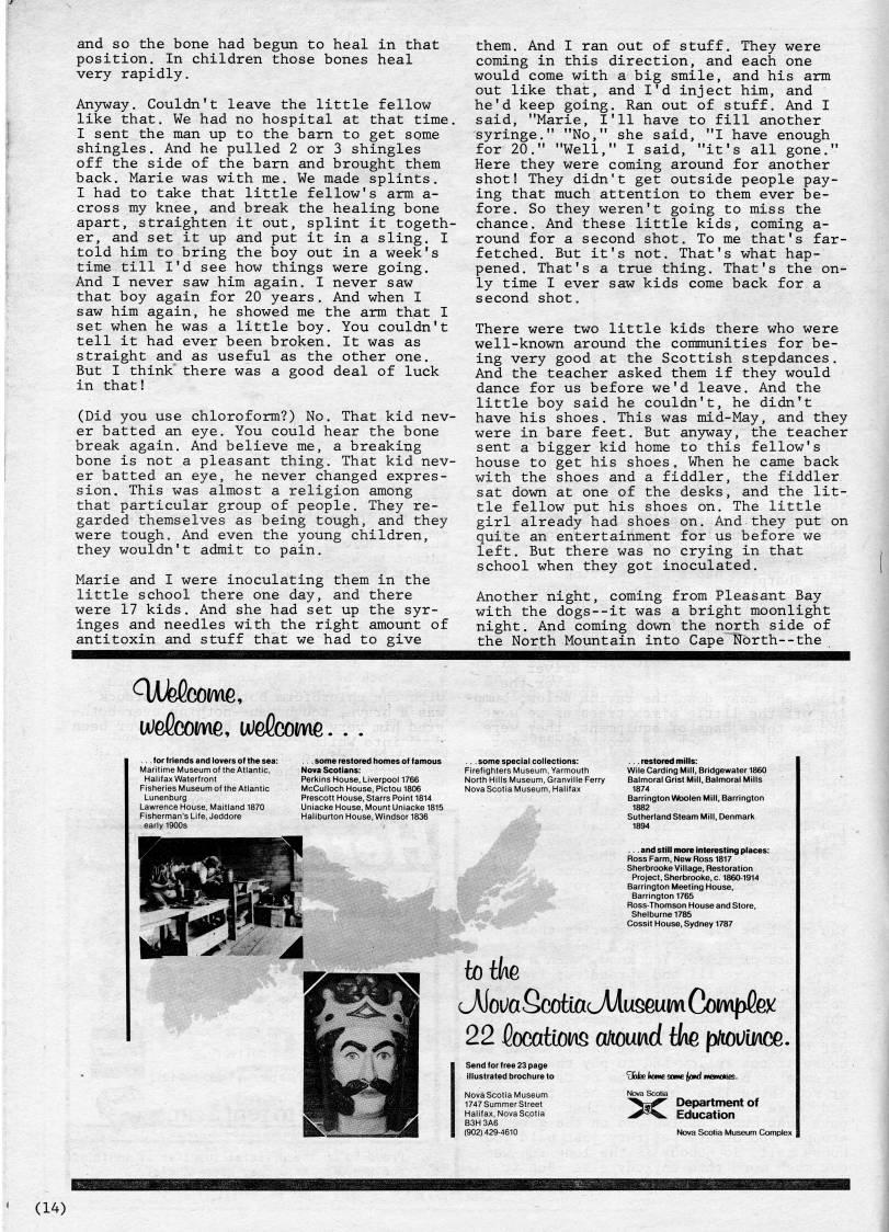 Published by Ronald Caplan on 1985/6/1 (310 reads)and so the bone had begun to heal in that position. In children those bones heal very rapidly. An5rway. Couldn't leave the little fellow like that. We had no hospital at that time. I sent the man up to the bam to get some shingles. And he pulled 2 or 3 shingles off the side of the barn and brought them back. Marie was with me. We made splints. I had to take that little fellow's arm a- cross my knee, and break the healing bone apart, straighten it out, splint it togeth? er, and set it up and put it in a sling. I told him to bring the boy out in a week's time till I'd see how things were going. And I never saw him again. I never saw that boy again for 20 years. And when I saw him again, he showed me the arm that I set when he was a little boy. You couldn't tell it had ever been broken. It was as straight and as useful as the other one. But I think there was a good deal of luck in that! (Did you use chloroform?) No. That kid nev? er batted an eye. You could hear the bone break again. And believe me, a breaking bone is not a pleasant thing. That kid nev? er batted an eye, he never changed expres? sion. This was almost a religion among that particular group of people. They re? garded themselves as being tough, and they were tough. And even the young children, they wouldn't admit to pain. Marie and I were inoculating them in the little school there one day, and there were 17 kids. And she had set up the syr? inges and needles with the right amount of antitoxin and stuff that we had to give them. And I ran out of stuff. They were coming in this direction, and each one would come with a big smile, and his arm out like that, and I'd inject him, and he'd keep going. Ran out of stuff. And I said, "Marie, I'll have to fill another syringe." "No," she said, "I have enough for 20." "Well," I said, "it's all gone." Here they were coming around for another shot! They didn't get outside people pay? ing that much attention to them ever be? fore. So they weren't going to miss the chance. And these little kids, coming a- round for a second shot. To me that's far? fetched. But it's not. That's what hap? pened. That's a true thing. That's the on? ly time I ever saw kids come back for a second shot. There were two little kids there who were well-known around the communities for be? ing very good at the Scottish stepdances. And the teacher asked them if they would dance for us before we'd leave. And the little boy said he couldn't, he didn't have his shoes. This was mid-May, and they were in bare feet. But an3rway, the teacher sent a bigger kid home to this fellow's house to get his shoes. When he came back with the shoes and a fiddler, the fiddler sat down at one of the desks, and the lit? tle fellow put his shoes on. The little girl already had shoes on. And they put on quite an entertainment for us before we left. But there was no crying in that school when they got inoculated. Another night, coming from Pleasant Bay with the dogs--it was a bright moonlight night. And coming down the north side of the North Mountain into Cape North--the QAMcome, ... for friends and lovers of tlie sea: Maritime Museum of the Atlantic, Halifax Waterfront FIsfieries Museum of the Atlantic Lunenburg Lawrence House, Maitland 1870 Fisherman's Life, Jeddore early 1900s ... some restored fiomes of famous Nova Scotians: Perkins House, Liverpool 1766 McCulloch House, Pictou 1806 Prescott House, Starrs Point 1814 Uniacke House, Mount Uniacke 1815 Haliburton House, Windsor 1836 ... some special collections: ... restored mills: Firefighters Museum, Yarmouth Wile Carding Mill, Bridgewater 1860 North Hills Museum, Granville Ferry Balmoral Grist Mill, Balmoral Mills Nova Scotia Museum, Halifax 1874 Barrington Woolen Mill, Barhngton 1882 Sutherland Steam Mill, Denmark .. .and still more interesting places: Ross Farm, New Ross 1817 Sherbrooke Village, Restoration Project, Sherbrooke, c. 1860-1914 Barrington Meeting House, Barrington 1765 Ross-Thomson House and Store, Shelburne 1785 Cossit House, Sydney 1787 tottiG 22 docaiwm aitomd ilm piiov'mc'. Nova Scotia Museum 1747 Summer Street Halifax, NovaScotia B3H 3A6 (902)429-4610 "''' Department Of Education Nova Scotia Museum Complex (14)