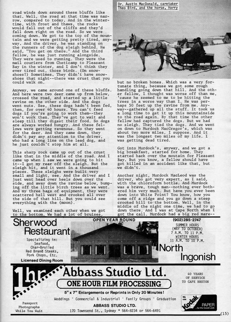 Published by Ronald Caplan on 1985/6/1 (290 reads)I Dr. Austin MacDonald, caretaker Theo Bird, and the horse, Harry road winds down around these bluffs like that. Well, the road at that time was nar? row, compared to today. And in the winter? time, with frost and thaws, the rocks would fall out of the cliffs and they'd fall down right on the road. So we were coming down. We got to the top of the moun? tain and we were getting pretty tired, any? way. And the driver, he was standing on the runners of the dog sleigh behind. He said, "You get on there." And the third fellow, he was just running alongside. They were used to running. They were the mail couriers from Cheticamp to Pleasant Bay in the winter, and I don't think they ever tired out, those birds. (On snow- shoes?) Sometimes. They didn't have snow- shoes that night--there was crust that you could walk on. Anyway, we came around one of these bluffs. And here were two deer came up from below, crossed the road, and started up a little ravine on the other side. And the dogs went nuts. See, these dogs hadn't been fed, then, for over 40 hours. You can't feed dogs if you're going to work them--they won't work then. They've got to wait and sleep till they digest their food. So dogs are always worked hungry. And these fel? lows were getting ravenous. So they went for the deer. And they came down, they didn't pay any attention to the driver, who had a long line on the lead dog, and he just couldn't stop him at all. This sharp rock came up out of the crust like that in the middle of the road. And I came up when I saw we were going to hit it--I got my rear off the sleigh. But the sleigh hit, and it went in a thousand pieces. These sleighs were built very small and light, see. And the driver and I just went head over heels down over the side, and away down the ravine below, bump? ing off the little birch trees as we went. And my three bags of equipment, they were scattered hell west and crooked all over the side of that hill. But you could see everything with the (moon). Well, we examined each other when we got to the bottom. We had a lot of bruises but no broken bones, Which was a very for? tunate thing, because we got some rough handling going down that hill. And the oth? er fellow, I thought was worse off than me, 'cause he seemed to me to be hitting the trees in a worse way than I. He was per? haps 50 feet up the ravine from me. Any- way--gathered up all the stuff. It took us a long time to get it up this mountainside to the road again. By that time the other fellow had captured the dogs. But we had no sleigh. They tied the dogs. And we went on down to Murdock MacGregor's, which was about two more miles, I suppose. And it was the longest two miles of my life. I was getting dead tired. Got into Murdock's, anyway, and we got a big breakfast, started for home. They started back over the moutain for Pleasant Bay. But you know, a fellow should have got killed in an accident like that, but we didn't. Another night, Murdock MacLeod was the driver, who got very expert, as I said, with the chloroform bottle. And Murdock was a brave, tough man--nothing ever both? ered him very much. But have you ever been down into White Point? You know, how you come off a ridge and you go down a steep crooked hill to the bottom. Well, in the middle of the night one time, we had to go down there. And I was at Cape North when I got the call. Murdock had a big red mare-- Sherwood Restaurants Specializing in: Seafood, Char-Broiled Red Branti Steaks, Pork Chops, Etc. Licensed Dining Room OPEN YEAR ROUND rllii: ii:isi::i: (902)285-2747 SUMMER HOURS (MAY TO OCTOBER) 7 A.M. TO 11 P.M. WINTER HOURS 11 A.M. TO 10 P.M. I North Ingonish Passport Photographs While You Wait 'Ahhass Studla Ltd. ONE HOUR FILM PROCESSING ) 5"x 7" Enlargements or Reprints in Only 20 Minutes! Weddings * Commercial & Industrial ' Family Groups * Graduation ABBASS STUDIO LTD. 170 Townsend St., Sydney * 564-8234 or 564-6491 40 YEARS OF SERVICE TO CAPE BRETON
