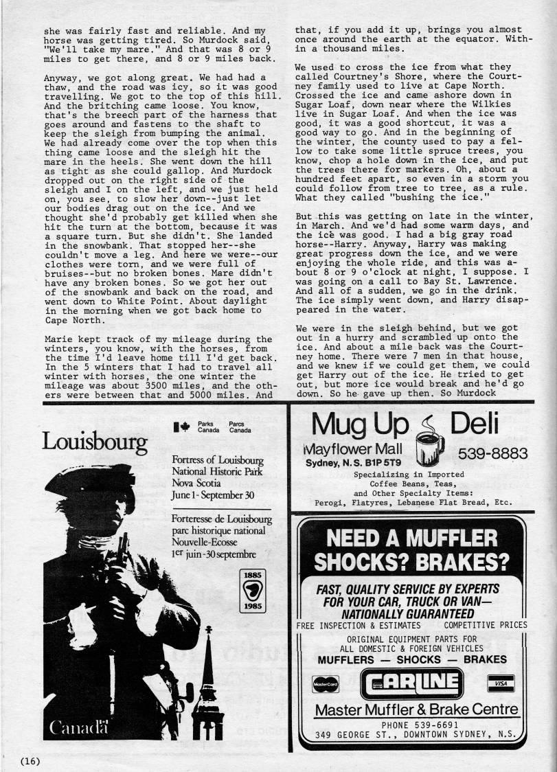 Published by Ronald Caplan on 1985/6/1 (271 reads)she was fairly fast and reliable. And my horse was getting tired. So Murdock said, "We'll take my mare." And that was 8 or 9 miles to get there, and 8 or 9 miles back. Anyway, we got along great. We had had a thaw, and the road was icy, so it was good travelling. We got to the top of this hill. And the britching came loose. You know, that's the breech part of the harness that goes around and fastens to the shaft to keep the sleigh from bumping the animal. We had already come over the top when this thing came loose and the sleigh hit the mare in the heels, She went down the hill as tight as she could gallop. And Murdock dropped out on the right side of the sleigh and I on the left, and we just held on, you see, to slow her down--just let our bodies drag out on the ice. And we thought she'd probably get killed when she hit the turn at the bottom, because it was a square turn. But she didn't. She landed in the snowbank. That stopped her--she couldn't move a leg. And here we were--our clothes were torn, and we were full of bruises--but no broken bones. Mare didn't have any broken bones. So we got her out of the snowbank and back on the road, and went down to White Point. About daylight in the morning when we got back home to Cape North. Marie kept track of my mileage during the winters, you know, with the horses, from the time I'd leave home till I'd get back. In the 5 winters that I had to travel all winter with horses, the one winter the mileage was about 3500 miles, and the oth? ers were between that and 5000 miles. And that, if you add it up, brings you almost once around the earth at the equator. With? in a thousand miles. We used to cross the ice from what they called Courtney's Shore, where the Court? ney family used to live at Cape North. Crossed the ice and came ashore down in Sugar Loaf, down near where the Wilkies live in Sugar Loaf. And when the ice was good, it was a good shortcut, it was a good way to go. And in the beginning of the winter, the county used to pay a fel? low to take some little spruce trees, you know, chop a hole down in the ice, and put the trees there for markers. Oh, about a hundred feet apart, so even in a storm you could follow from tree to tree, as a rule. What they called "bushing the ice." But this was getting on late in the winter, in March. And we'd had some warm days, and the ice was good. I had a big gray road horse--Harry. Anyway, Harry was making great progress down the ice, and we were enjoying the whole ride, and this was a- bout 8 or 9 o'clock at night, I suppose. I was going on a call to Bay St. Lawrence. And all of a sudden, we go in the drink. The ice simply went down, and Harry disap? peared in the water. We were in the sleigh behind, but we got out in a hurry and scrambled up onto the ice. And about a mile back was the Court? ney home. There were 7 men in that house, and we knew if we could get them, we could get Harry out of the ice. He tried to get out, but more ice would break and he'd go down. So he- gave up then. So Murdock Louisbourg Canada Canada Fortress of Louisbourg National Historic Park Nova Scotia June 1 - September 30 Forteresse de Louisbourg pare historique national Nouvelle-Ecosse 1'' juin-30septembre ' Mug Up 4, Deli Mayflower Mall Sydney, N.S. B1P5T9 539-8883 Specializing in Imported Coffee Beans, Teas, and Other Specialty Items: Perogi, Flatyres, Lebanese Flat Bread, NEED A MUFFLER SHOCKS? BRAKES? FAST, QUALITY SERVICE BY EXPERTS FOR YOUR CAR, TRUCK OR VAN- NATIONALLY GUARANTEED FREE INSPECTION & ESTIMATES COMPETITIVE PRICES ORIGINAL EQUIPMENT PARTS FOR ALL DOMESTIC & FOREIGN VEHICLES MUFFLERS • SHOCKS • BRAKES li'iLlij Master Muffler & Brake Centre PHONE 539-6691 349 GEORGE ST., DOWNTOWN SYDNEY, N.S.' (16)