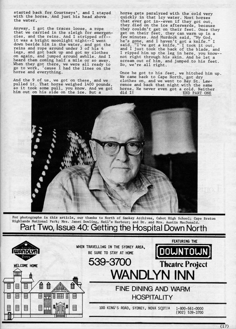 Published by Ronald Caplan on 1985/6/1 (286 reads)started back for Courtneys', and I stayed with the horse. And just his head above the water. Anyway, I got the traces loose, a rope that we carried in the sleigh for emergen? cies, and the reins. And I stripped off-- it was a bright moonlight night--I went down beside him in the water, and got the reins and rope around under 3 of his 4 legs, and got back up and got my clothes on again, and jiomped around awhile. And I heard them coming half a mile or so away. When they got there, we were all ready to go to work, 'cause I had the lines on the horse and everything. And the 9 of us, we got on these, and we pulled it. That horse weighed 1400 pounds, so it took some pull, you know. And we got him out on his side on the ice. But a horse gets paralyzed with the cold very quickly in that icy water. Most horses that ever got in--even if they got out, they died on the ice afterwards, because they couldn't get on their feet. Once they get on their feet, they can warm up in a few minutes. And Murdock said, "My God, he's gone, and I haven't got a knife." I said, "I've got a knife." I took it out, and I just took the back of the blade, and I ripped him up the leg in here, you know-- not right through his skin. And he let a scream out of him, and jumped to his feet. So, we're all right. Once he got to his feet, we hitched him up. We came back to Cape North, got dry clothes on, and we went to Bay St. Law? rence and back that night with the same horse. He never even got a cold. Neither did I! , END PART ONE For photographs in this article, our thanks to North of Smokey Archives, Cabot High School; Cape Breton Highlands National Park; Mrs. Janet Dowling, Neil's Harbour; and Dr. and Mrs. Austin MacDonald. Part Two, Issue 40: Getting the Hospital Down North FEATURING THE WHEN TRAVELLING IN THE SYDNEY AREA, BE SURE TO STAY AT HOME DOUNTOUN 539-3700 Theatre Project WANDLYN INN FINE DINING AND WARM HOSPITALITY 100 KING'S ROAD, SYDNEY, NOVA SCOTIA 1-800-561-0000 (902) 539-3700 (17)