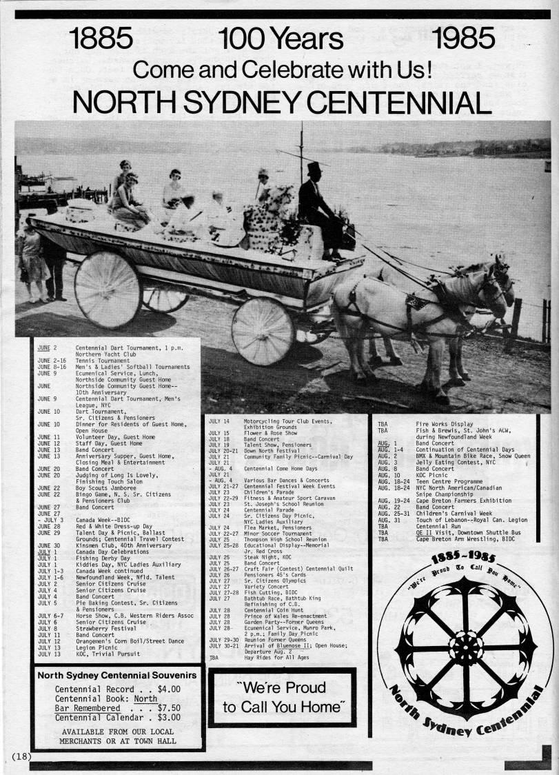 Published by Ronald Caplan on 1985/6/1 (344 reads)1885 100 Years 1985 Come and Celebrate with Us! NORTH SYDNEY CENTENNIAL JUNE 2-16 JUNE 8-16 JUNE 9 JUNE 11 JUNE 12 JUNE 13 JUNE 13 JUNE 27 JUNE 27 - JULY 3 JUNE 28 JUNE 29 JUNE 30 JULY 1 JULY 1 JULY 1 JULY 1-3 JULY 1-6 JULY 2 JULY 4 JULY 4 JULY 5 JULY 6-7 JULY 6 JULY 8 JULY 11 JULY 12 JULY 13 JULY 13 Centennial Dart Tournament, 1 p.m. Northern Yacht Club Tennis Tournament Men's & Ladies' Softball Tournaments Ecumenical Service, Lunch, Northside Community Guest Home Northside Community Guest Home • 10th Anniversary Centennial Dart Toui League, NYC Dart Tourni Sr. Citizens & Pensioners Dinner for Residents of Guest Home, Open House Volunteer Day, Guest Home Staff Day, Guest Home Band Concert Anniversary Supper, Guest Home, Closing Meal & Entertainment Band Concert Judging of Long Is Lovely, Finishing Touch Salon Boy Scouts Jamboree Bingo Game, N. S. Sr. Citizens & Pensioners Club Band Concert Canada Week--BIDC Red & White Dress-up Day Talent Day & Picnic, Ballast Grounds; Centennial Travel Contest Kinsmen Club, 40th Anniversary Canada Day Celebrations Fishing Derby Day Kiddies Day, NYC Ladies Auxiliary Canada Week continued Newfoundland Week, Nfld. Talent Senior Citizens Cruise Senior Citizens Cruise Band Concert Pie Baking Contest, Sr. Citizens & Pensioners Horse Show, C.B. Western Riders Asso Senior Citizens Cruise Strawberry Festival Band Concert Orangemen's Com Boil/Street Dance Legion Picnic KOC, Trivial Pursuit North Sydney Centennial Souvenirs Centennial Record . . $4.00 Centennial Book: North Bar Remembered . . , $7.50 Centennial Calendar . $3.00 AVAILABLE FROM OUR LOCAL MERCHANTS OR AT TOWN HALL (18) JULY 14 JULY 15 JULY 18 JULY 19 JULY 20-21 JULY 21 JULY 21 - AUG. 4 JULY 21 - AUG. 4 JULY 21-27 JULY 23 JULY 22-29 JULY 23 JULY 24 JULY 24 JULY 24 JULY 22-27 JULY 25 JULY 25-28 JULY 25 JULY 25 JULY 26-27 JULY 26 JULY 27 JULY 27 JULY 27-28 JULY 27 JULY 28 JULY 28 JULY 28 JULY 28 Motorcycling Tour Club Events, Exhibition Grounds Flower & Rose Show Band Concert Talent Show, Pensioners Down North Festival Community Family Picnic--Carnival Day Centennial Come Home Days Various Bar Dances & Concerts Centennial Festival Week Events Children's Parade Fitness & Amateur Sport Caravan St. Joseph's School Reunion Centennial Parade Sr. Citizens Day Picnic, NYC Ladies Auxiliary Flea Market, Pensioners Minor Soccer Tournament Thompson Hiqh School Reunion Educational Display--Memorial Jr. Red Cross Steak Night, KOC Band Concert Craft Fair (Contest) Centennial Quilt Pensioners 45's Cards Sr. Citizens Olympics Variety Concert Fish Cutting, BIDC Bathtub Race, Bathtub King Refinishing of C.B. Centennial Coin Hunt Prince of Wales Re-enactment Garden Party--Former Queens Ecumenical Service, Munro Park, 2 p.m.; Family Day Picnic Reunion Former Queens Arrival of Bluenose II; Open House; Departure Aug. 2 Hay Rides for All Ages "We're Proud to Call You Home" TBA AUG. 1 AUG. 1-4 AUG. 2 AUG. 3 AUG. 8 AUG. 10 AUG. 18-2. AUG. 19-24 AUG. 22 AUG. 25-31 AUG. 31 Fire Works Display Fish & Brewis, St. John's ACW, during Newfoundland Week Band Concert Continuation of Centennial Days BMX & Mountain Bike Race, Snow Queen Jelly Eating Contest, NYC Band Concert KOC Picnic Teen Centre Programme NYC North American/Canadian Snipe Championship Cape Breton Farmers Exhibition Band Concert Children's Carnival Week Touch of Lebanon--Royal Can. Legion Centennial Run QE II Visit, Downtown Shuttle Bus Cape Breton Arm Wrestling, BIDC 'ftS??-l9?' *h • eYCe?**
