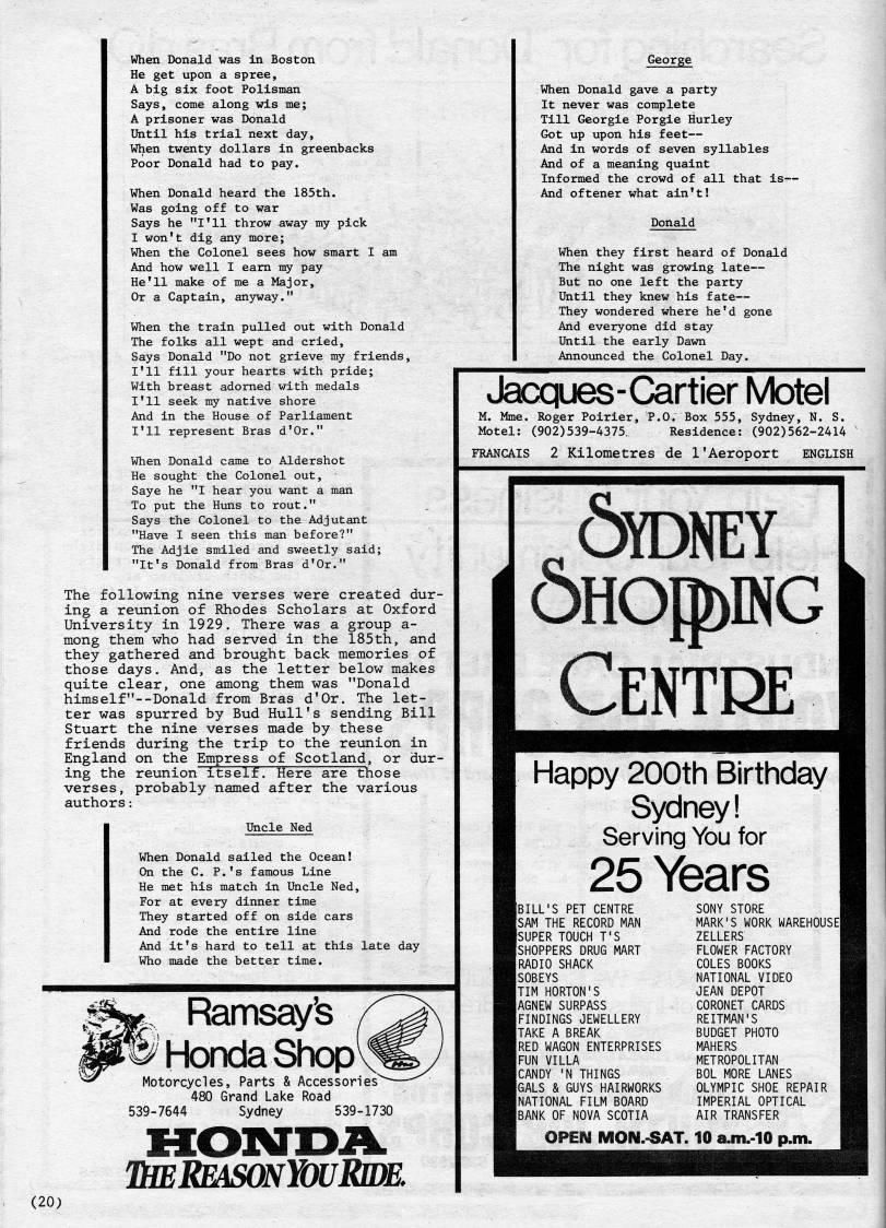 Published by Ronald Caplan on 1985/6/1 (461 reads)When Donald was in Boston He get upon a spree, A big six foot Polisman Says, come along wis me; A prisoner was Donald Until his trial next day. When twenty dollars in greenbacks Poor Donald had to pay. When Donald heard the 185th. Was going off to war Says he "I'll throw away my pick I won't dig any more; When the Colonel sees how smart I am And how well I earn my pay He'll make of me a Major, Or a Captain, anyway." When the train pulled out with Donald The folks all wept and cried. Says Donald "Do not grieve my friends, I'll fill your hearts with pride; With breast adorned with medals I'll seek my native shore And in the House of Parliament I'll represent Bras d'Or." When Donald came to Aldershot He sought the Colonel out, Saye he "I hear you want a man To put the Huns to rout." Says the Colonel to the Adjutant "Have I seen this man before?" The Adjie smiled and sweetly said; "It's Donald from Bras d'Or." The following nine verses were created dur? ing a reunion of Rhodes Scholars at Oxford University in 1929. There was a group a- mong them who had served in the 185th, and they gathered and brought back memories of those days. And, as the letter below makes quite clear, one among them was "Donald himself"--Donald from Bras d'Or. The let? ter was spurred by Bud Hull's sending Bill Stuart the nine verses made by these friends during the trip to the reunion in England on the Empress of Scotland, or dur? ing the reunion itself. Here are those verses, probably named after the various authors: Uncle Ned When Donald sailed the Ocean! On the C. P.'s famous Line He met his match in Uncle Ned, For at every dinner time They started off on side cars And rode the entire line And it's hard to tell at this late day Who made the better time. George When Donald gave a party It never was complete Till Georgle Porgie Hurley Got up upon his feet • And in words of seven syllables And of a meaning quaint Informed the crowd of all that is • And oftener what ain't! Donald When they first heard of Donald The night was growing late • But no one left the party Until they knew his fate • They wondered where he'd gone And everyone did stay Until the early Dawn Announced the Colonel Day. Ramsay's 'HondaShop Motorcycles, Parts & Accessories' 480 Grand Lake Road 539-7644 Sydney 539-1730 HmREASONYouRnm (20) Jacques-Cartier Motel M. Mme. Roger Poirier, P.O. Box 555, Sydney, N. S. Motel: (902)539-4375. Residence: (902)562-2414 FRANCAIS 2 Kilometres de I'Aeroport ENGLISH • aroNEY OHOiaiNG Ce're Happy 200th Birthday Sydney! Serving You for 25 Years IBILL'S PET CENTRE SAM THE RECORD MAN SUPER TOUCH T'S ISHOPPERS DRUG MART RADIO SHACK SOBEYS TIM HORTON'S AGNEW SURPASS FINDINGS JEWELLERY TAKE A BREAK RED WAGON ENTERPRISES FUN VILLA CANDY 'N THINGS GALS & GUYS HAIRWORKS NATIONAL FILM BOARD BANK OF NOVA SCOTIA SONY STORE MARK'S WORK WAREHOUSE ZELLERS FLOWER FACTORY COLES BOOKS NATIONAL VIDEO JEAN DEPOT CORONET CARDS REITMAN'S BUDGET PHOTO MAHERS METROPOLITAN BOL MORE LANES OLYMPIC SHOE REPAIR IMPERIAL OPTICAL AIR TRANSFER OPEN MON.-SAT. 10 a.m.-10 p.iii.