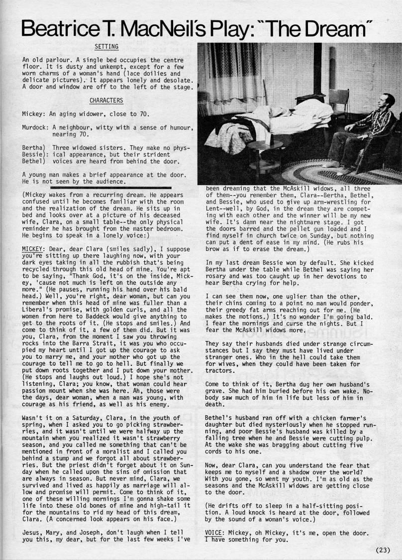 Published by Ronald Caplan on 1985/6/1 (270 reads)Beatrice! MacNeil's Play: The Dream' SETTING An old parlour. A single bed occupies the centre floor. It is dusty and unkempt, except for a few worn charms of a woman's hand (lace doilies and delicate pictures)." It appears lonely and desolate. A door and window are off to the left of the stage. CHARACTERS Mickey: An aging widower, close to 70. Murdock: A neighbour, witty with a sense of humour, nearing 70. Bertha) Three widowed sisters. They make no phys- Bessie): ical appearance, but their strident Bethel) voices are heard from behind the door. A young man makes a brief appearance at the door. He is not seen by the audience. (Mickey wakes from a recurring dream. He appears confused until he becomes familiar with the room and the realization of the dream. He sits up in bed and looks over at a picture of his deceased wife, Clara, on a small table--the only physical reminder he has brought from the master bedroom. He begins to speak in a lonely voice:) MICKEY: Dear, dear Clara (smiles sadly), I suppose you're sitting up there laughing now, with your dark eyes taking in all the rubbish that's being recycled through this old head of mine. You're apt to be saying, "Thank God, it's on the inside, Mick? ey, 'cause not much is left on the outside any more." (He pauses, running his hand over his bald head.) Well, you're right, dear woman, but can you remember when this head of mine was fuller than a Liberal's promise, with golden curls, and all the women from here to Baddeck would give anything to get to the roots of it. (He stops and smiles.) And come to think of it, a few of them did. But it was you, Clara, from the moment I saw you throwing rocks into the Barra Strait, it was you who occu? pied my heart until I got up the courage to ask you to marry me, and your mother who got up the courage to tell me to go to hell. But finally we put down roots together and I put down your mother. (He stops and laughs out loud.) I hope she's not listening, Clara; you know, that woman could hear passion mount when she was here. Ah, those were the days, dear woman, when a man was young, with courage as his friend, as well as his enemy. Wasn't it on a Saturday, Clara, in the youth of spring, when I asked you to go picking strawber? ries, and it wasn't until we were halfway up the mountain when you realized it wasn't strawberry season, and you called me something that can't be mentioned in front of a moralist and I called you behind a stump and we forgot all about strawber? ries. But the priest didn't forget about it on Sun? day when he called upon the sins of omission that are always in season. But never mind, Clara, we survived and lived as happily as marriage will al? low and promise will permit. Come to think of it, one of these willing mornings I'm gonna shake some life into these old bones of mine and high-tail it for the mountains to rid my head of this dream, Clara. (A concerned look appears on his face.) Jesus, Mary, and Joseph, don't laugh when I tell you this, my dear, but for the last few weeks I've been dreaming that the McAskill widows, all three of them--you remember them, Clara--Bertha, Bethel, and Bessie, who used to give up arm-wrestling for Lent--wen, by God, in the dream they are compet? ing with each other and the winner will be my new wife. It's damn near the nightmare stage. I got the doors barred and the pellet gun loaded and I find myself in church twice on Sunday, but nothing can put a dent of ease in my mind. (He rubs his brow as if to erase the dream.) In my last dream Bessie won by default. She kicked Bertha under the table while Bethel was saying her rosary and was too caught up in her devotions to hear Bertha crying for help. I can see them now, one uglier than the other, their chins coming to a point no man would ponder, their greedy fat arms reaching out for me. (He makes the motions.) It's no wonder I'm going bald. I fear the mornings and curse the nights. But I fear the McAskill widows more. They say their husbands died under strange circum? stances but I say they must have lived under stranger ones. Who in the hell could take them for wives, when they could have been taken for tractors. Come to think of it, Bertha dug her own husband's grave. She had him buried before his own wake. No? body saw much of him in life but less of him in death. Bethel's husband ran off with a chicken farmer's daughter but died mysteriously when he stopped run? ning, and poor Bessie's husband was killed by a falling tree when he and Bessie were cutting pulp. At the wake she was bragging about cutting five cords to his one. Now, dear Clara, can you understand the fear that keeps me to myself and a shadow over the world? With you gone, so went my youth. I'm as old as the seasons and the McAskill widows are getting close to the door. (He drifts off to sleep in a half-sitting posi? tion. A loud knock is heard at the door, followed by the sound of a woman's voice.) VOICE: Mickey, oh Mickey, it have something for you. s me, open the door. (23)