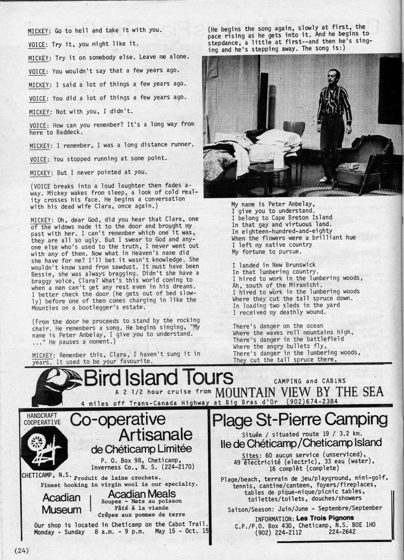 Published by Ronald Caplan on 1985/6/1 (295 reads)MICKEY: Go to hell and take it with you. VOICE: Try it, you might like it. MICKEY: Try it on somebody else. Leave me alone. VOICE: You wouldn't say that a few years ago. MICKEY: I said a lot of things a few years ago. VOICE: You did a lot of things a few years ago. MICKEY: Not with you, I didn't. VOICE: How can you remember? It's a long way from here to Baddeck. MICKEY: I remember, I was a long distance runner. VOICE: You stopped running at some point. MICKEY: But I never pointed at you. (VOICE breaks into a loud laughter then fades a- way. Mickey wakes from sleep, a look of cold real? ity crosses his face. He begins a conversation with his dead wife Clara, once again.) MICKEY: Oh, dear God, did you hear that Clara, one of the widows made it to the door and brought my past with her. I can't remember which one it was, they are all so ugly. But I swear to God and any? one else who's used to the truth, I never went out with any of them. Now what in Heaven's name did she have for me? I'll bet it wasn't knowledge. She wouldn't know sand from sawdust. It must have been Bessie, she was always bragging. Didn't she have a braggy voice, Clara? What's this world coming to when a man can't get any rest even in his dreams. I better check the door (he gets out of bed slow? ly) before one of them comes charging in like the Mounties on a bootlegger's estate. (From the door he proceeds to stand by the rocking chair. He remembers a song. He begins singing, "My name is Peter Ambelay, I give you to understand. ..." He pauses a moment.) (He begins the song again, slowly at first, the pace rising as he gets into it. And he begins to stepdance, a little at first • and then he's sing? ing and he's stepping away. The song is:) MICKEY: Remember this, Clara, I haven't sung it in years. It used to be your favourite. My name is Peter Ambelay, I give you to understand. I belong to Cape Breton Island In that gay and virtuous land. In eighteen-hundred-and-eighty When the flowers were a brilliant hue I left my native country My fortune to pursue. I landed in New Brunswick In that lumbering country. I hired to work in the lumbering woods. Ah, south of the Miramichi. I hired to work in the lumbering woods Where they cut the tall spruce down. In loading two sleds in the yard I received my deathly wound. There's danger on the ocean Where the waves roll mountains high. There's danger in the battlefield Where the angry bullets fly, There's danger in the lumbering woods. They cut the tall spruce there. Bird Island Tours CAMPING and CABINS A 2 1/2 hour cruise fro?? MOUNTAIN VIEW BY THE SEA 4 miles off Trans-Canada Highway at Big Bras d'Or (902)674-2384 Co-operative Artisanale de Cheticamp Limitee CHETICAMP, N.S. , P. 0. Box 98, Cheticamp, Inverness Co., N. S. (224-2170) ' Produit de laine crochete. Finest hooking in virgin wool is our specialty. Acadian i Acadian Meals r'KjCKKAiCXi I Soupes - Mets au poisson Museum • ' '''' ' '' viande Crepes aux pommes de terre Our shop is located in Cheticamp on the Cabot Trai Monday - Sunday 8 a.m. - 9 p.m. May 15 - Oct. 5| (24) Plage St-Pierre Camping Situee / situated route 19 / 3.2 km. He de Cheticamp/Cheticamp Island Sites: 60 aucuri service (unserviced), 49 electricite (electric), 33 eau (water), 16 complet (complete) Plage/beach, terrain de jeu/playground, mini-golf, tennis, cantine/canteen, foyers/fireplaces, tables de pique-nique/picnic tables, toilettes/toilets, douches/showers Saison/Season: Juin/June - Septembre/September INFORMATION: Les Trois Pignons C.P./P.O. Box 430, Cheticamp, N.S." BOE IHO (902) 224-2112 224-2642