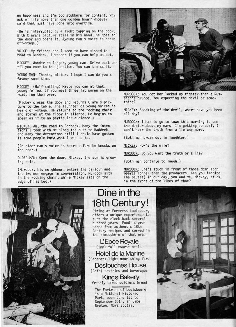 Published by Ronald Caplan on 1985/6/1 (269 reads)no happiness and I'm too stubborn for content. Why ask of,1ife more than one golden hour? Whoever said that must have gone into overtime. (He is interrupted by a light tapping on the door. With Clara's picture still in his hand, he goes to' the door and opens it. Ayoung man's voice is heard off-stage.) VOICE: My friends and I seem to have missed the road to Baddeck. I wonder if you can help us out. MICKEY: Wonder no longer, young man. Drive east un? til you come to the junction. You can't miss it. YOUNG MAN: Thanks, mister. I hope I can do you a favour some time. MICKEY: (Half-smiling) Maybe you can at that, young fellow. If you meet three fat women on the road, run them over. (Mickey closes the door and returns Clara's pic? ture to the table. The laughter of young voices is heard off-stage. He returns to the rocking chair and stares at the floor in silence. He begins to speak as if to no particular audience.) MICKEY; Ah, the road to Baddeck. Many the inten? tions I took with me along the dust to Baddeck, and many the detentions still I could have gotten if some people knew what I was up to. (An older man's voice is heard before he knocks on the door.) OLDER MAN: Open the door, Mickey, the sun is grow? ing cold. (Murdock, his neighbour, enters the parlour and the two men engage in conversation. Murdock sits in the rocking chair, while Mickey sits on the edge of his bed.) MURDOCK; You got her locked up tighter than a Rus? sian's grudge. You expecting the devil or some? thing? MICKEY: Speaking of the devil, where have you been all day? MURDOCK: I had to go to town this morning to see the doctor about my ears. I'm getting so deaf, I can't hear the truth from a lie any more. (Both men break out in laughter.) MICKEY; How's the wife? MURDOCK; Do you want the truth or a lie? (Both men continue to laugh.) MURDOCK: She's stuck in front of those damn soap operas longer than the producers. Can you imagine (he pauses) in our day, you and me, Mickey, stuck in the front of the likes of that? Dine In the 18th Century! Dining at Fortress Louisbourg offers a unique experience to turn the clock back several hundred years. Food is pre? pared from authentic 18th Century recipes and served in the atmosphere of that era. L'Epee Royale (Inn) full course meals Hotel de la Marine (Cabaret) light nourishing fare Destouches House (Cafe) pastries and beverages King's Bakery freshly baked soldiers bread The Fortress of Louisbourg is a National Historic Park, open June 1st to September 30th, in Cape Breton, Nova Scotia.
