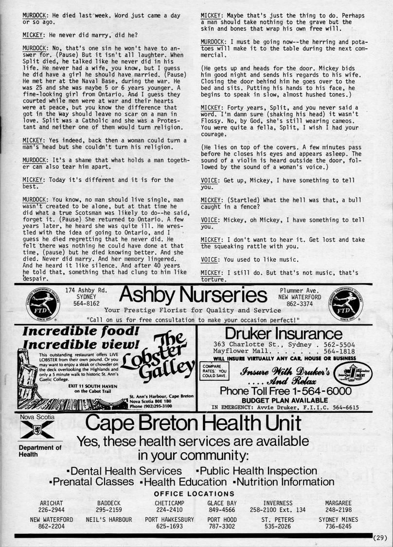 Published by Ronald Caplan on 1985/6/1 (289 reads)MURDOCK: He died last'week. Word just came a day or so ago. MICKEY: He never did marry/did he? MURDOCK: No, that's one sin he won't have to an? swer for. (Pause) But it isn't all laughter. When Split died, he talked like he never did in his life. He never had a wife, you know, but I guess he did have a girl he should have married. (Pause) He met her at the Naval Base, during the war. He was 25 and she was maybe 5 or 6 years younger. A fine-looking girl from Ontario. An4 I guess they courted while men were at war and their hearts were at peace, but you know the difference that got in the Way should leave no scar on a man in love. Split was a Catholic and she was a Protes? tant and neither one of them would turn religion. MICKEY: Yes indeed, back then a woman could turn a man's head but she couldn't turn his religion. MURDOCK: It's a shame that what holds a man togeth? er can also tear him apart. MICKEY: Today it's different and it is for the best. MURDOCK: You know, no man should live single, man wasn't created to be alone, but at that time he did what a true Scotsman was likely to do--he said, forget it. (Pause) She returned to Ontario. A few years later, he heard she was quite ill. He wres? tled with the idea of going to Ontario, and I guess he died regretting that he never did. He felt there was nothing he could have done at that time, (pause) but he died knowing better. And she died. Never did marry. And her memory lingered. And he heard it like silence. And after 40 years he told that, something that had clung to him like *despair. Ashby Nurseries MICKEY: Maybe that's just the thing to do. Perhaps a man should take nothing to the grave but the skin and bones that wrap his own free will. MURDOCK: I must be going now--the herring and pota? toes will make it to the table during the next com? mercial. (He gets up and heads for the door. Mickey bids him good night and sends his regards to his wife. Closing the door behind him he goes over to the bed and sits. Putting his hands to his face, he begins to speak in slow, almost hushed tones.) MICKEY: Forty years. Split, and you never said a word. I'm damn sure (shaking his head) it wasn't Flossy. No, by God, she's still wearing cameos. You were quite a fella. Split, I wish I had your courage. (He lies on top of the covers. A few minutes pass before he closes his eyes and appears asleep. The sound of a violin is heard outside the door, fol? lowed by the sound of a woman's voice.) VOICE: Get up, Mickey, I have something to tell you. MICKEY: (Startled) What the hell was that, a bull caught in a fence? VOICE: Mickey, oh Mickey, I have something to tell you. MICKEY: I don't want to hear it. Get lost and take the squeaking rattle with you. VOICE: You used to like music. MICKEY: I still do. But that's not music, that's torture. '';''' 174 Ashby Rd. SYDNEY 564-8162 Incredible food! Incredible view! This outstanding resUurant offers LiVE LOBSTER from their own pound. Or you may want to enjoy a steak or chowder on Si the deck overlooking the Highlands and ?? only a 5 minute walk to historic St. Ann's Gaelic College. EXIT 11 SOUTH HAVEN on the Cabot Trail Your Prestige Florist for Quality and Service "Call on us for free consultation to make your occasion perfect!" Plummer Ave. /' NEW WATERFORD 862-3374 n St. Ann's Harbour, Cape Breton Nova Scotia BOE IBO Phone (902)295-3100 Druker Insurance 363 Charlotte St., Sydney . 562-5504 Mayflower Mall 564-1818 WILL INSURE VlimJALLy ANY CAR, HOUSE OR BUSINESS COMPARE. RATES. YOU COULD SAVE. .... t}'4ui Slelax Plione Toll Free 1-564-6000 BUDGET PLAN AVAILABLE IN EMERGENCY: Awie Druker, F.I.I.C. 564-6615 Nova Scotia C5sC Department of Health Cape Breton Health Unit Yes, these health services are available in your community: ??Dental Health Services "Public Health Inspection ??Prenatal Classes -Health Education -Nutrition Information ARICHAT 226-2944 NEW WATERFORD 862-2204 BADDECK 295-2159 NEIL'S HARBOUR OFFICE LOCATIONS CHETICAMP 224-2410 PORT HAWKESBURY 625-1693 GLACE BAY 849-4566 PORT HOOD 787-3302 INVERNESS 258-2100 Ext. 134 ST. PETERS 535-2026 MARGAREE 248-2198 SYDNEY MINES 736-6245 (29)