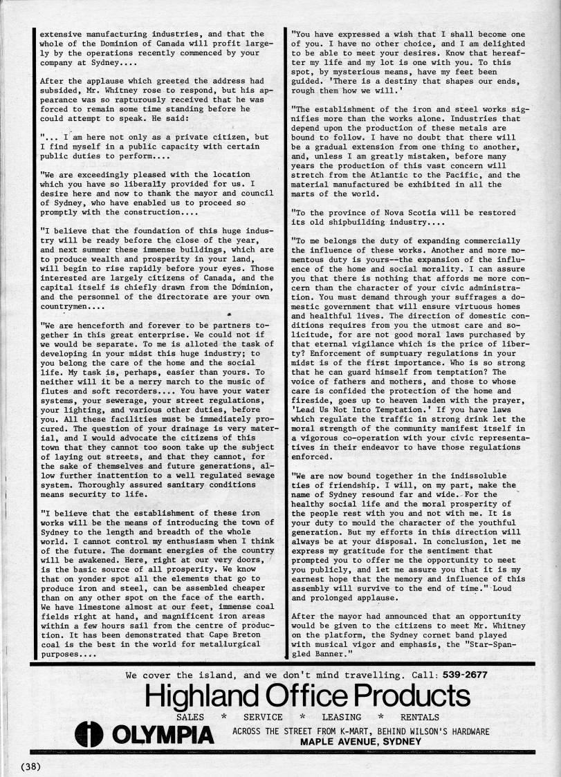 Published by Ronald Caplan on 1985/6/1 (282 reads)extensive manufacturing industries, and that the whole of the Dominion of Canada will profit large? ly by the operations recently commenced by your company at Sydney.... After the applause which greeted the address had subsided, Mr. Whitney rose to respond, but his ap? pearance was so rapturously received that he was forced to remain some time standing before he could attempt to speak. He said: "... I am here not only as a private citizen, but I find myself in a public capacity with certain public duties to perform.... "We are exceedingly pleased with the location which you have so liberally provided for us. I desire here and now to thank the mayor and council of Sydney, who have enabled us to proceed so promptly with the construction.... "I believe that the foundation of this huge indus? try will be ready before the close of the year, and next summer these immense buildings, which are to produce wealth and prosperity in your land, will begin to rise rapidly before your eyes. Those interested are largely citizens of Canada, and the capital itself is chiefly drawn from the Ddminion, and the personnel of the directorate are your own countrymen.... "We are henceforth and forever to be partners to? gether in this great enterprise. We could not if we would be separate. To me is alloted the task of developing in your midst this huge industry; to you belong the care of the home and the social life. My task is, perhaps, easier than yours. To neither will it be a merry march to the music of flutes and soft recorders.... You have your water systems, your sewerage, your street regulations, your lighting, and various other duties, before you. All these facilities must be immediately pro? cured. The question of your drainage is very mater? ial, and I would advocate the citizens of this town that they cannot too soon take up the subject of laying put streets, and that they cannot, for the sake of themselves and future generations, al? low further inattention to a well regulated sewage system. Thoroughly assured sanitary conditions means security to life. "I believe that the establishment of these iron works will be the means of introducing the town of Sydney to the length and breadth of the whole world. I cannot control my enthusiasm when I think of the future. The dormant energies of the country will be awakened. Here, right at our very doors, is the basic source of all prosperity. We know that on yonder spot all the elements that go to produce iron and steel, can be assembled cheaper than on any other spot on the face of the earth. We have limestone almost at our feet, immense coal fields right at hand, and magnificent iron areas within a few hours sail from the centre of produc? tion. It has been demonstrated that Cape Breton coal is the best in the world for metallurgical purposes.... "You have expressed a wish that I shall become one of you. I have no other choice, and I am delighted to be able to meet your desires. Know that hereaf? ter my life and my lot is one with you. To this spot, by mysterious means, have my feet been guided. 'There is a destiny that shapes our ends, rough them how we will.' "The establishment of the iron and steel works sig? nifies more than the works alone. Industries that depend upon the production of these metals are bound to follow. I have no doubt that there will be a gradual extension from one thing to another, and, unless I am greatly mistaken, before many years the production of this vast concern will stretch from the Atlantic to the Pacific, and the material manufactured be exhibited in all the marts of the world. "To the province of Nova Scotia will be restored its old shipbuilding industry.... "To me belongs the duty of expanding commercially the influence of these works. Another and more mo? mentous duty is yours • the expansion of the influ? ence of the home and social morality. I can assure you that there is nothing that affords me more con? cern than the character of your civic administra? tion. You must demand through your suffrages a do? mestic government that will ensure virtuous homes and healthful lives. The direction of domestic con? ditions requires from you the utmost care and so? licitude, for are not good moral laws purchased by that eternal vigilance which is the price of liber? ty? Enforcement of sumptuary regulations in your midst is of the first importance. Who is so strong that he can guard himself from temptation? The voice of fathers and mothers, and those to whose care is confided the protection of the home and fireside, goes up to heaven laden with the prayer, 'Lead Us Not Into Temptation.' If you have laws which regulate the traffic in strong drink let the moral strength of the community manifest itself in a vigorous co-operation with your civic representa? tives in their endeavor to have those regulations enforced. "We are now bound together in the indissoluble ties of friendship. I will, on my part, make the name of Sydney resound far and wide. For the healthy social life and the moral prosperity of the people rest with you and not with me. It is your duty to mould the character of the youthful generation. But my efforts in this direction will always be at your disposal. In conclusion, let me express my gratitude for the sentiment that prompted you to offer me the opportunity to meet you publicly, and let me assure you that it is my earnest hope that the memory and influence of this assembly will survive to the end of time." Loud and prolonged applause. After the mayor had announced that an opportunity would be given to the citizens to meet Mr. Whitney on the platform, the Sydney comet band played with musical vigor and emphasis, the "Star-Span- gled Banner." We cover the island, and we don't mind travelling. Call: 539-2677 Highland Office Products O SALES SERVICE LEASING 'l VMDIA ACROSS THE STREET FROM K-MART, BEHIND WILSON'S HARDWARE V#LpI lvir'l#% MAPLE AVENUE, SYDNEY (38)