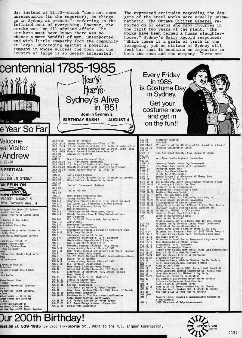 Published by Ronald Caplan on 1985/6/1 (340 reads)day instead of $1.50 • which "does not seem unreasonable (to the reporter), as things go in Sydney at present"--referring to the inflated cost of everything. However, the strike was "an ill-advised affair. The strikers must have known there was no chance a mere handful of men, unsupported and with little sympathy from the community at large, succeeding against a powerful company in whose success the town and the country at large is so deeply interested." The expressed attitudes regarding the dan? gers of the steel works were equally uns3mi- pathetic. The Ottawa Citizen General re? ported on 61 deaths and many injuries in the first two years of the plant. "The works have been termed a human slaughter? house." Sydney's Daily Record responded: "While there is a grain of truth in the foregoing, yet no citizen of Sydney will feel but that it contains an injustice to both the town and the company. There are centennial 1785-1985 jea Sydney's Alive in '85! Join in Sydney's BIRTHDAY BASH ! AUGUST 4 eYearSoFar Velcome lyal Visitor I Andrew IE 29-30 !S FESTIVAL 5, 6, 7 CEILIDH IN SYDNEY ;an rejjnion PARADE: AUGUST 5 from Toronto Aug. 4 )en Hcuse--Air Show--CFS Sydney :iimenical Service lymp1cs--Provincial Summer Games 7 Bowling at the Cedars imily Picnic w & Harbour Ports Day Parachute Association Convention - Family Picnic lurch Anniv. Observance Service tists Assoc. "Paint-In" jnteers Fashion Show jtion Day Celebrations • Focus-on-Family irket 'Celebrations {Family Festival) irds) ife Conference tMaharajan Festival ??Jk Reunion .B. County Vocational School Jivers Competition Festival ibrations/Provincial Opening • >rs Festival-'-Giant Concert, i Dance jltural Assoc • Italia Day jummer Crafts for Children ly Picnic i Institute Convention )en House, CFS--Air Show Dme Home Days • UCCB Alumni Reunion AUGUST 4 A Every Friday in 1985 is Costume Day' in Sydney. Get your costume now and get in on the fun!! JULY 9-10 JULY 12-14 JULY 12-14 JULY 15-21 JULY 18-20 JULY 20 JULY 25 -AUG 3 JULY 26-28 JULY 26-28 JULY 26-28 JULY 26-28 JULY 27 -AUG 2 JULY 28 JULY 28 JULY 28 -AUG 3 JULY 28 -AUG 3 JULY 28 -AUG 3 AUG 1-4 AUG 1-4 AUG 1-4 AUG 1-10 AUG 2 AUG 2-3 AUG 2-3 AUG,'-4 ' AUG 3-10 A(JG 3-4 AUG 4 AUG 4 AUG 4-24 AUG 5 AUG 5-6 AUG 7 AUG 7 AUG 8 AUG 8-11 AUG 8-11 AUG 9 AUG 9 AUG 9-11 AUG 9-11- AUG 9-11 AUG 10 AUG 10 AUG 11 AUG 11 AUG 11-17 AUG 11-17 AUG 11-18 AUG 12 AUG 12 AUG 16-18 AUG 18-24 AUG 19-24 AUG 21-23 AUG 23-25 Ukrainian Festival Sydney Acaderny Reunion--Class of '50 C.B.ers Jamboree • C.B.Co. C.B. Radio Friendship Club Gaelic Festival Caidreabh Nan Gaidheal, Sidni, 1985 Modern Square & Round Dance Festival Strawberry Festival North Sydney Centennial Days C.B. Highlanders Convention C.B. School of Crafts Craft Show & Sale Bicentennial Baby Quilt Contest (Craft Show) Sydney Academy Reunion '52, '53, '54 Cumis Board Seminar St. Phillip's Orthodox Church Thanksgiving Service Model Sailboat Racing • Family Event Fastball Tournament (Indian) Indiar Pow Wow West Indian Homecoming Days Sydney Academy Reunion Rive'rview Pioneers Reunion (High School Reunion) Loi/isbourg C.B. Fisheries & Marine Exhibit Boy Scout Jamboree, Rotary Park Mori en Memories Irish Days--Irish Ambassador, Guest Olands Canadian Powerlifting Championships- Men's National N.S. Softball Championship Senior Men's Action Week Horseshoe Tournament Sunset Ceremony--Cadets Bicentennial Parade & Parade of Performers Show UCCB Dance Festival Caribbean Festival & Parade Schenley's Bicentennial Golf Tournament Newfoundland Day--Branch 128 Legion Gaelic Society Milling Frolic Margaret Bourgeois Pageant, Holy Angels Sydney Academy Reunion Class of 1975 Holy Angels Convent Anniversary (100 Years) Reunion Remember When • Holy Angels St. Phillip's African Orthodox Reunion/Dinner/Dance Muggah Family Reunion Sydney Academy Reunion Class of 1965 N.S. Softball Championship Open House & Banquet • Holy Angels Oldies but Goodies Dance • St. Phillip's AOC Liturgical Celebrations • Holy Angels (Sacred Heart Church) Memorial Service, St. Phillip's Salute to Labour Week Ethiopian Celebrations Lob Ball Tournament Scottish Highlands/C.B. Youth Theatre Royal Bank, Whitney Pier Br. 75th Anniv. of Branch North Novas Convention Northern Yacht Club North American/Canadian Snipe Championships, North Sydney C.B. Farmers Exhibition • North Sydney N.S. Arena Managers Assoc. Convention Korean Vets Convention AUG 24 AUG 24 AUG 24-25 AUG 25-31 AUG 30 -SEPT 1 AUG 30 -SEPT 1 'AUG 31 -SEPT 2 SEPT 1 SEPT 1-7 SEPT 2 SEPT 6 SEPT 7 SEPT 14 SEPT 14-15 SEPT 14-15 SEPT 15 SEPT 15-20 SEPT 19-21 SEPT 22 SEPT 22 SEPT 26-28 SEPT 26-28 SEPT 27-29 SEPT 28 SEPT 28-29 SEPT 28-29 TBA OCT OCT 4-6 OCT 6 OCT 7 OCT 8-14 OCT 11-13 OCT 11-13 OCT 11-14 OCT 12-13 OCT 12-14 OCT 13-14 OCT 16 OCT 21-27 OCT 22-24 OCT 25-27 OCT 31 NOV 1 NOV 8-10 NOV 11 NOV 14-17 NOV 16 NOV 22-23 NOV 30 TBA DEC 14 DEC 14-15 DEC 31 DEC 31 JAN 1986 JAN 1 Blueberry Festival Corn Boil 25th Anniv. of the Blessing of St. Augustine's Church , Highland Conservation School C.B. Sea Cadet Regatta, Navy League of Canada West Nova Scotia Regiment Convention Cromarty Tennis Labour Day Tournament N.S. Royal Can. Legion Golf Tournament Ethiopian Youth Week Labour Day Church Parade Salute to Little League Sydney Garden Club Bicentennial Flower Show Bicentennial Tartan Ball Big Barren 200, 200KM Cross Country Motorcycle Race C.B. Antique & Custom Car Show Battle of Britain Ceremonies International Stage Bicycle Race Anglican Diocesan Synod Terry Fox Run, Walk, Ride 2nd Annual Pepsi Car Rally--Regional Hospital Atlantic Canada Workshops Convention N.S.Federation of Labour Convention Sydney Garrison Warrant Officers & Sgts. Mess Reunion Stornaway Society Highland Dance Competitions Polish • St. Michael's Celebrations Canadian Kennel Club Field Trials Scottish Heavyweight Events Computer Art Festival Artists Assoc. Anniv. & Dance--Holiday Inn • Annual National Family Service